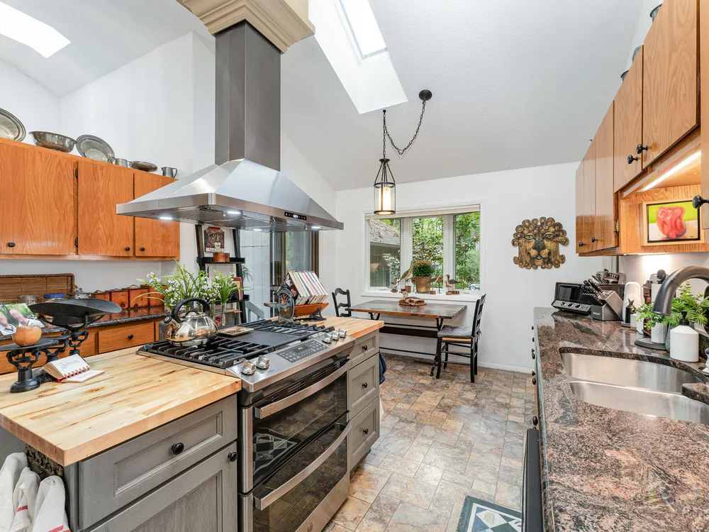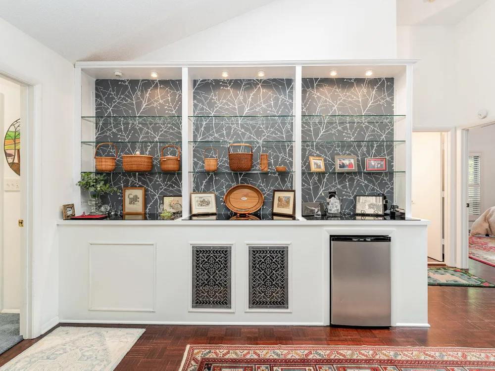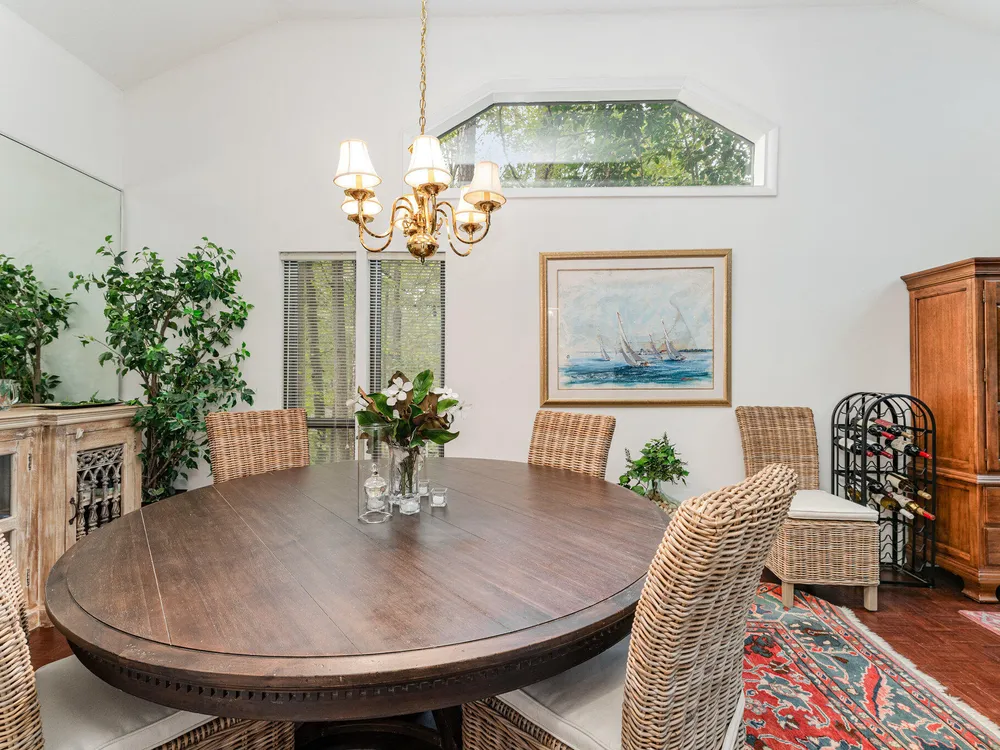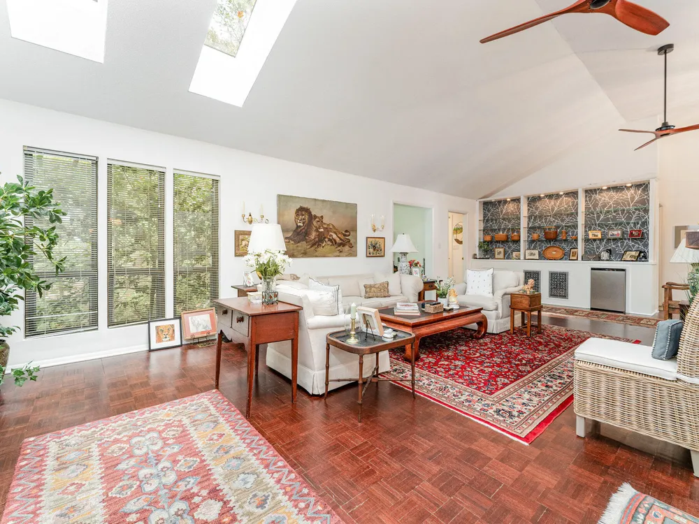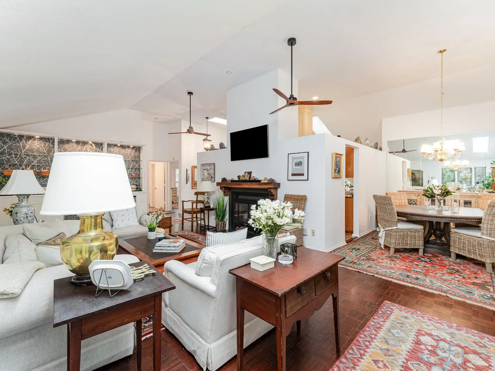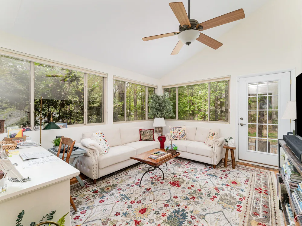 One-level contemporary home in the Fearrington Historic District! This home features an entry foyer that opens to a large living room with high ceilings, built-ins, a gas fireplace, and many windows with lovely, wooded views. There is a formal dining area plus a breakfast nook with a bay window in the kitchen. The spacious kitchen features an island and good counter and cabinet space. A laundry room with a freezer adjoins the kitchen. The primary bedroom has good closet space and a beautifully updated private bath with a tile shower. There are two additional bedrooms and another full bathroom. The sunroom has two walls with windows and a door that opens to a fenced area in the back yard. A covered walkway leads to the two-car garage with a storage room, workbench, skylight, and updated lighting. The covered front porch has phantom screen. Brick patio. Generator. Quiet, low-traffic cul-de-sac that is convenient to the village shops and swim club.