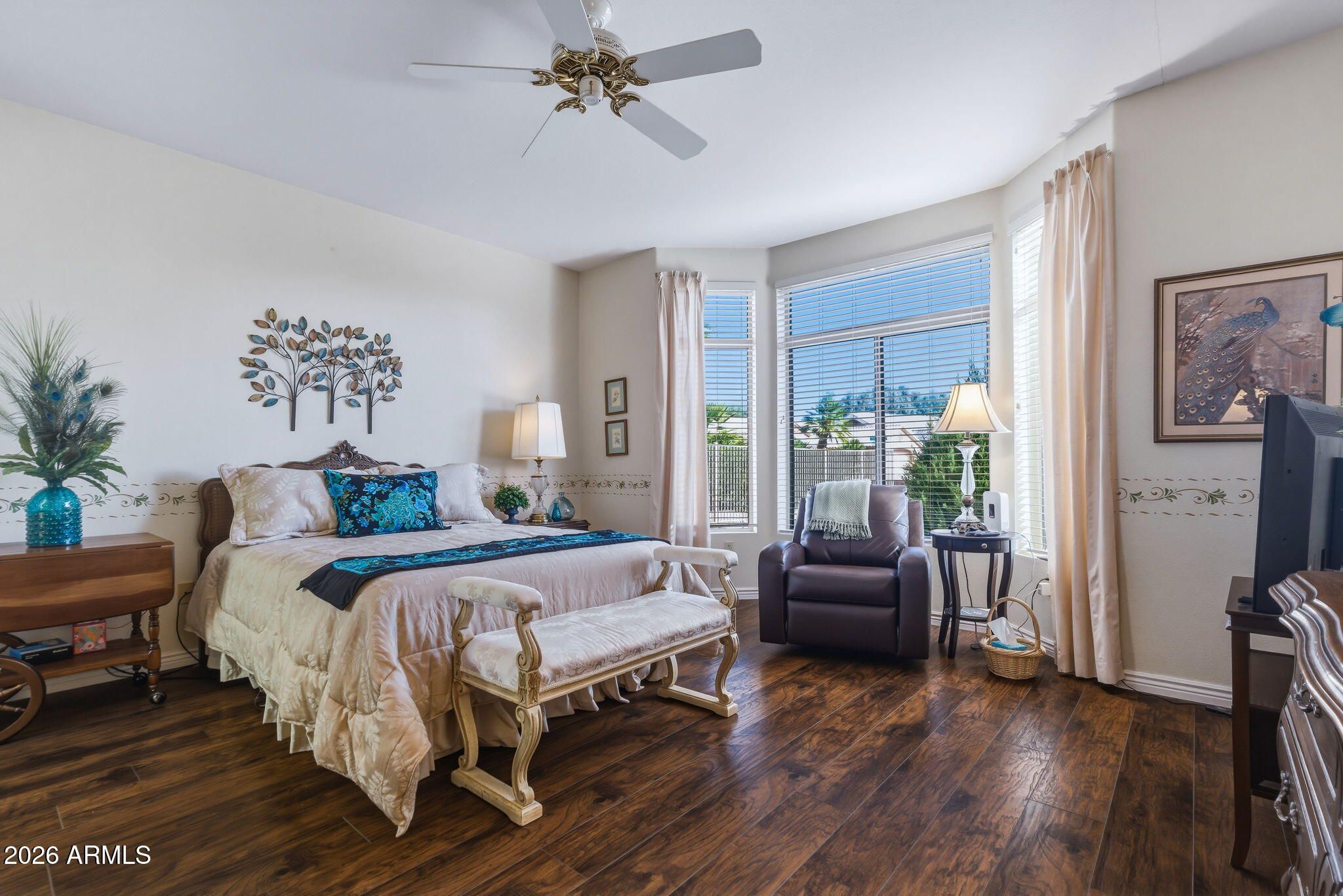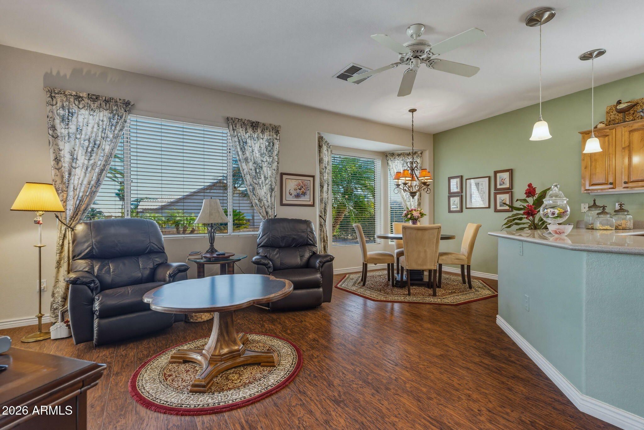 This lovely home has been well maintained and updated by the original owners! Wonderful curb appeal can bring you inside to see what could be better. The beautiful wood plank laminate flooring throughout, that's what! Wonderful floor plan has bedroom area to the left with large primary bedroom suite; and living room, dining room, kitchen and family room as well as office and garage to your right. The extra wide lot is highlighted with an inviting patio, partially covered, and a great place to enjoy the Arizona sunny days! Well-cared for plants and trees just tops it all off!