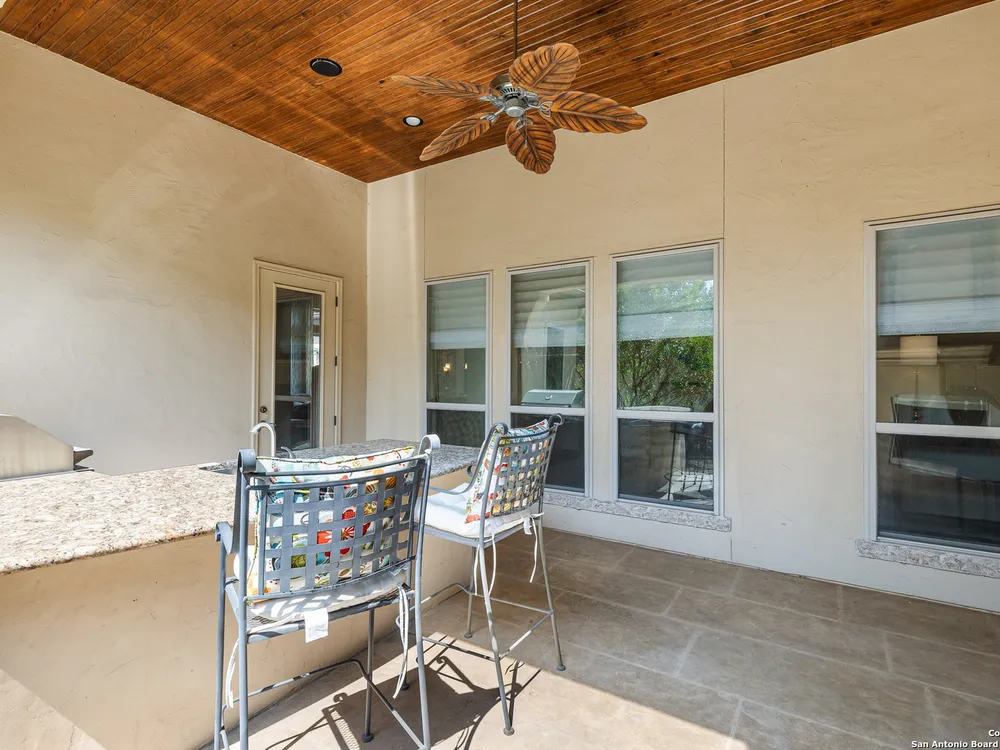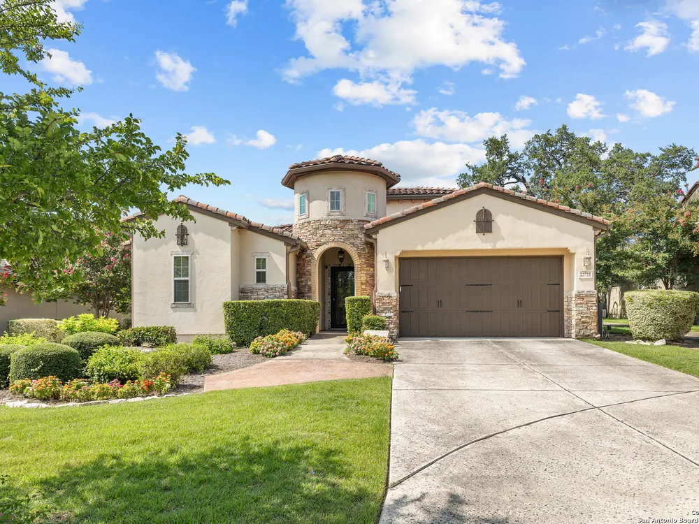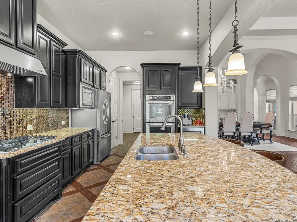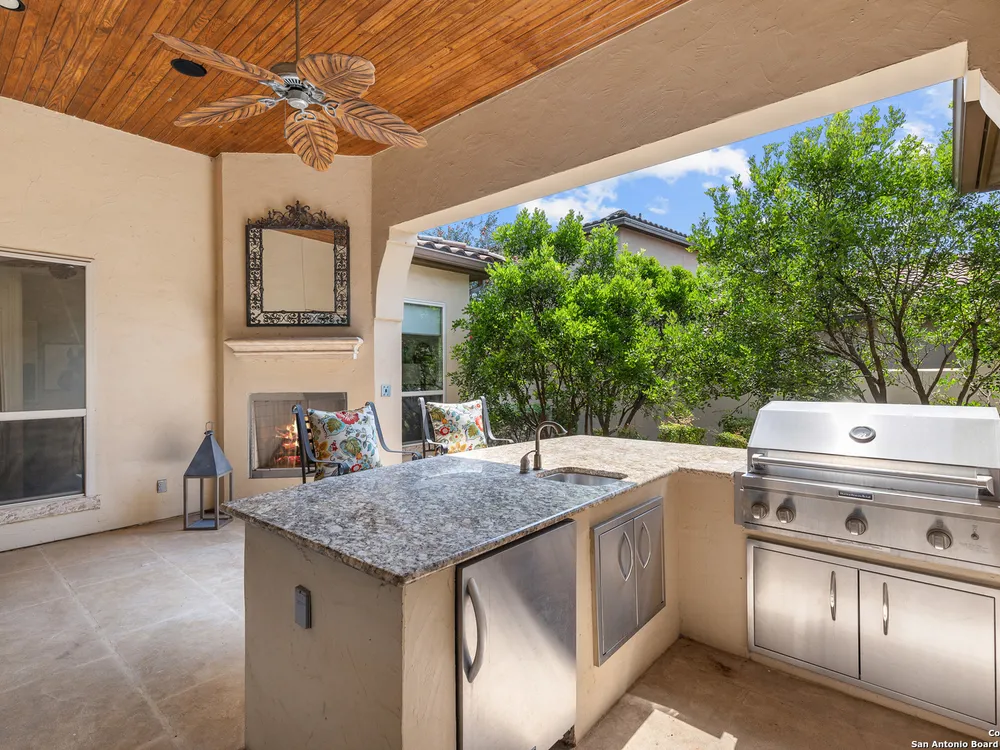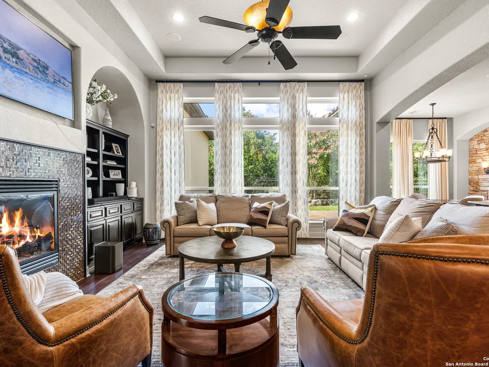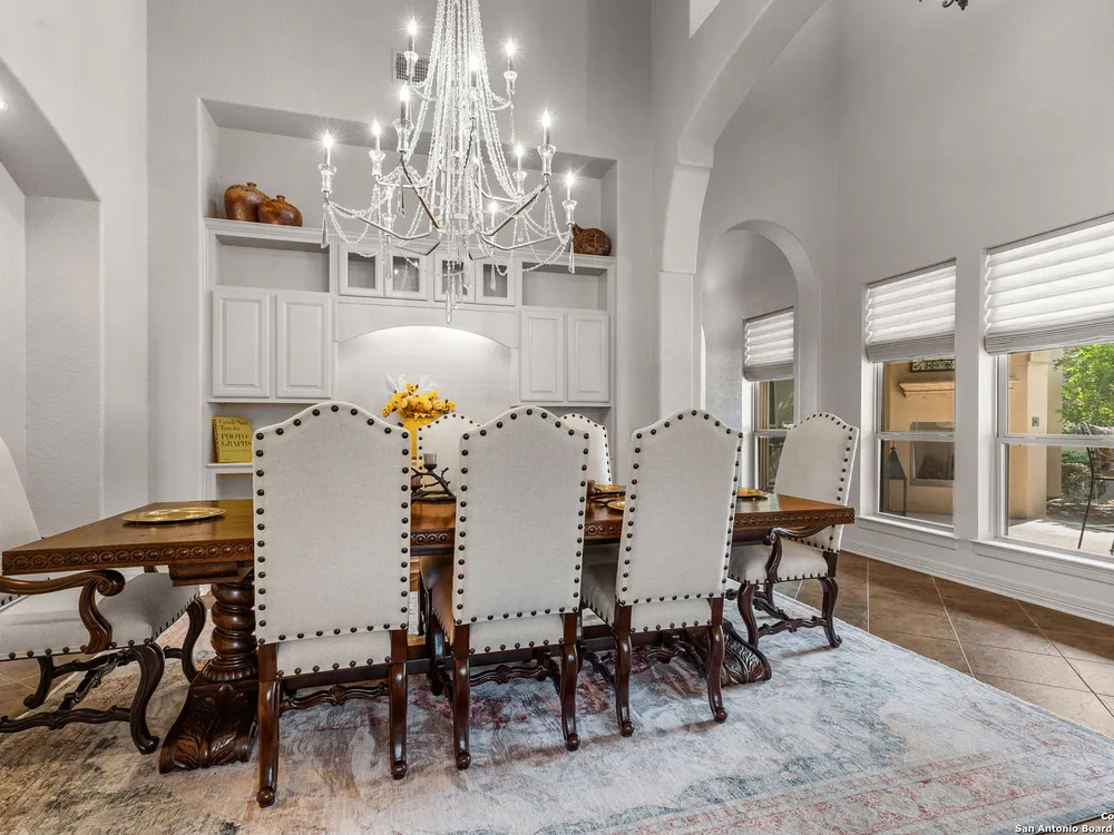 Tucked in a quiet cul-de-sac in the gated Campanas section of Cibolo Canyons, this elegant Mediterranean-style home offers two spacious primary suites plus a study that could serve as a third bedroom. With 2.5 baths and thoughtful updates throughout-including a show-stopping chandelier in the formal dining room-this one-story home is a must see! You'll find tile flooring throughout (carpet only in one bedroom), soaring ceilings, and custom built-ins in the dining room, study, and living area. The kitchen centers around a huge granite island, double ovens, gas cooktop, wine fridge, and generous storage. Just off the kitchen, a cozy breakfast nook with stone accent wall and large windows adds warmth and natural light. The private courtyard features a full outdoor kitchen with granite counters, grill, sink, fridge, and fireplace-perfect for entertaining. The backyard feels secluded thanks to lush landscaping, with a composite deck and gated access to walking trails. Don't Miss This One!