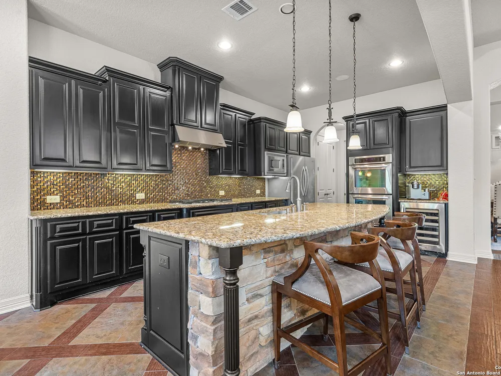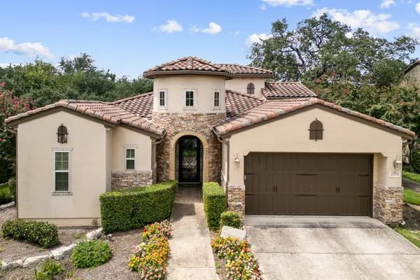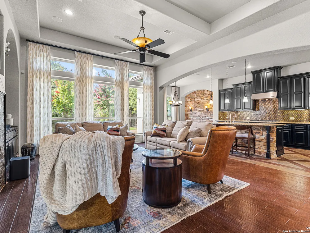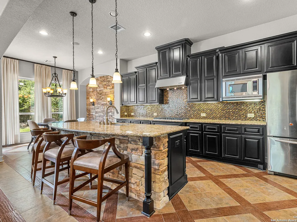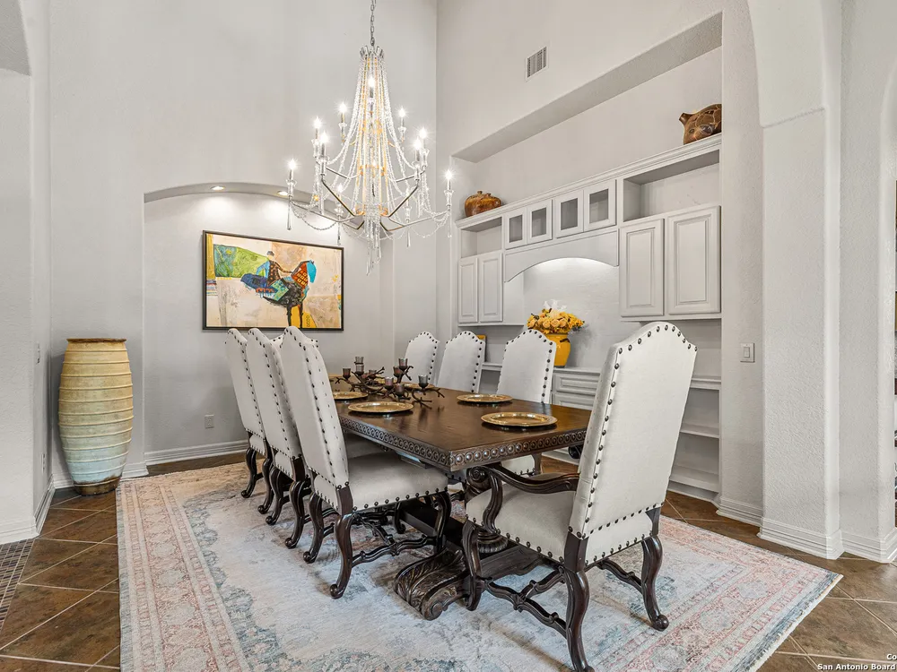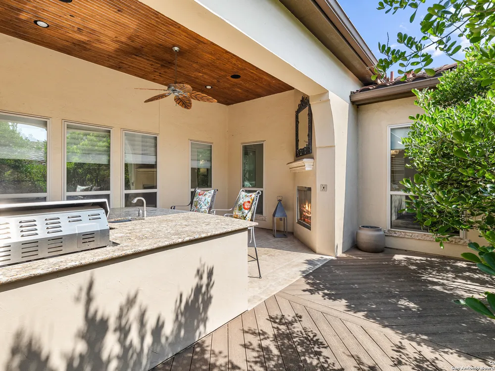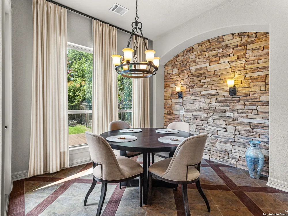 Tucked in a quiet cul-de-sac in the gated Campanas section of Cibolo Canyons, this elegant Mediterranean-style home offers two spacious primary suites plus a study that could serve as a third bedroom. With 2.5 baths and thoughtful updates throughout-including a show-stopping chandelier in the formal dining room-this one-story home is a must see! You'll find tile flooring throughout (carpet only in one bedroom), soaring ceilings, and custom built-ins in the dining room, study, and living area. The kitchen centers around a huge granite island, double ovens, gas cooktop, wine fridge, and generous storage. Just off the kitchen, a cozy breakfast nook with stone accent wall and large windows adds warmth and natural light. The private courtyard features a full outdoor kitchen with granite counters, grill, sink, fridge, and fireplace-perfect for entertaining. The backyard feels secluded thanks to lush landscaping, with a composite deck and gated access to walking trails. Don't Miss This One!