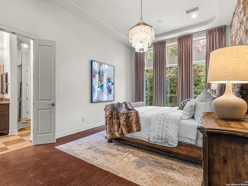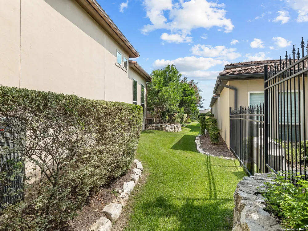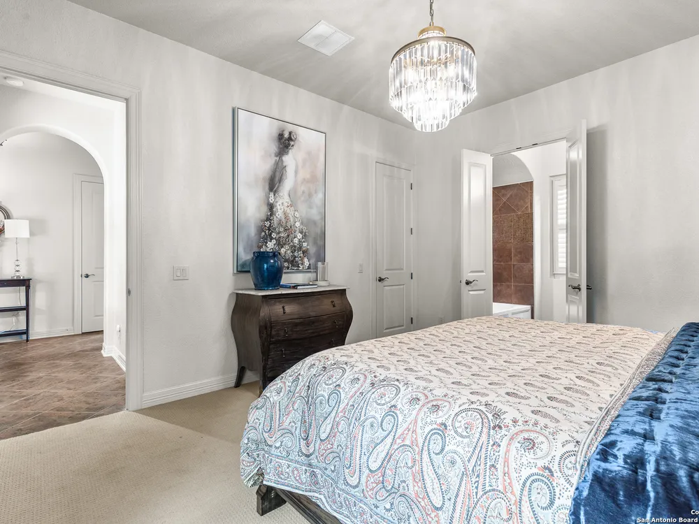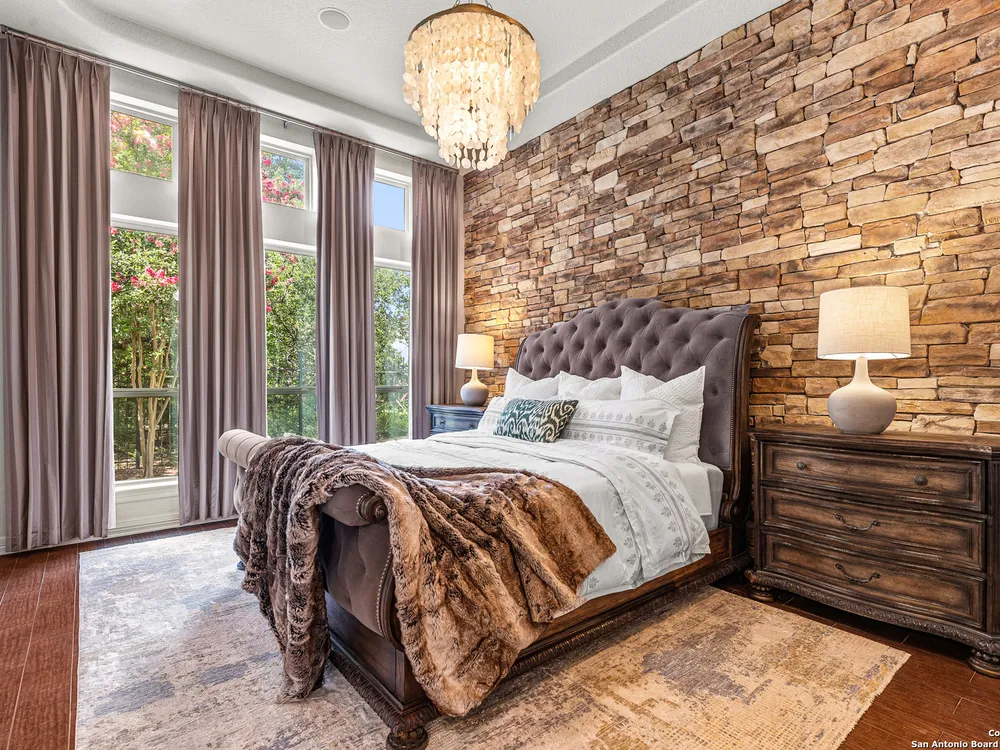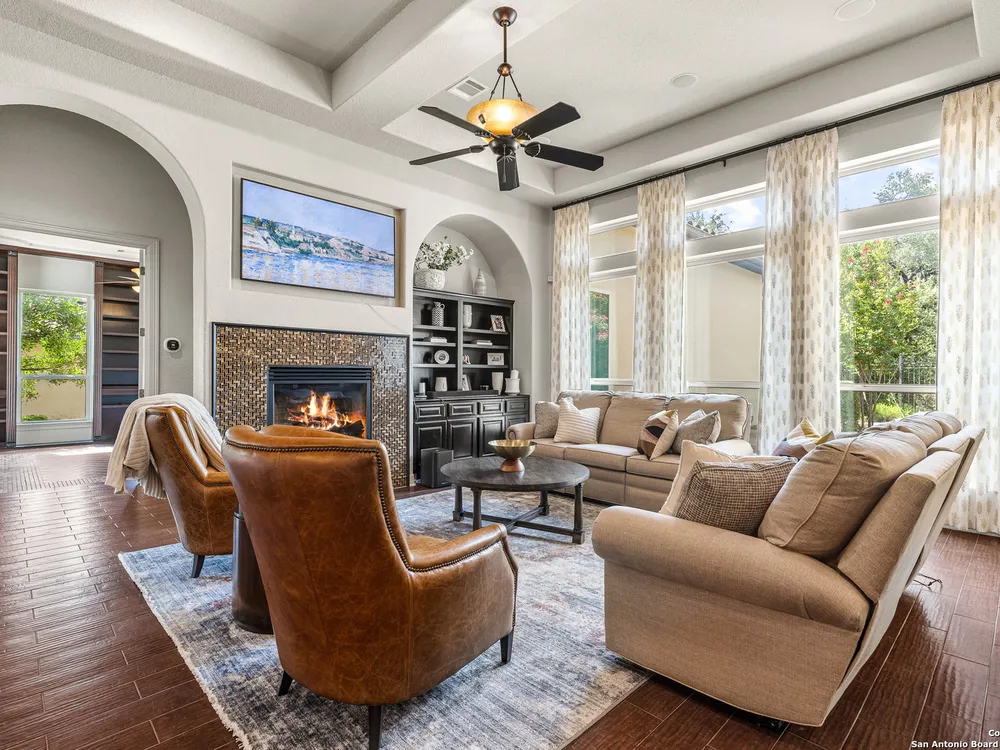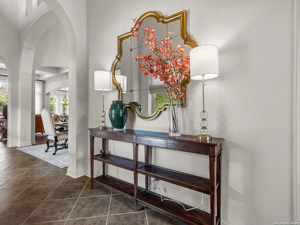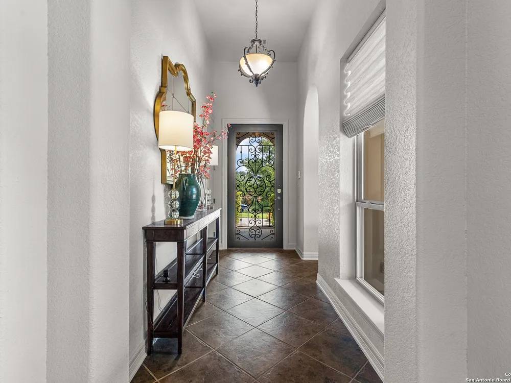 Tucked in a quiet cul-de-sac in the gated Campanas section of Cibolo Canyons, this elegant Mediterranean-style home offers two spacious primary suites plus a study that could serve as a third bedroom. With 2.5 baths and thoughtful updates throughout-including a show-stopping chandelier in the formal dining room-this one-story home is a must see! You'll find tile flooring throughout (carpet only in one bedroom), soaring ceilings, and custom built-ins in the dining room, study, and living area. The kitchen centers around a huge granite island, double ovens, gas cooktop, wine fridge, and generous storage. Just off the kitchen, a cozy breakfast nook with stone accent wall and large windows adds warmth and natural light. The private courtyard features a full outdoor kitchen with granite counters, grill, sink, fridge, and fireplace-perfect for entertaining. The backyard feels secluded thanks to lush landscaping, with a composite deck and gated access to walking trails. Don't Miss This One!
