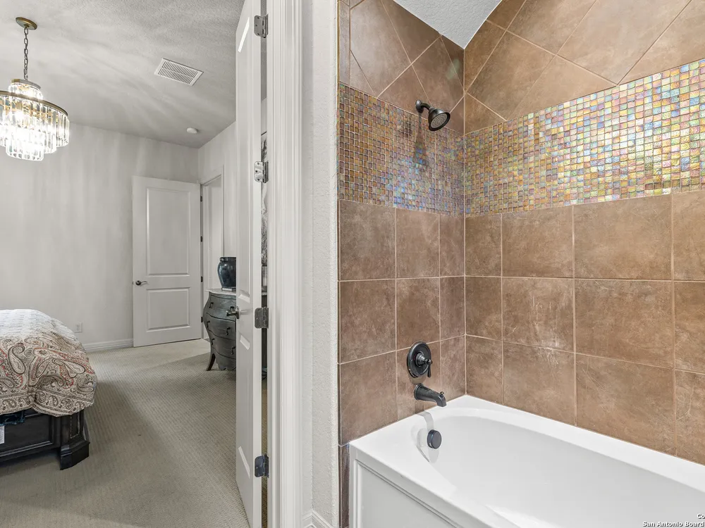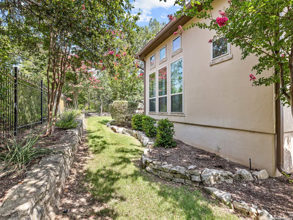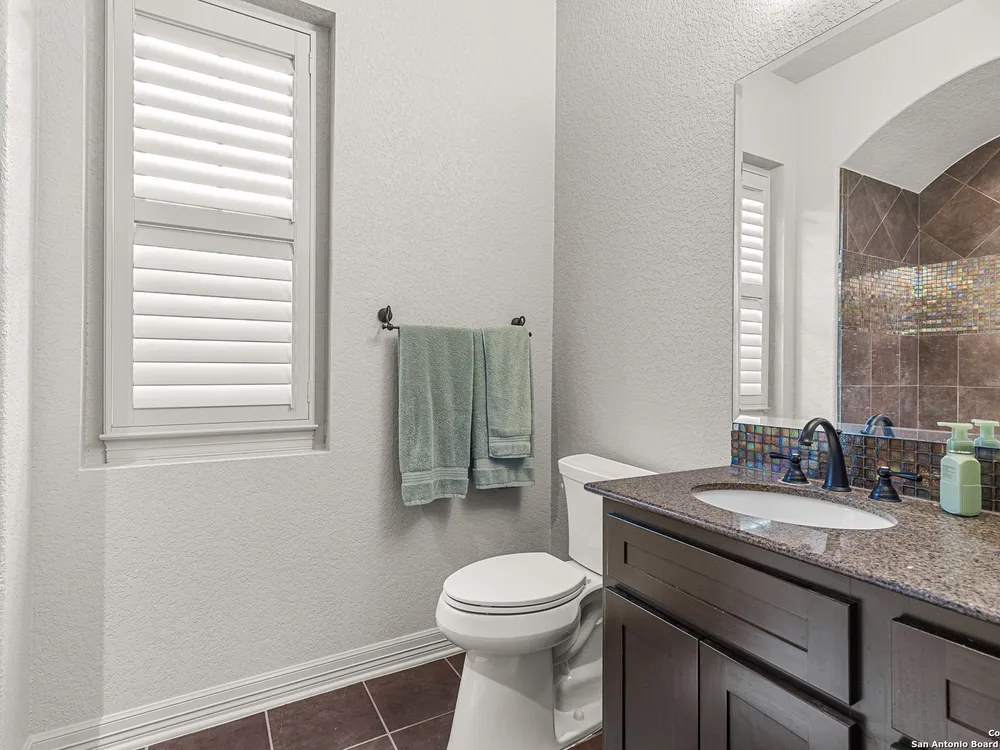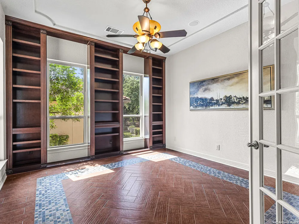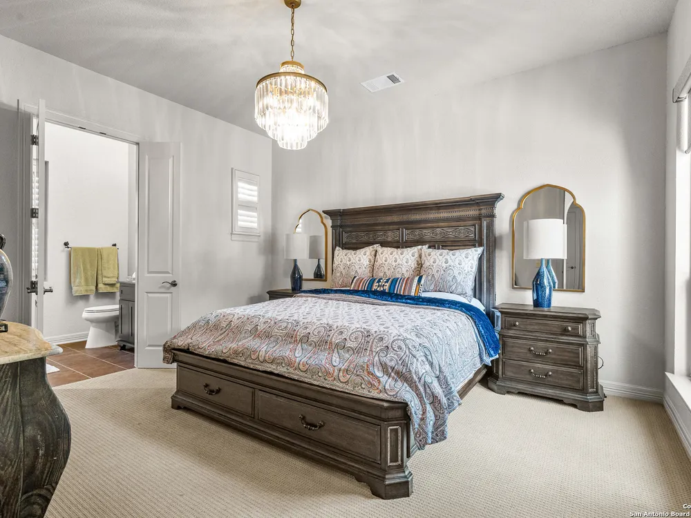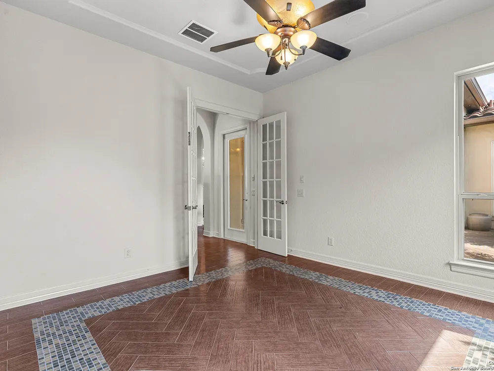 Tucked in a quiet cul-de-sac in the gated Campanas section of Cibolo Canyons, this elegant Mediterranean-style home offers two spacious primary suites plus a study that could serve as a third bedroom. With 2.5 baths and thoughtful updates throughout-including a show-stopping chandelier in the formal dining room-this one-story home is a must see! You'll find tile flooring throughout (carpet only in one bedroom), soaring ceilings, and custom built-ins in the dining room, study, and living area. The kitchen centers around a huge granite island, double ovens, gas cooktop, wine fridge, and generous storage. Just off the kitchen, a cozy breakfast nook with stone accent wall and large windows adds warmth and natural light. The private courtyard features a full outdoor kitchen with granite counters, grill, sink, fridge, and fireplace-perfect for entertaining. The backyard feels secluded thanks to lush landscaping, with a composite deck and gated access to walking trails. Don't Miss This One!