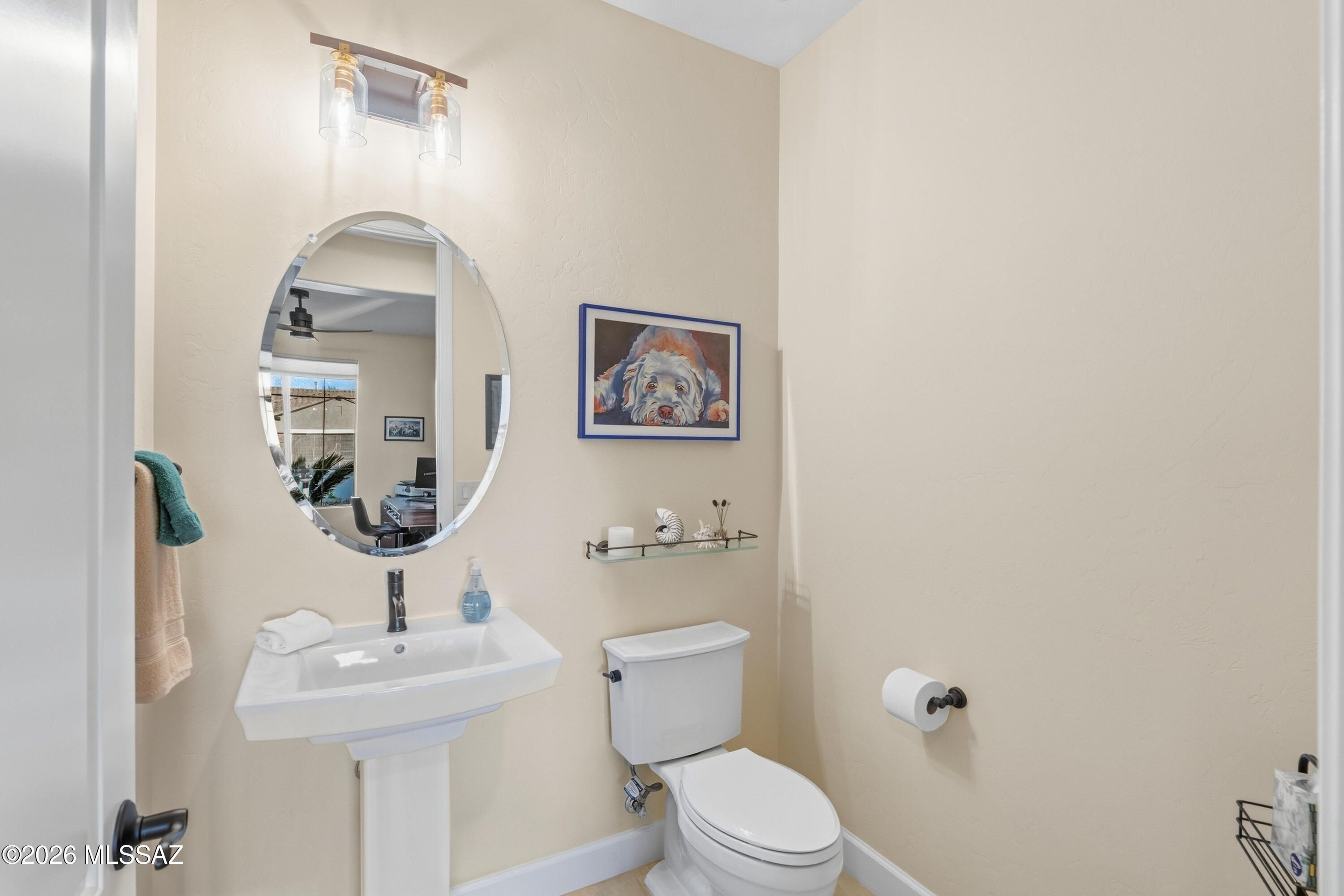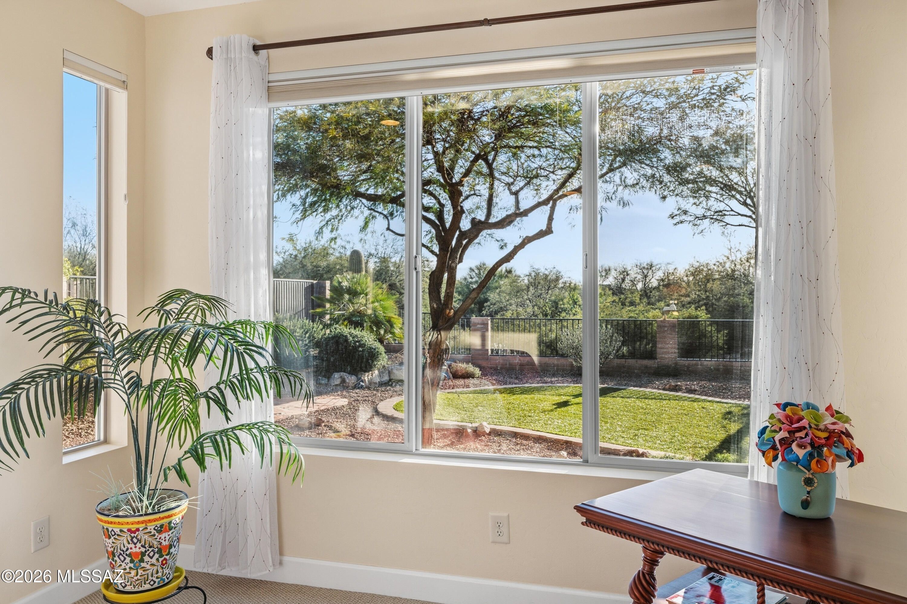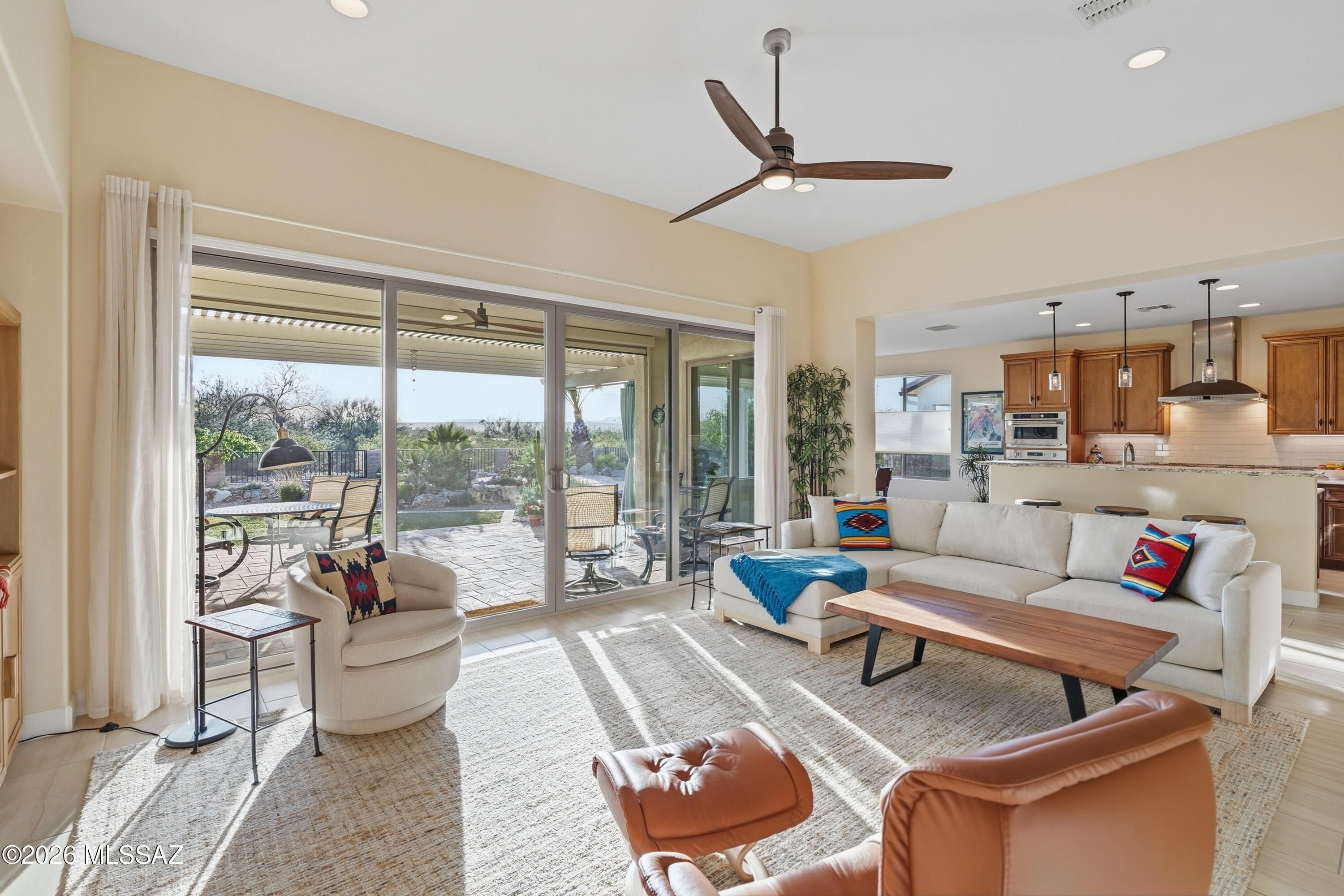 Located in sought-after Quail Creek resort community, this beautifully appointed 2018 Treviso model offers 2 bedrooms, 2.5 baths, plus a den, combining privacy, luxury, and breathtaking views. Ideally positioned backing to vast natural desert, the home captures panoramic desert and mountain views along with spectacular Arizona sunsets. Enter through a gated front courtyard with an inviting seating area, perfect for morning coffee or welcoming guests. A beautiful wood door opens to a welcoming entry foyer. Beyond, the spacious great room features a dramatic 4-panel center sliding glass door that fills the room with natural light and seamlessly connects indoor and outdoor living, opening to the covered patio and professionally landscaped backyard. Tile flooring enhances all common areas.