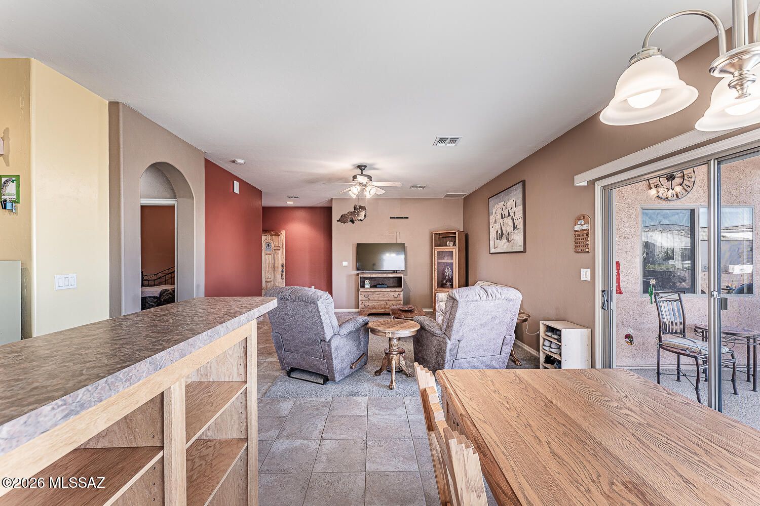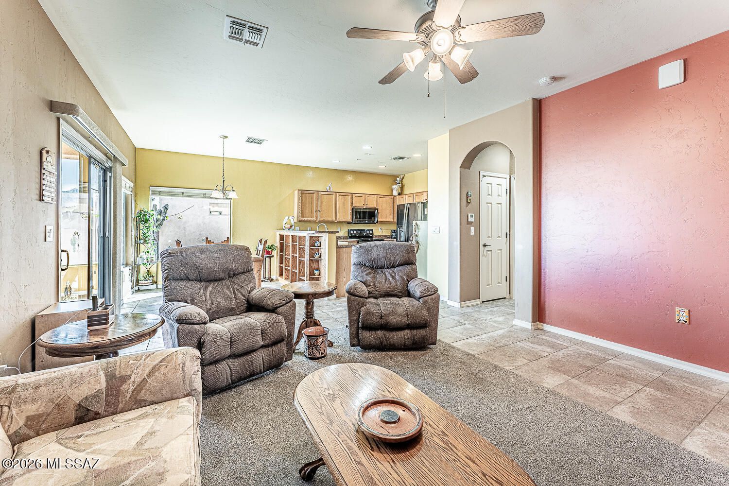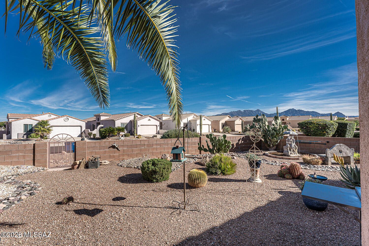 Charming Legend's Home with views of the Santa Rita Mountains, 2 bedrooms, 2 baths, an office and a large 2 car garage, so many great features like tile flooring/carpet flooring, ceiling fans, extra interior cabinets, stainless appliances, mini split AC in the garage. HVAC was replaced in 2020, hot water heater was replaced in 2021, and the roof underlayment has been replaced. The backyard spa and fountain will be included in the home sale. This home has been well maintained. Maust See