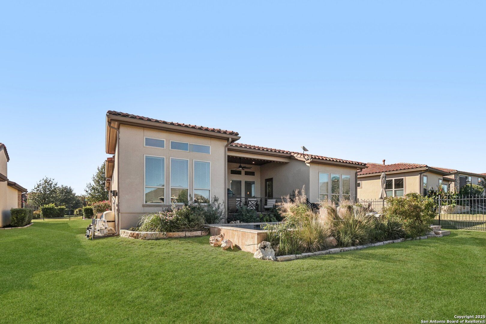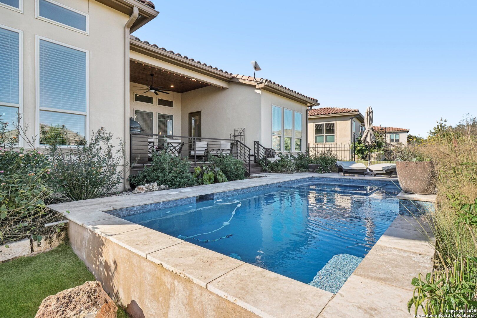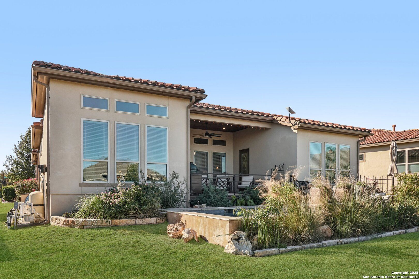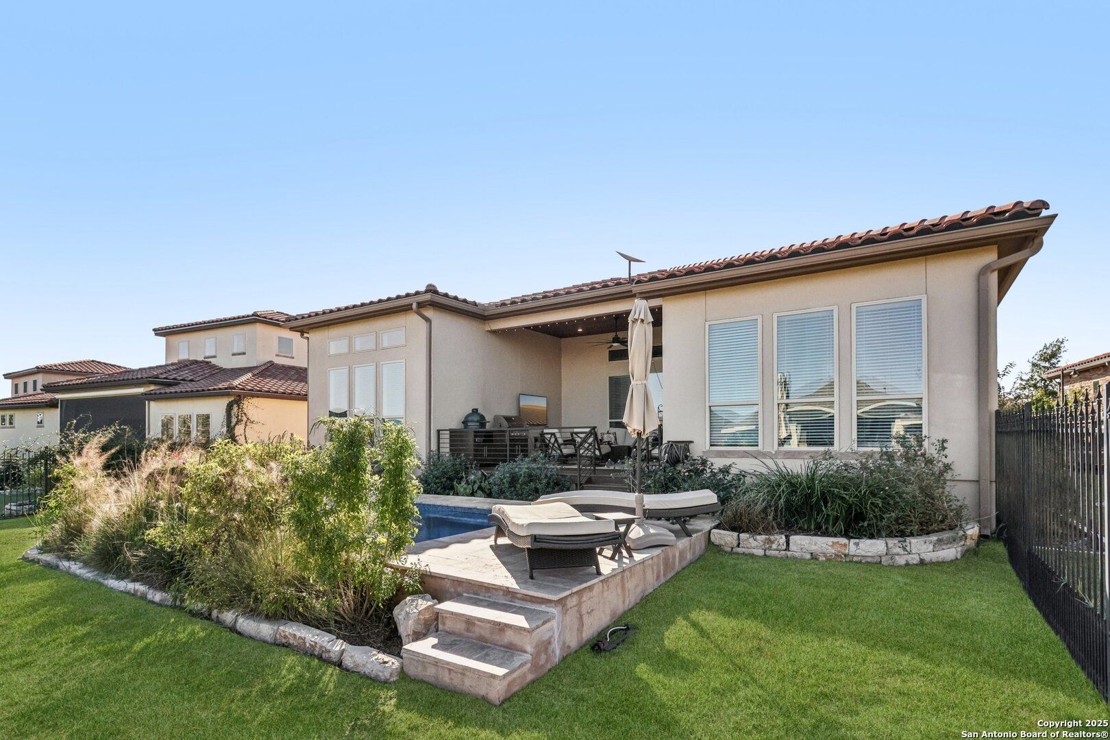 Single-story Sitterle garden home located in the gated Campanas at Cibolo Canyons community. This open-concept residence includes 3 bedrooms, 3.5 bathrooms, and a private study, designed for efficient single-level living. The kitchen features granite countertops, gas cooking, double ovens, and ample cabinet storage. The primary suite offers a spa-style bathroom with a separate shower, a garden tub, and dual vanities. Living areas include abundant windows for natural light and a gas fireplace. Outdoor living spaces include a patio, courtyard, and a covered patio overlooking an in-ground heated pool and spa. Community amenities include a clubhouse, fitness center, and three community pools, with convenient proximity to shopping, dining, and golf.