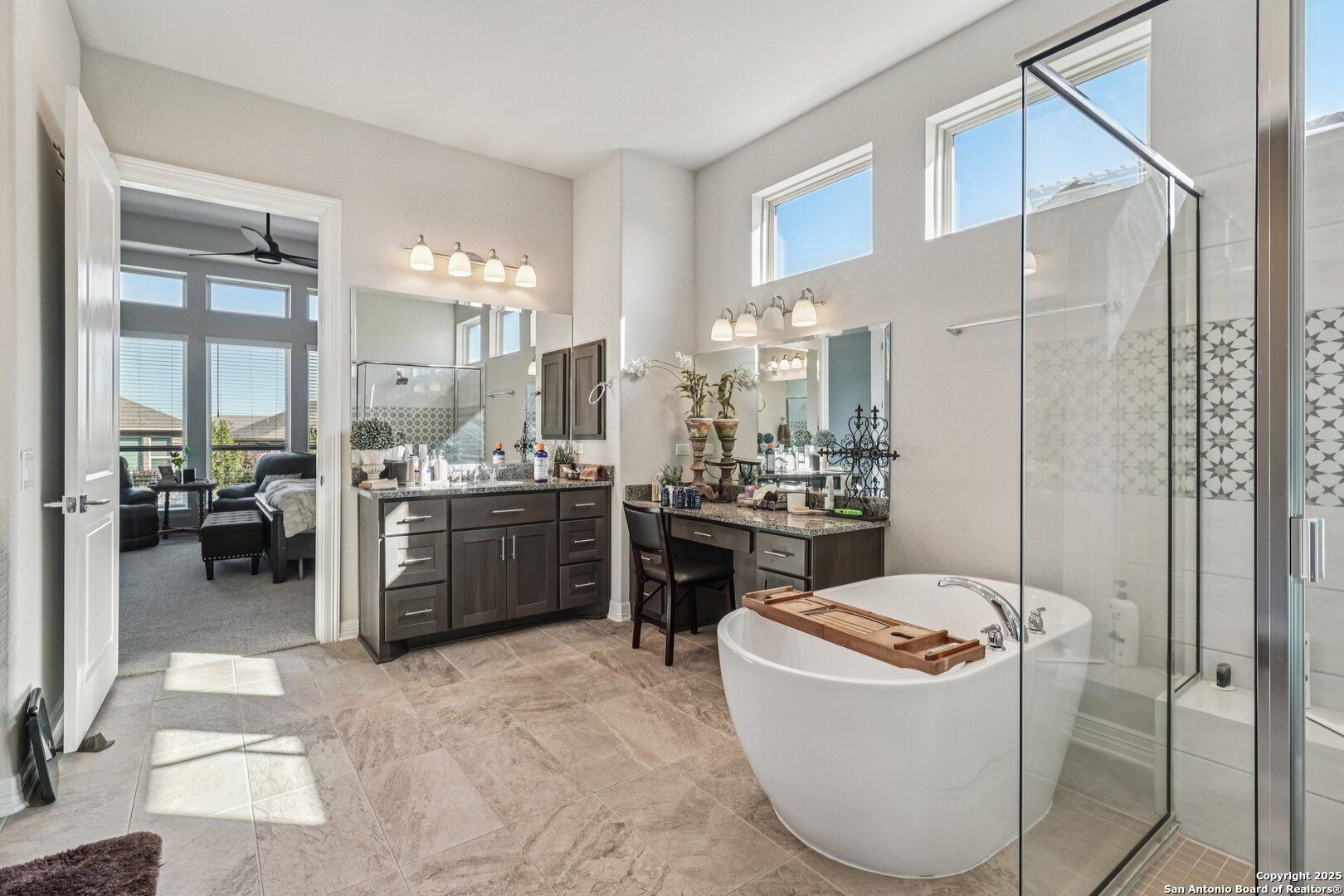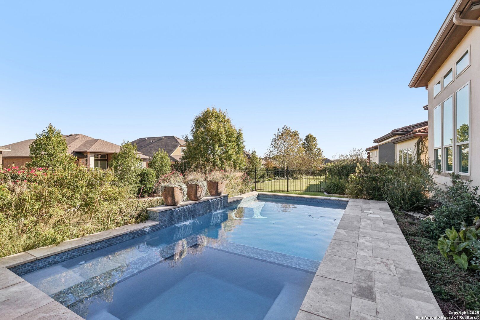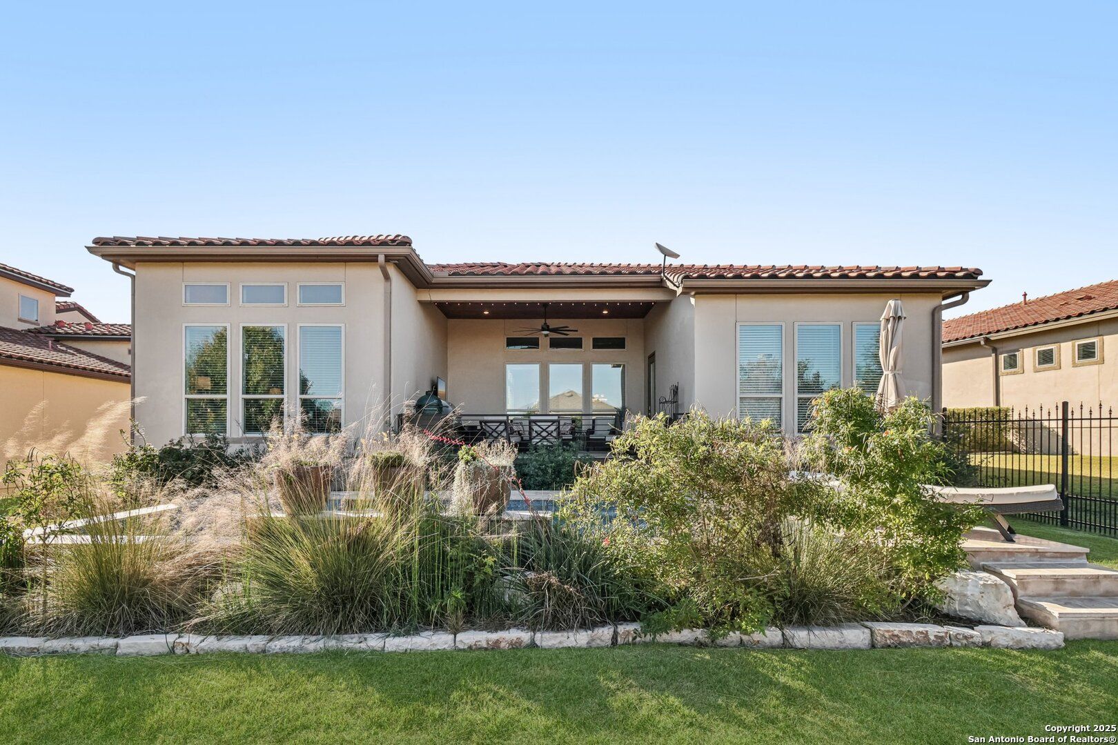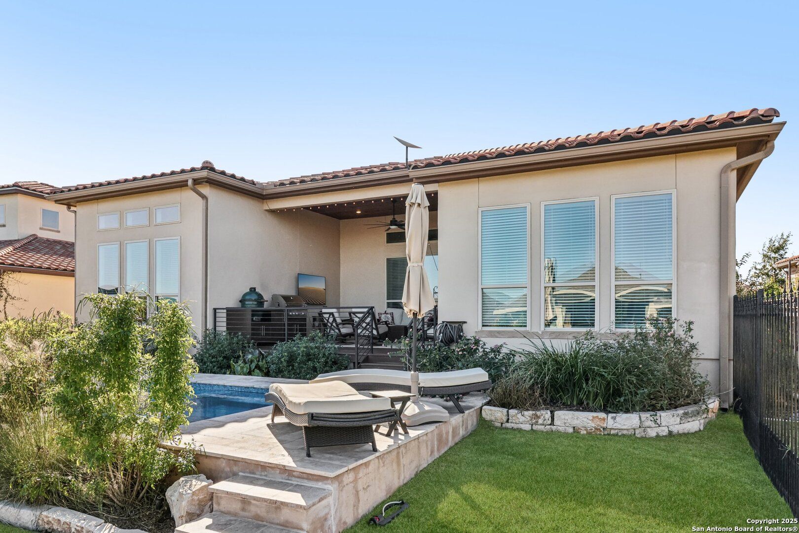 Single-story Sitterle garden home located in the gated Campanas at Cibolo Canyons community. This open-concept residence includes 3 bedrooms, 3.5 bathrooms, and a private study, designed for efficient single-level living. The kitchen features granite countertops, gas cooking, double ovens, and ample cabinet storage. The primary suite offers a spa-style bathroom with a separate shower, a garden tub, and dual vanities. Living areas include abundant windows for natural light and a gas fireplace. Outdoor living spaces include a patio, courtyard, and a covered patio overlooking an in-ground heated pool and spa. Community amenities include a clubhouse, fitness center, and three community pools, with convenient proximity to shopping, dining, and golf.