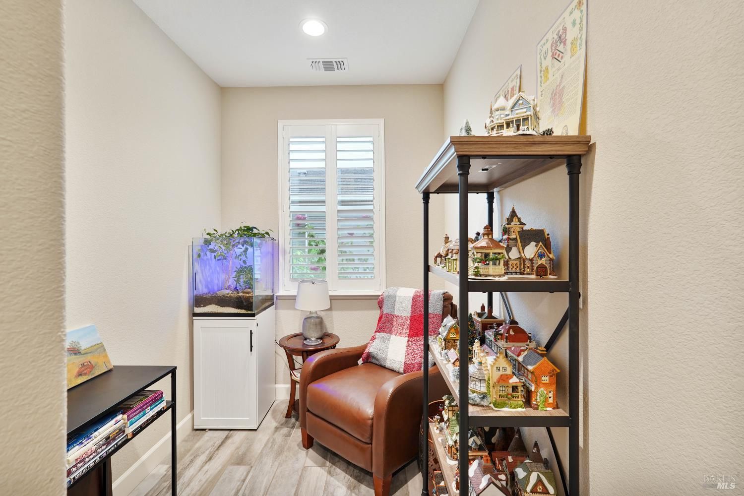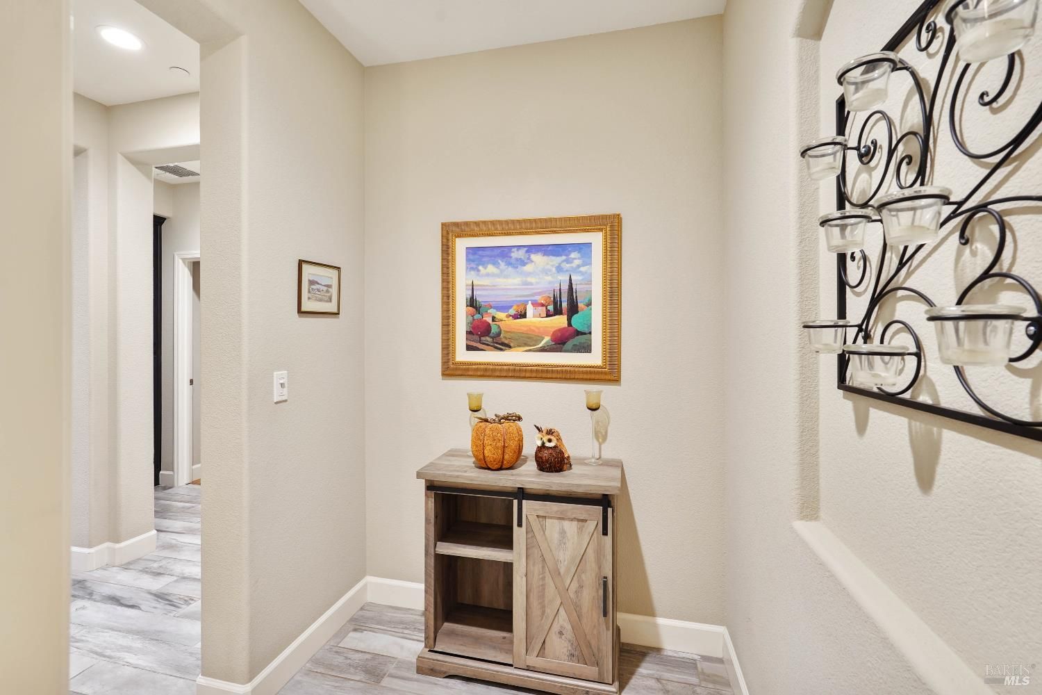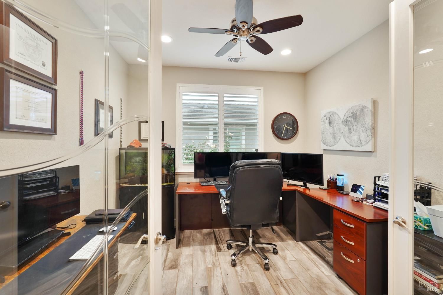 Built in 2017 this Rejuvenate model home in California's Delta Region has over 116k in upgrades. Features include attractive tile plank flooring in the main living areas and baths with beautiful vinyl plank flooring in the beds, espresso-stained cabinetry and plantation shutters throughout, den with patterned glass French doors, a flex room, and huge laundry with extra cabinetry and utility sink. The kitchen boasts the premium gourmet upgrade with soft-close cabinets and drawers, quartz countertops with stylish full tile backsplash, and GE stainless appliances. Both baths feature engineered marble counters and master shower surround, rectangular undermount sinks, and the master closet has a laundry access door. Relax outdoors on the huge fully fenced covered patio with gated access from both sides in a lush private setting. Includes built-in fire suppression system and extra garage storage cabinetry. This beautiful home is located near the community's Serenity Park. Trilogy is a 55+ community with numerous clubs and activies. Enjoy the indoor and outdoor pools, tennis and pickleball courts, Bocce and so much more. Solar lease is prepaid until 2037.