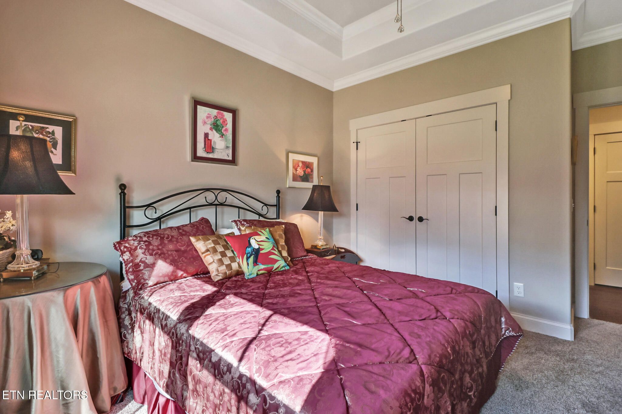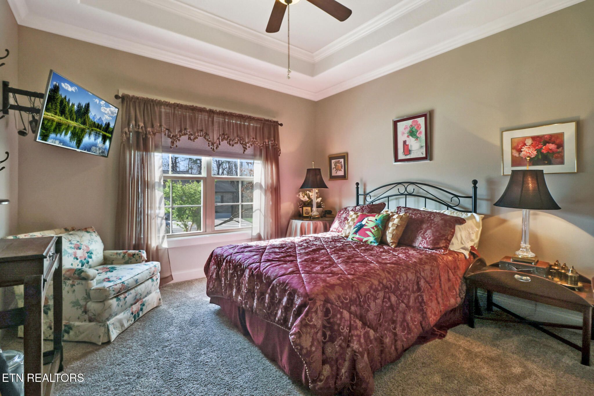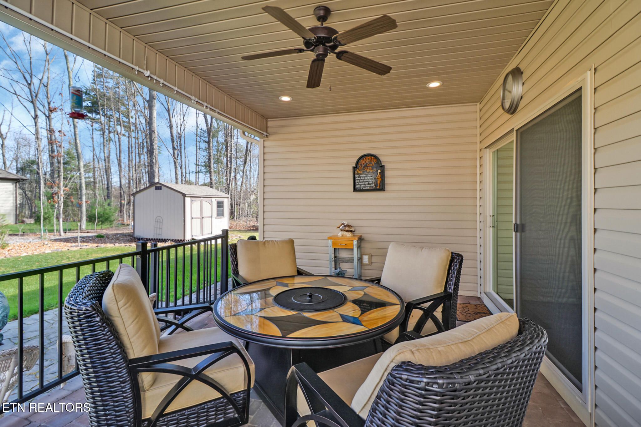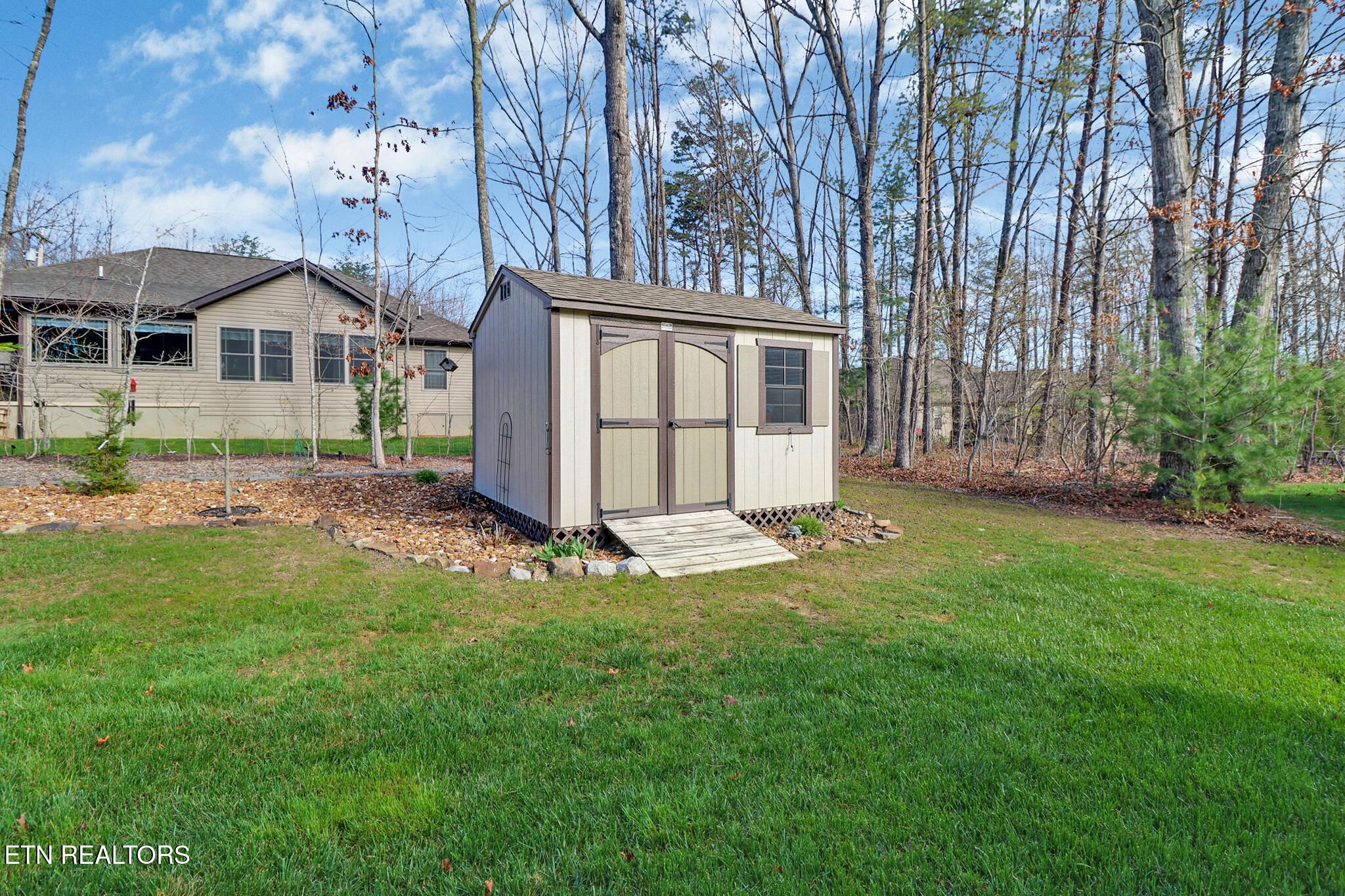 Lovely home with many upgrades throughout. Great room features a coffered ceiling, crown molding, built-ins, 2 transom windows, and natural gas log fireplace. Kitchen has a large walk-in pantry, antique white glazed cabinetry, granite countertops, tile backsplash, 9' island/breakfast bar, and extras like spice drawers and double trash drawer. Owners' suite has large walk-in closet, trey ceiling, step in shower with frameless glass, and granite counter with 2 sinks. Popular split bedroom floorplan. Guest bedroom and guest bath can be even more private when separated from the rest of the house simply by closing the sliding barn door. 11'x17' covered deck with pavers has ceiling fan, indirect lights, and railing. Large laundry room with antique white glazed cabinets. 11.5' x 14' open patio space with Crab Orchard Stone. Storage shed 10'x12' with electric, a ramp and double doors. Buyer to verify all information before making an informed offer. Fairfield Glade charges a $6,000 amenity fee to buyer at closing.
