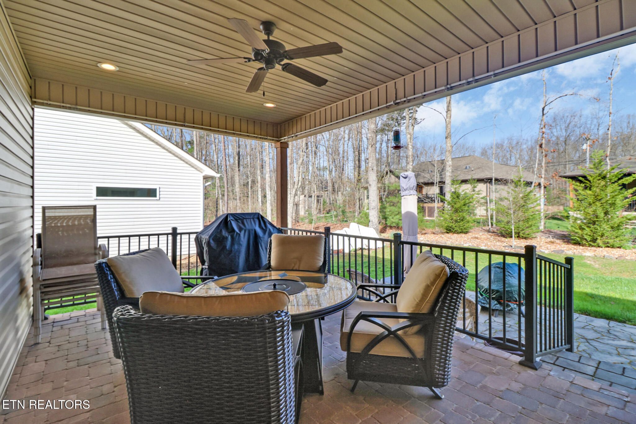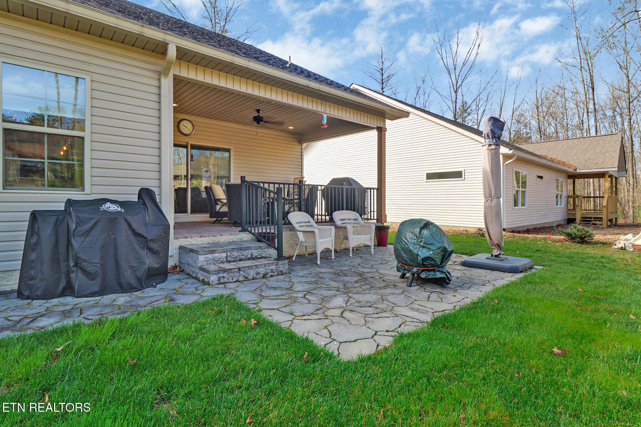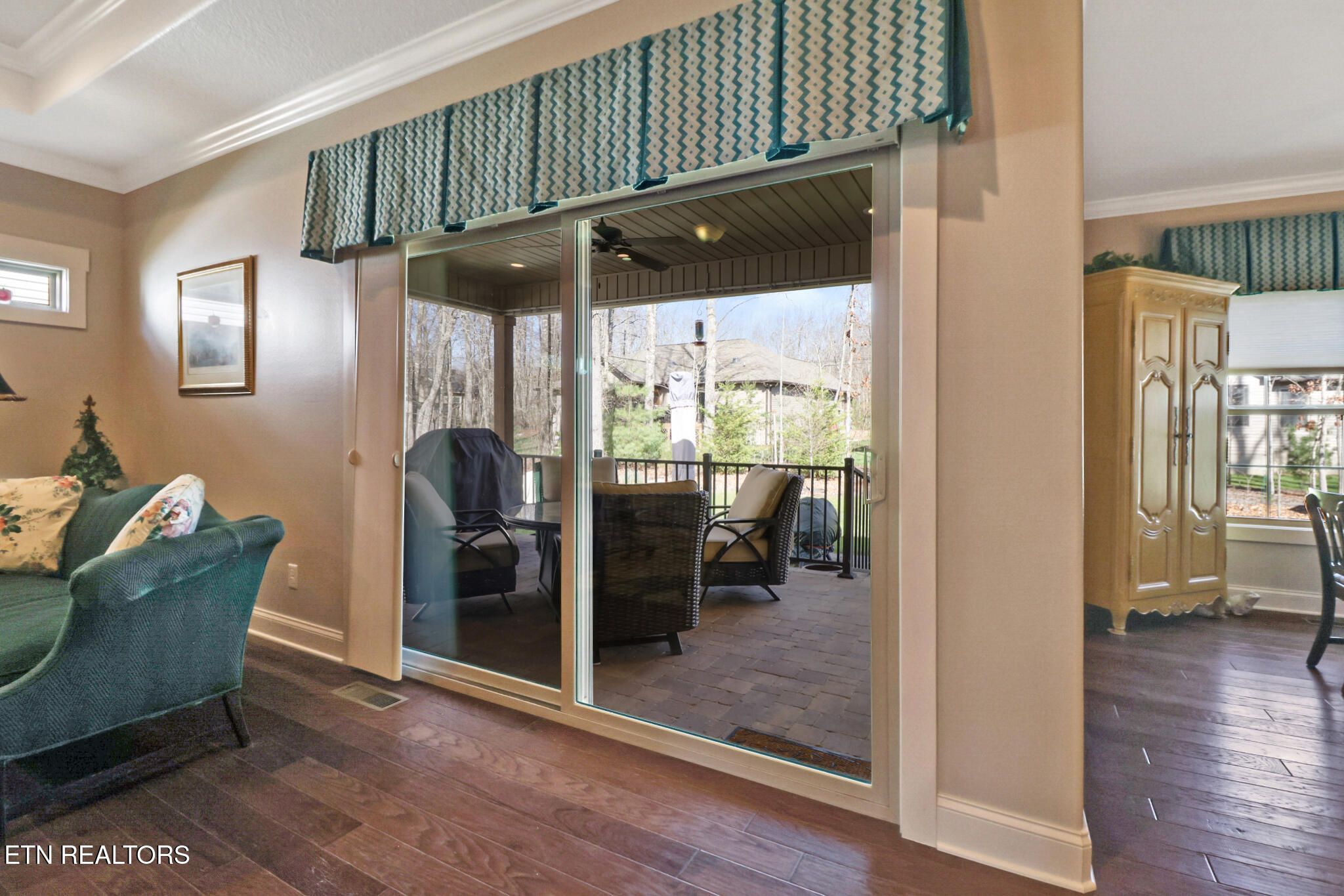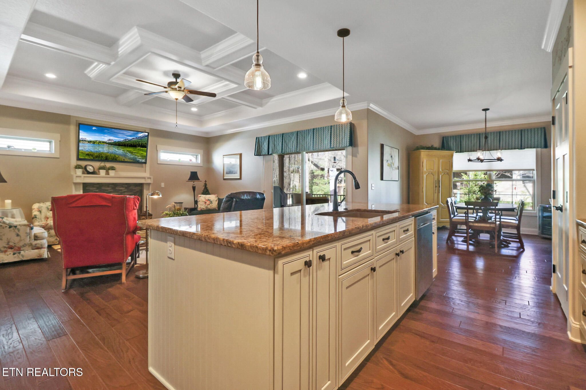 Lovely home with many upgrades throughout. Great room features a coffered ceiling, crown molding, built-ins, 2 transom windows, and natural gas log fireplace. Kitchen has a large walk-in pantry, antique white glazed cabinetry, granite countertops, tile backsplash, 9' island/breakfast bar, and extras like spice drawers and double trash drawer. Owners' suite has large walk-in closet, trey ceiling, step in shower with frameless glass, and granite counter with 2 sinks. Popular split bedroom floorplan. Guest bedroom and guest bath can be even more private when separated from the rest of the house simply by closing the sliding barn door. 11'x17' covered deck with pavers has ceiling fan, indirect lights, and railing. Large laundry room with antique white glazed cabinets. 11.5' x 14' open patio space with Crab Orchard Stone. Storage shed 10'x12' with electric, a ramp and double doors. Buyer to verify all information before making an informed offer. Fairfield Glade charges a $6,000 amenity fee to buyer at closing.