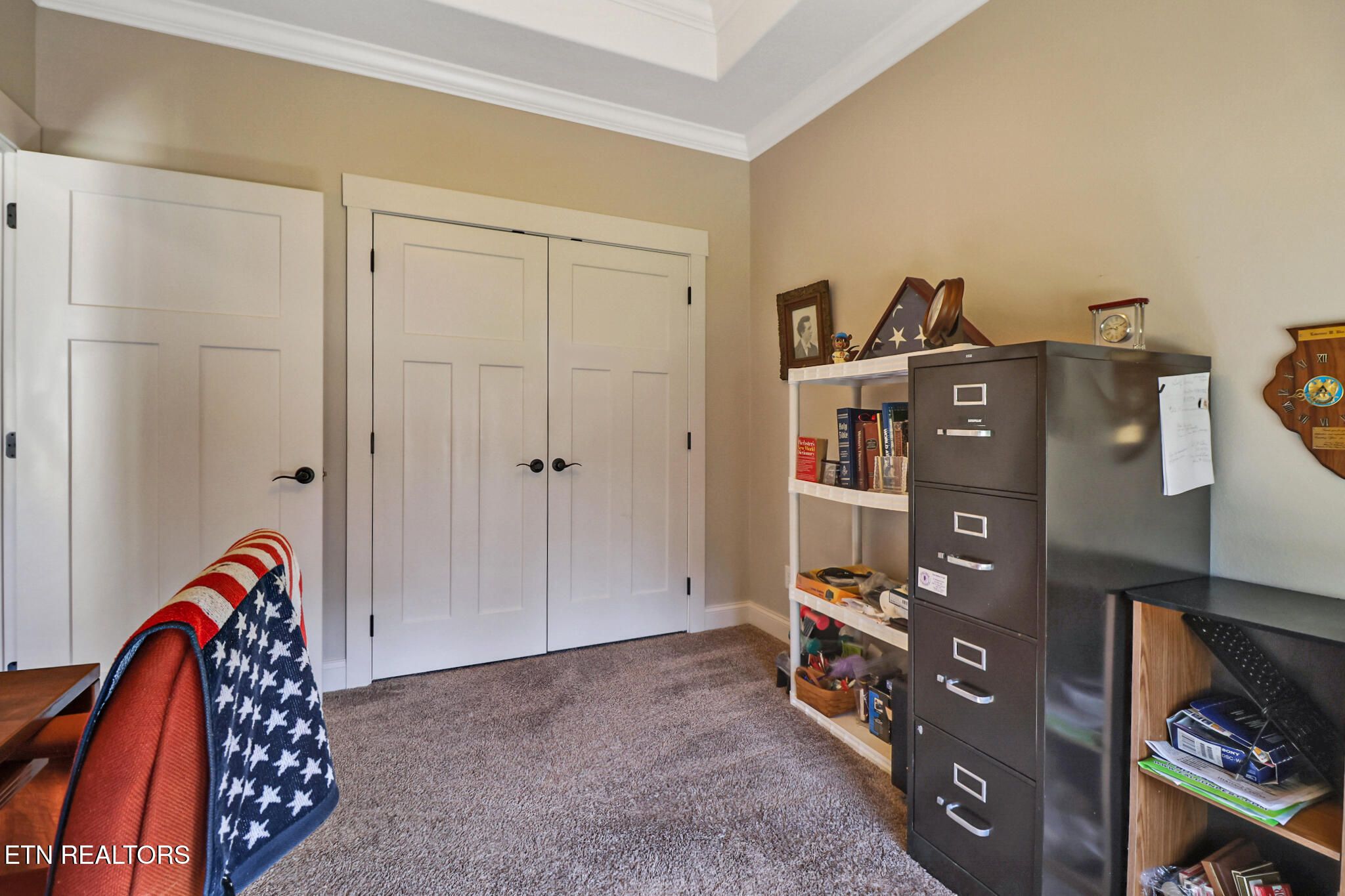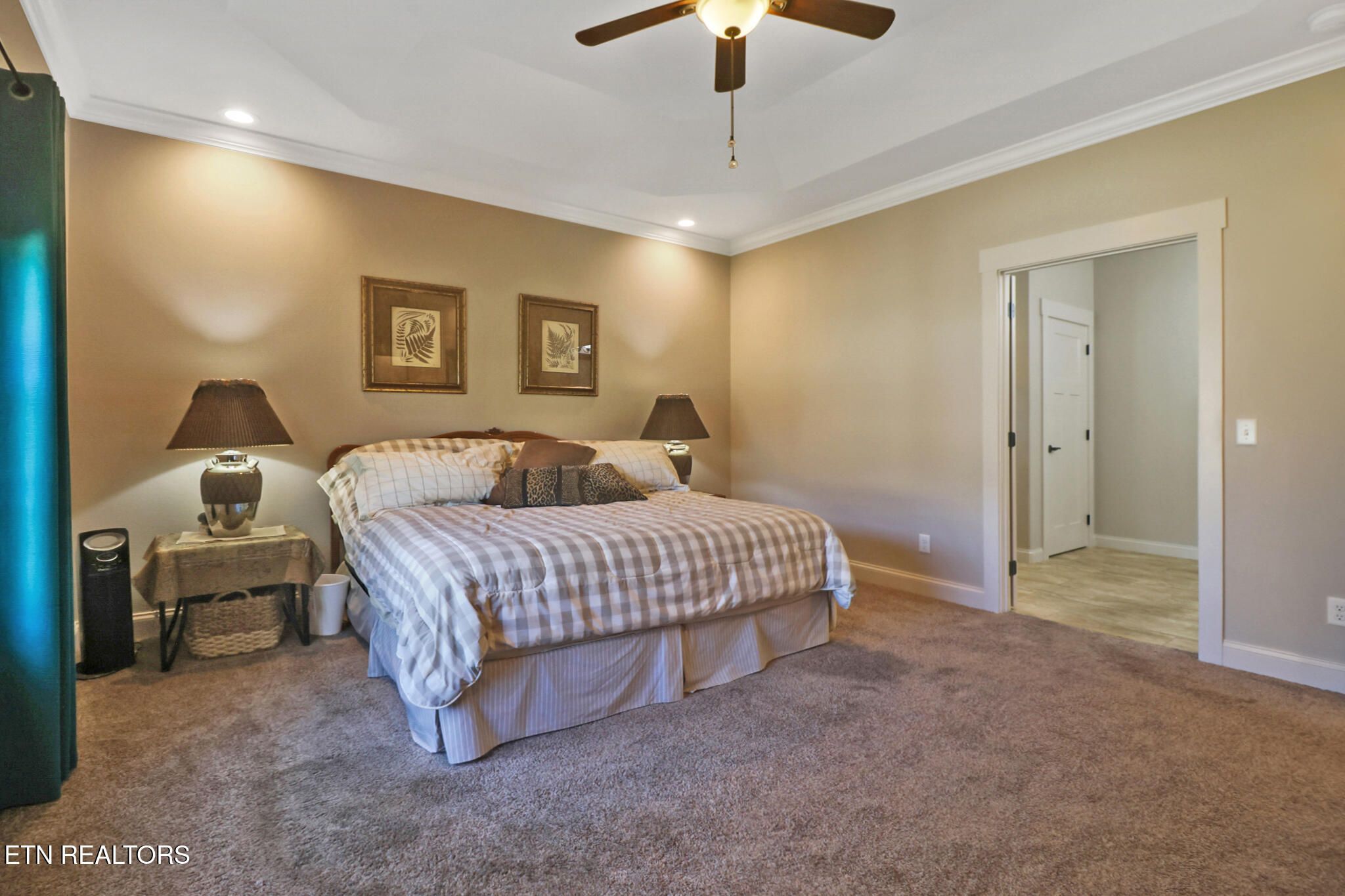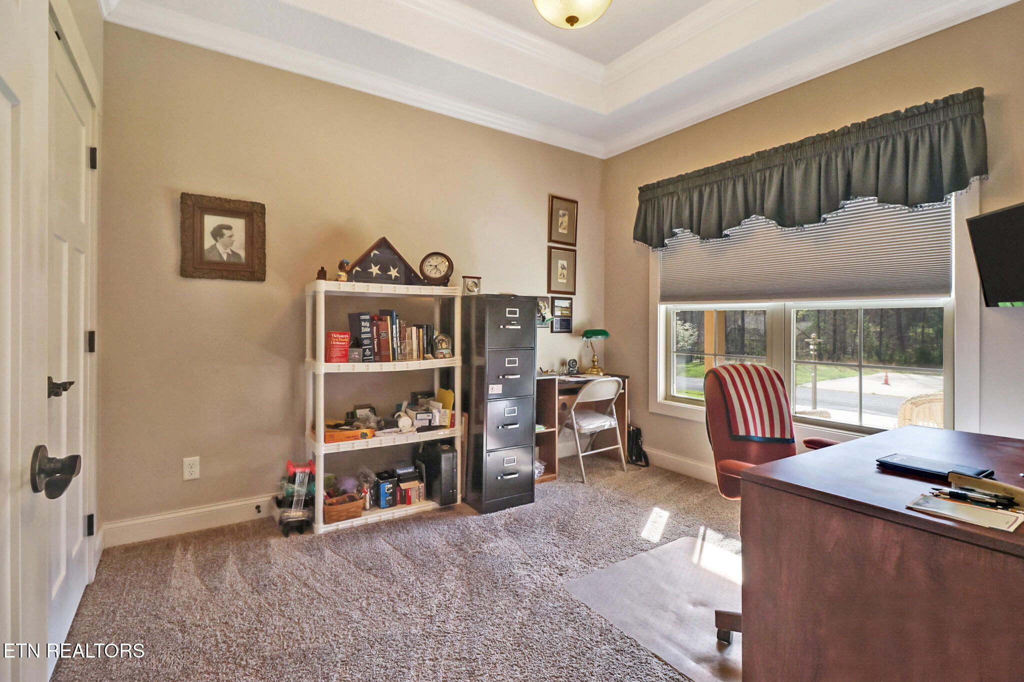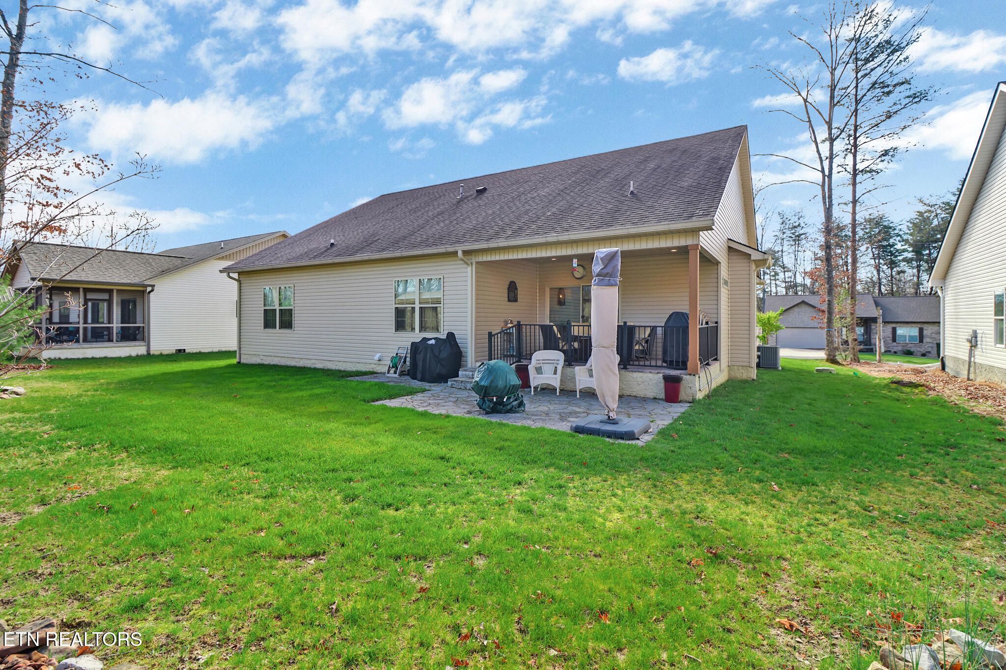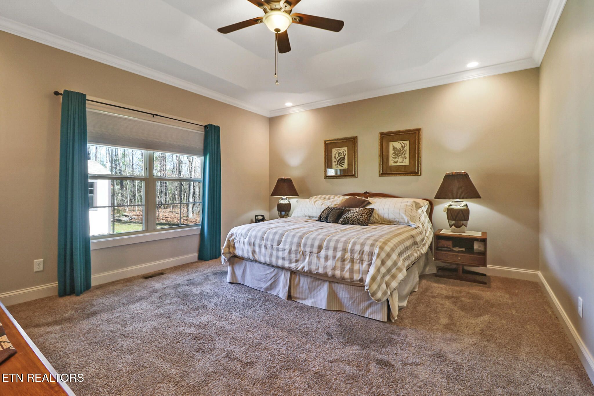 Lovely home with many upgrades throughout. Great room features a coffered ceiling, crown molding, built-ins, 2 transom windows, and natural gas log fireplace. Kitchen has a large walk-in pantry, antique white glazed cabinetry, granite countertops, tile backsplash, 9' island/breakfast bar, and extras like spice drawers and double trash drawer. Owners' suite has large walk-in closet, trey ceiling, step in shower with frameless glass, and granite counter with 2 sinks. Popular split bedroom floorplan. Guest bedroom and guest bath can be even more private when separated from the rest of the house simply by closing the sliding barn door. 11'x17' covered deck with pavers has ceiling fan, indirect lights, and railing. Large laundry room with antique white glazed cabinets. 11.5' x 14' open patio space with Crab Orchard Stone. Storage shed 10'x12' with electric, a ramp and double doors. Buyer to verify all information before making an informed offer. Fairfield Glade charges a $6,000 amenity fee to buyer at closing.