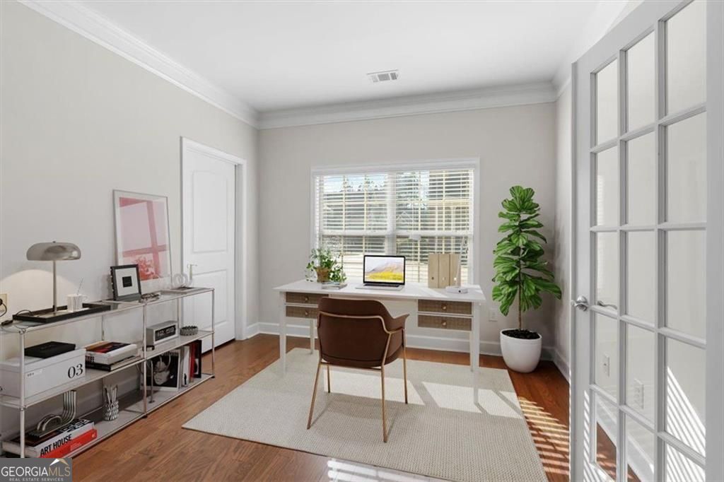 Welcome Home to 2280 Grove Valley Way in Grove Park! - where comfort, convenience, and low-maintenance living come together in this beautifully landscaped Active Adult 55+ community just minutes from Marietta Square. This is the Magnolia floor plan, the largest and most sought-after floor plan in the community. Enjoy one level living plus a large 2nd-floor 4th Bedroom or bonus space! Step inside to Beautiful hardwood floors that are further complimented by tall ceilings, oversized windows, crown molding, and natural light throughout. The warmth of the gas log fireplace in the expansive great room creates an inviting ambiance, accented by built-in shelves perfect for showcasing treasured books and keepsakes while tall glass double doors lead out to an expansive covered patio that overlooks the backyard and private woods! The large Chef's kitchen is fully equipped with white cabinets, tons of prep space, a newer Samsung Bespoke Appliance package, an oversized island w/ ample seating, granite countertops, generous counter space, a huge walk-in pantry, and modern finishes-perfect for cooking, hosting, or casual meals at home. The spacious main level primary suite features a tray ceiling, large walk-in closet, and spa-like ensuite complete with double vanities, a soaking tub, and separate oversized tiled shower. The second bedroom and full bathroom provide comfort and privacy for guests. Adjacent is a flexible room with glass double doors, ideal for a home office, gym, or third guest room. Upstairs, you'll find an expansive flex space with an additional full bathroom that is perfect for a media room, craft area, or guest retreat. Additional highlights include a large laundry room, two expansive storage rooms, and a two-car garag e. Appreciate a simplified lifestyle as all exterior building/roof maintenance and yard maintenance are included in the monthly HOA dues PLUS water, trash, sewer allowing you more time to enjoy what matters most! Grove Park features gated access and a beautiful Clubhouse with catering kitchen, gym, and library; a swimming pool; a dog park; a community lake; a composting area; and walking paths throughout the community. Conveniently located near shopping, dining, parks, Marietta Square, the Avenue at West Cobb, Silver Comet Trail, Kennesaw Mountain, the Battery and Truist Park (home of the Atlanta Braves), this home offers quick access to everything Marietta and the greater metro area have to offer while delivering comfort, functionality, and simplified living! ***Owner is Licensed Realtor in the state of Georgia***