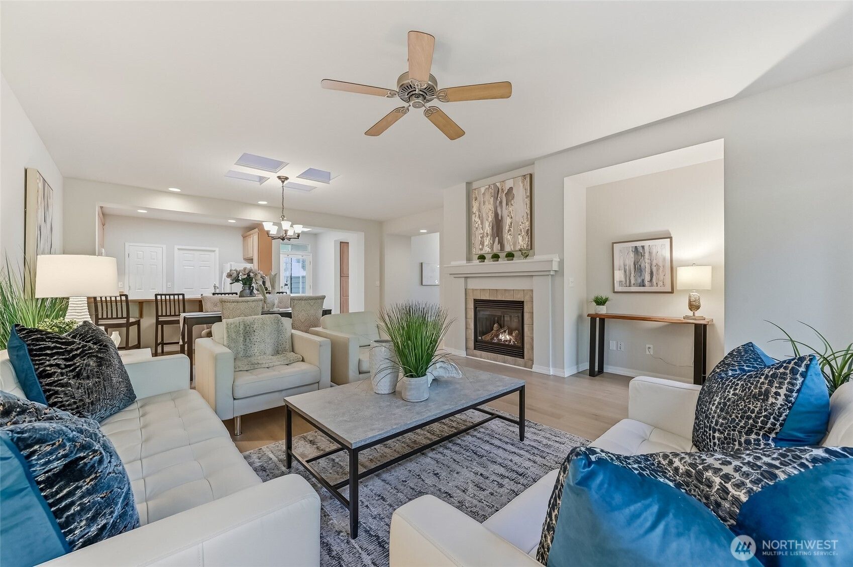 A golden opportunity awaits to enjoy year-round resort style living in this beautifully updated Union model home located in the “forever young” community of Trilogy. With new LVP flooring in the main living areas, high-end carpeting in both bedrooms and a freshly painted interior this home shines like new. The spacious peninsula kitchen includes lots of convenient bar seating, an abundance of cabinetry with handy pullouts and a large walk-in pantry. The focal point of the combined living and dining rooms is the cozy gas fireplace and media niche. Oversized primary bedroom with ensuite bath which features a step-in shower and a large walk-in closet with organizers. The second bedroom with an adjacent full bath creates a perfect guest suite for your long or short-term guests. The bedroom wings are separated by the home office providing everyone with plenty of privacy. The great room flows into the enclosed sunroom and expands your living area; this flexible space offers an array of possibilities. The superb outdoor space includes a large deck, a sunny flagstone patio and large side yard which can easily be fenced for your four-legged friends. Laundry room with storage includes W&D. Multiple skylights. Central A/C. 2 car garage w/storage. As the PNW’s premier 55+ master-planned community, Trilogy offers a resort lifestyle with a beautiful clubhouse, fitness center, indoor pool & walking track, pickleball, tennis courts, miles of walking trails and a true sense of community. 55+