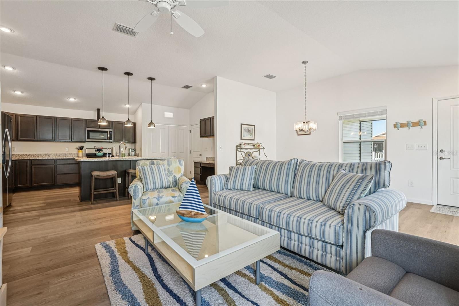 - Cathedral Ceiling(s), Ceiling Fan(s), Living/Dining Room, Open Floorplan, Main Level Primary, Thermostat