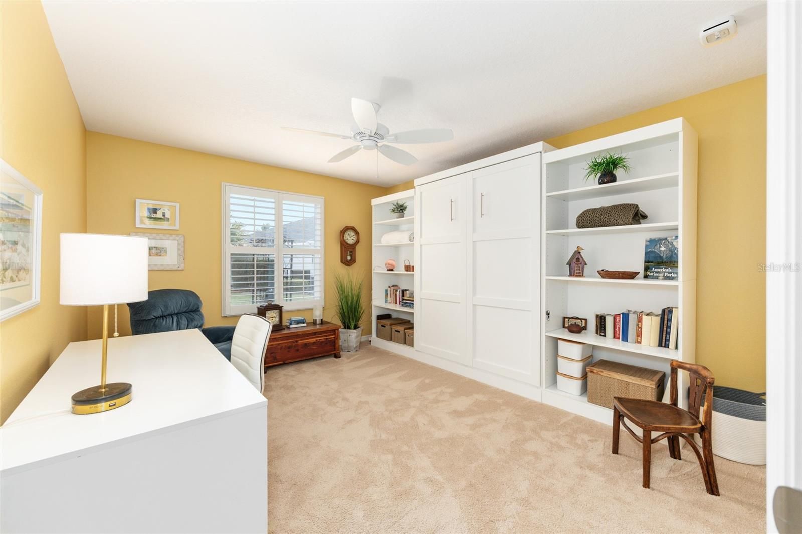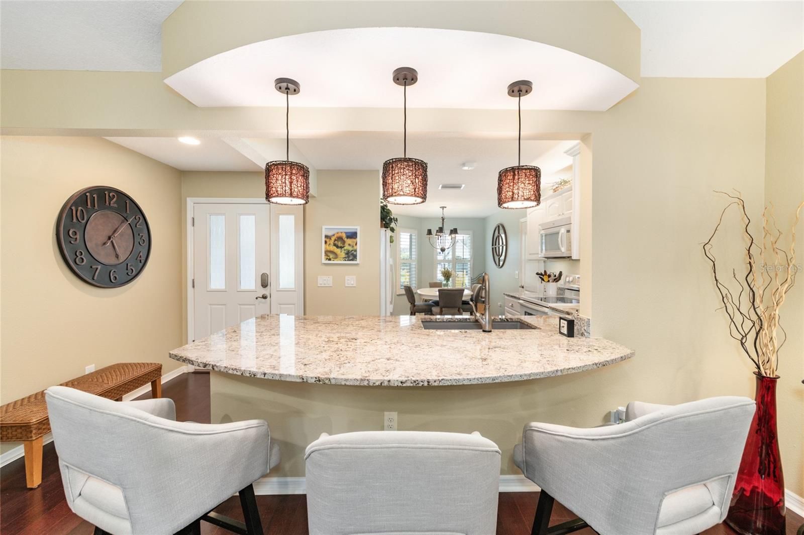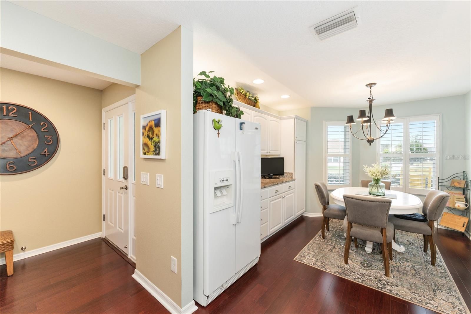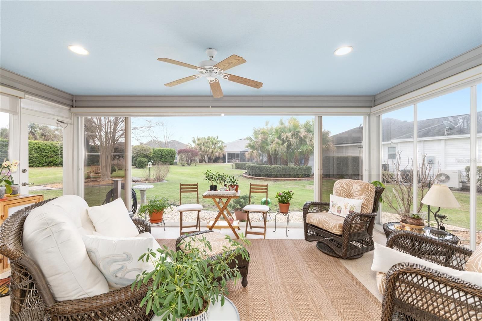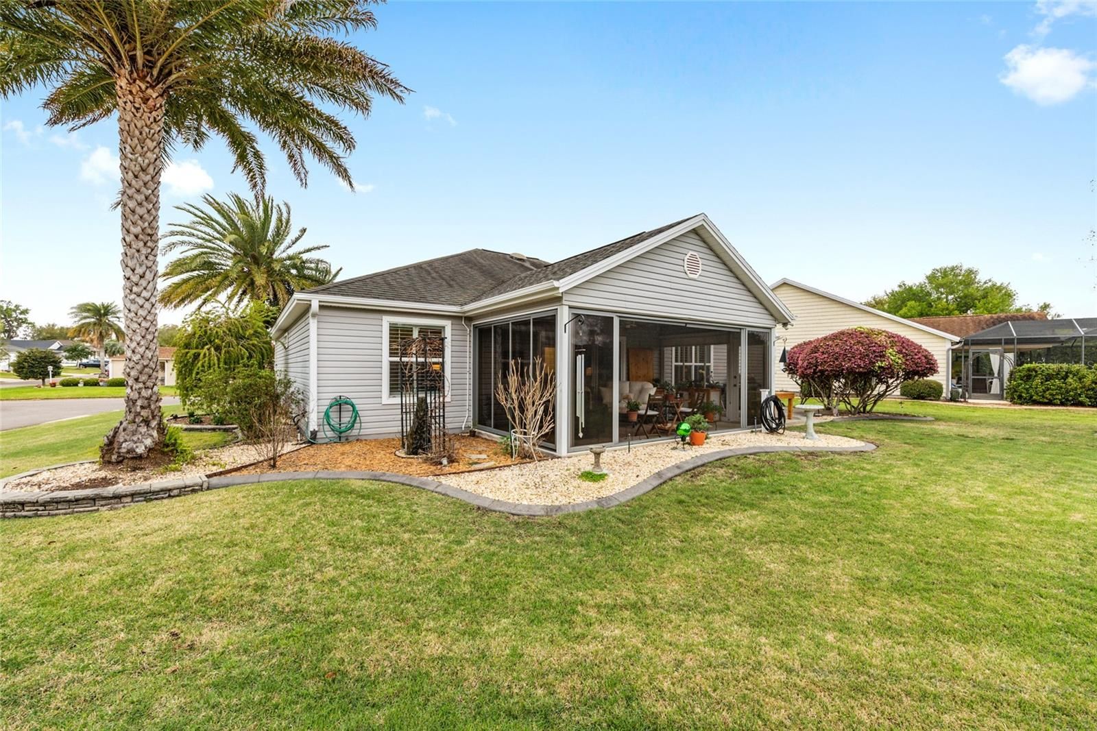 Located in the desirable Village of St. James in The Villages, Florida, this beautifully maintained 3 BEDROOM 2 BATH W/ OVERSIZED 2 CAR GARAGE WISTERIA DESIGNER MODEL offers privacy, upgrades, an exceptional oversized homesite with ROOM FOR POOL and just steps from the neighborhood pool. Positioned on a PRIVATE OVERSIZED LOT WITH MATURE LANDSCAPING, this home provides a peaceful backyard setting rarely found in the community, with convenient walk-through access to the nearby pool and outdoor amenities. MOST OF THE FURNISHINGS ARE AVAILABLE SEPARATELY. Inside, the home features an OPEN REMODELED KITCHEN W/ A BAY WINDOW, creating a bright and inviting space for cooking and entertaining. The kitchen showcases GRANITE COUNTERTOPS, AN UPGRADED SINK AND FAUCET, A NEW DISHWASHER, UNDER/OVER CABINET LIGHTING, AND PULL-OUT DRAWERS for added convenience and storage. The open layout flows into the main living area, where ENGINEERED HARDWOOD FLOORING, VAULTED CEILINGS, AND PLANTATION SHUTTERS enhance the warm and spacious feel. A FRONT ROOM W/ A BAY WINDOW AND CLOSET provides a flexible living space that can function as a den, office, or additional guest room. The guest bedroom includes a MURPHY BED, making it ideal for visitors while maintaining everyday functionality. The PRIMARY SUITE FEATURES VAULTED CEILINGS, DUAL SINKS, A LINEN CLOSET, AND A BEAUTIFULLY TILED ROMAN SHOWER WITH BUILT-IN SEAT, along with generous closet space for storage and organization. NEW CARPET INSTALLED IN THE BEDROOMS IN 2021. One of the most enjoyable spaces in the home is the 20 X 11 ENCLOSED LANAI, designed for year-round use. This space features FULL SLIDING ACRYLIC WINDOWS, A PAINTED FLOOR, CEILING FAN, AND ITS OWN MINI-SPLIT HEATING AND COOLING SYSTEM, creating a comfortable extension of the home for relaxing or entertaining. Additional highlights: OMNI SMOKE ALARMS, AN INSIDE LAUNDRY ROOM WITH STORAGE CLOSET, NEW WASHER AND DRYER, AND MULTIPLE OUTDOOR HOSE HOOKUPS WITH EXTERIOR LIGHTING. EXTENDED 4-FOOT GARAGE offers excellent storage and functionality w/ BUILT-IN CABINETS, SHELVING, WORKBENCH SPACE, 2 CEILING FANS, PULL-DOWN ATTIC STAIRS, a FLOORED ATTIC STORAGE AREA, along with a DEEP FREEZER for additional convenience. Major mechanical updates include a NEW A/C SYSTEM (2026) and NEW INSTA-HOT WATER HEATER (2026), providing peace of mind for the next owner. The property also features a LOW BOND BALANCE OF APPROXIMATELY $13,810, helping keep ownership costs manageable. Enjoy easy access to many of The Villages’ most popular amenities. Residents are just minutes from the ST. JAMES NEIGHBORHOOD RECREATION CENTER AND POOL, with additional nearby access to STERLING HEIGHTS RECREATION CENTER AND SEABREEZE REGIONAL RECREATION CENTER, offering pools, pickleball, tennis courts, fitness facilities, and countless clubs and social activities. Golfers will appreciate the proximity to JACARANDA, TURTLE MOUND, SOUTHERN STAR, AND YANKEE CLIPPER EXECUTIVE GOLF COURSES, as well as the nearby CANE GARDEN COUNTRY CLUB, known for its excellent golf, dining, and entertainment. Shopping, restaurants, medical facilities, and everyday conveniences along the 466A CORRIDOR are also nearby. This well-cared-for home combines THOUGHTFUL UPGRADES, PRIVACY, AND A HIGHLY DESIRABLE LOCATION within The Villages community, making it an exceptional opportunity for full-time living or a seasonal Florida retreat. ASK FOR A FEATURE SHEET TO SEE ADDITIONAL DETAILS & AVAILABLE FURNITURE LIST.