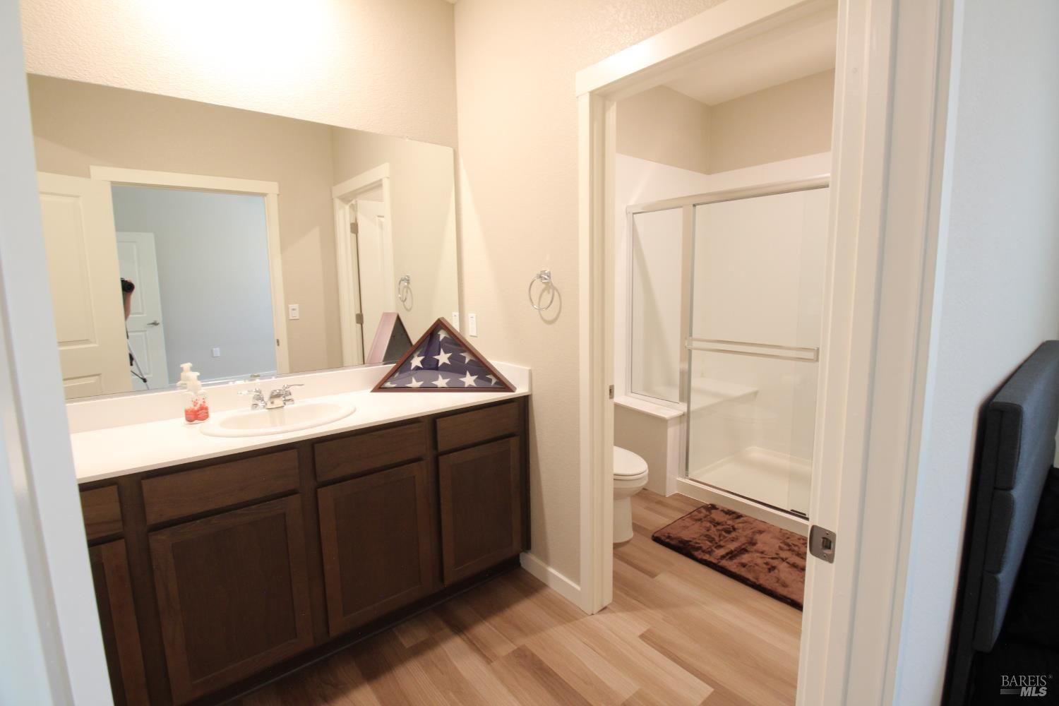 Luxury 55+ Living: Baldwin Model'' This IMMACULATE home is welcoming with comfort and style. The open concept blending of the dining and living areas provides for effortless entertainment. The chef's kitchen includes granite countertops, oversized dark wood cabinetry, and top of the line stainless steel Whirlpool appliances including gas range/oven, dishwasher, and refrigerator. This home has dual master suites with generously sized bedrooms, spacious bathrooms, and walk-in closets. The large covered front porch and covered extended back patio blend the lines between indoor and outdoor living. Modern conveniences include recessed lighting and built-in USB outlets. Other home amenities include easy care luxury vinyl plank flooring, carpeted bedrooms, whole house fan, ceiling fans in every room and an easy maintenance, water conservative landscaped backyard. Solar panels ensure energy efficiency and economical utility bills. Summit at Liberty 55+ is a vibrant community with gated access, clubhouse, party facility, fitness center, sparkling pool, hot water spa, dog park, community garden, bocce ball, tennis and pickleball courts and social clubs.