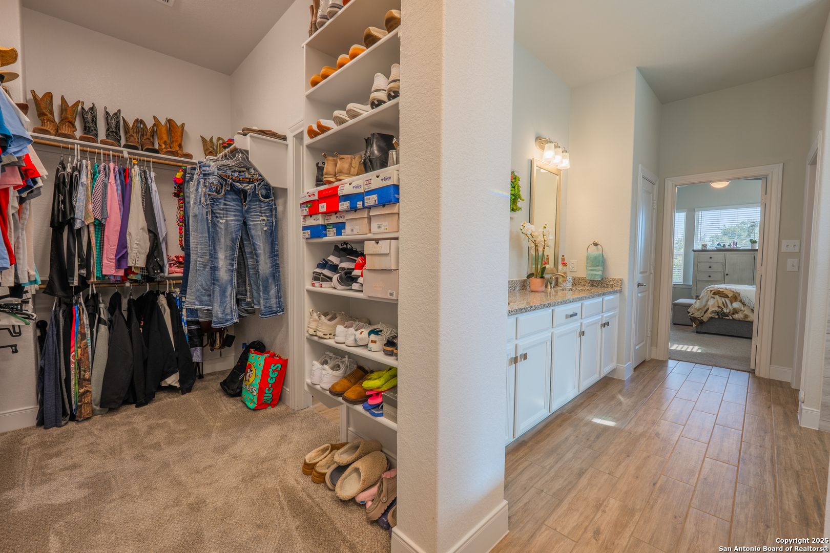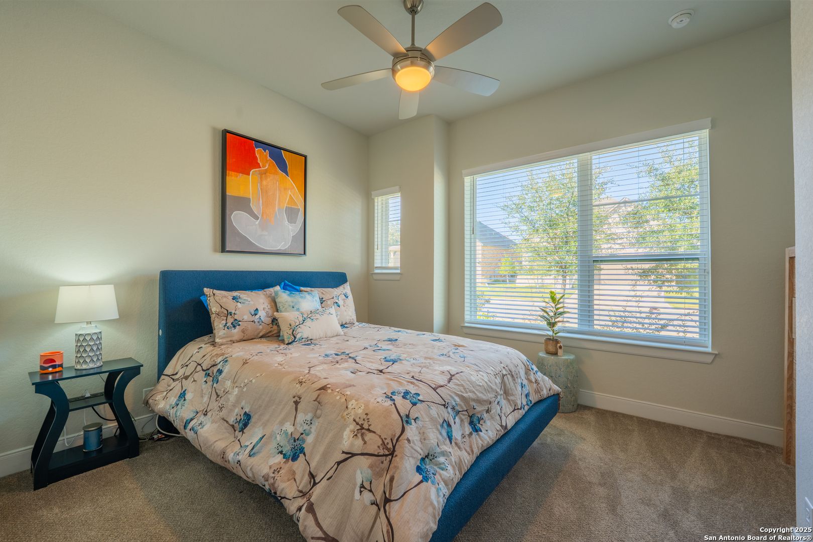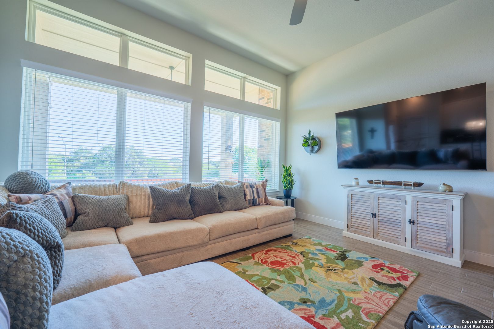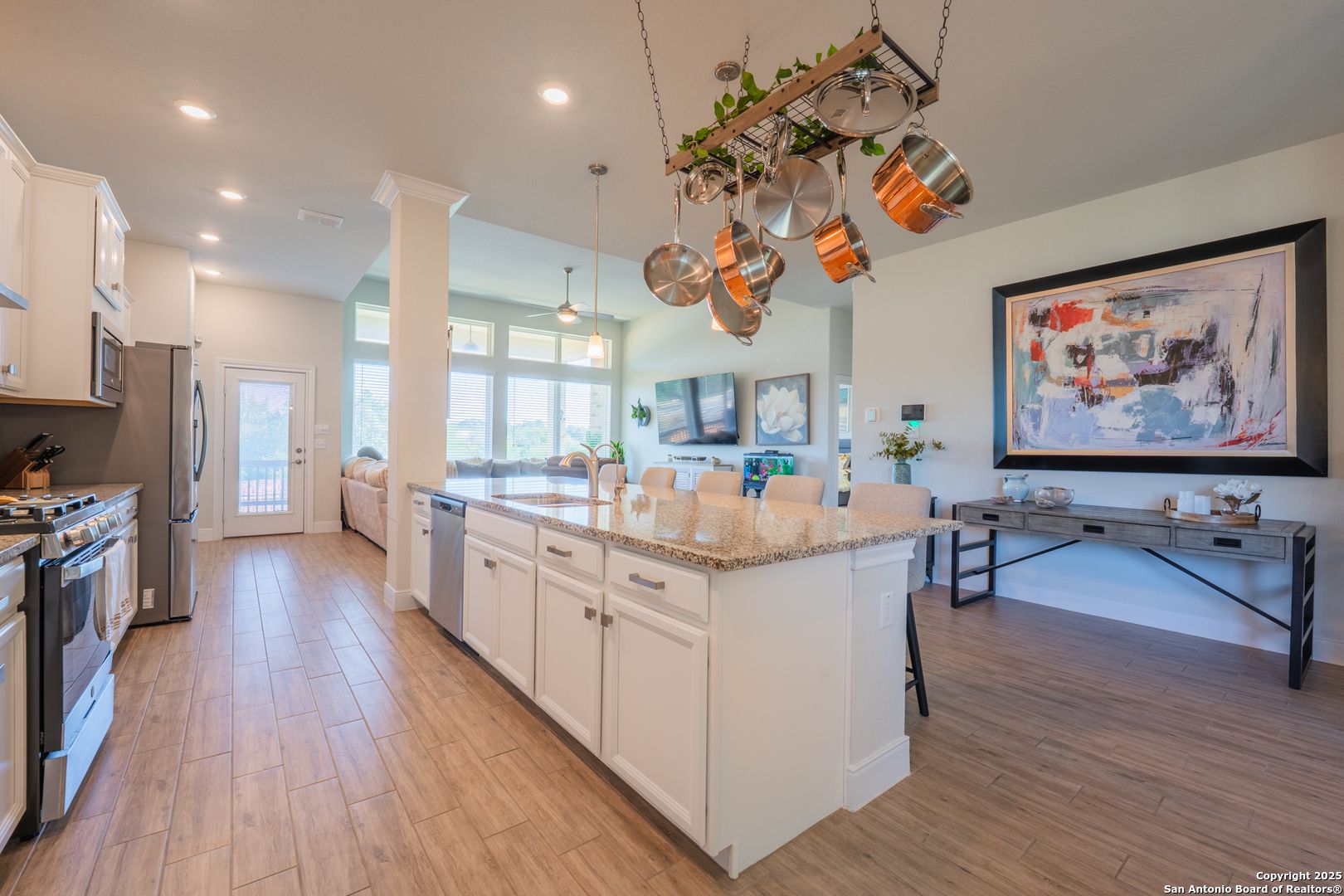 This better than new, David Weekley custom home is located in prestigious Campanas at Cibolo Canyons, offering unprecedented amenities, a resort lifestyle and easy access to coveted TPC San Antonio. With 3 bedrooms and 2 full baths in 2,335 square feet on one level, this home boasts an open floor plan with a layout that lives large, great for entertainers and chefs alike. The kitchen is the centerpiece with plentiful white cabinets, and a huge island that could easily be a second dining area. There are two pantries, gas cooking, granite counters, gorgeous custom tile backsplash and wood-look tile floors. There is an open office that can be used as a flex space or game room in addition to the spacious dining room with built-ins and buffet serving station with more granite counters. The master bedroom retreat is your sanctuary. It's spacious with abundant natural light and a spa-like on suite bath with a walk-in super shower, dual vanities, and the closet of your dreams that connects directly to the laundry room. Enjoy evenings on the large covered porch, or head to one of 3 different pools, meet friends at the clubhouse, take a walk on the nature trails throughout the community, or play some tennis or pickleball. There is nothing to do but move in. Yard work for the front and back yard is done by the HOA. This also includes front yard mulch and flowers planted twice a year. Security monitoring is even included as well. Dont' miss the full flight of stairs to a huge storage area above the 2-car garage, making downsizing that much easier.