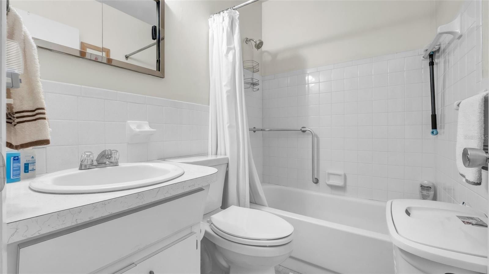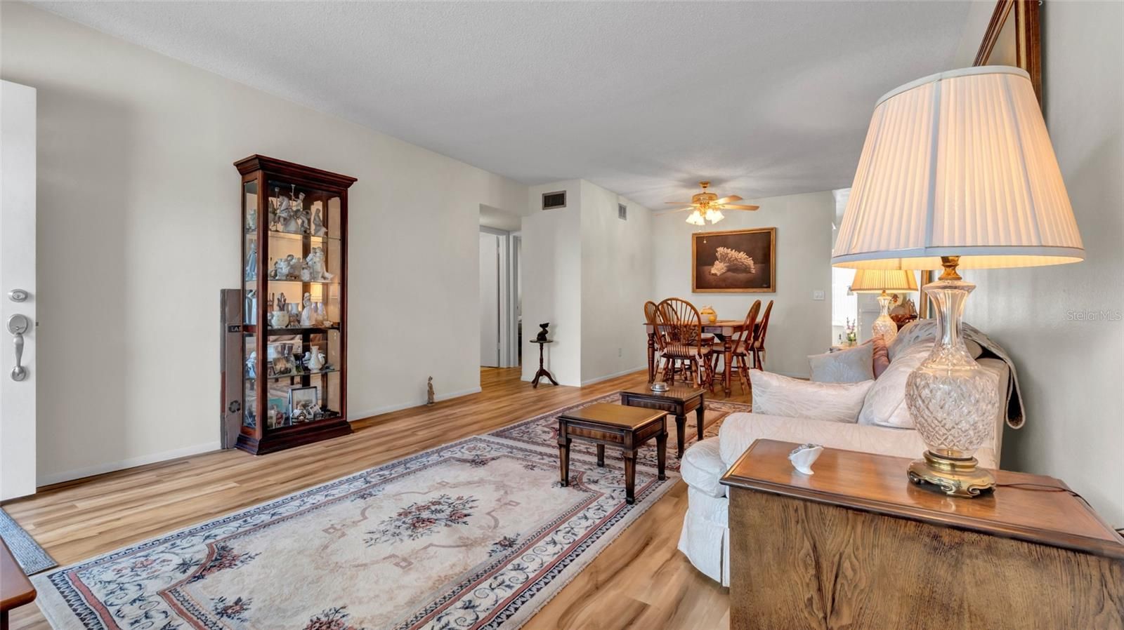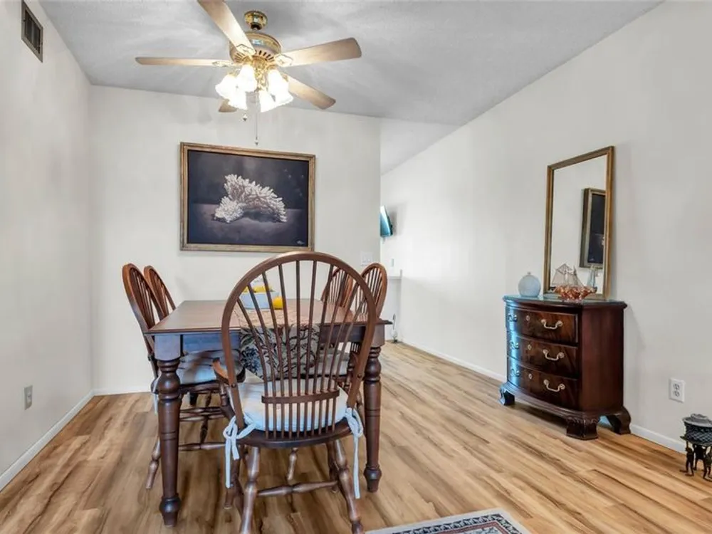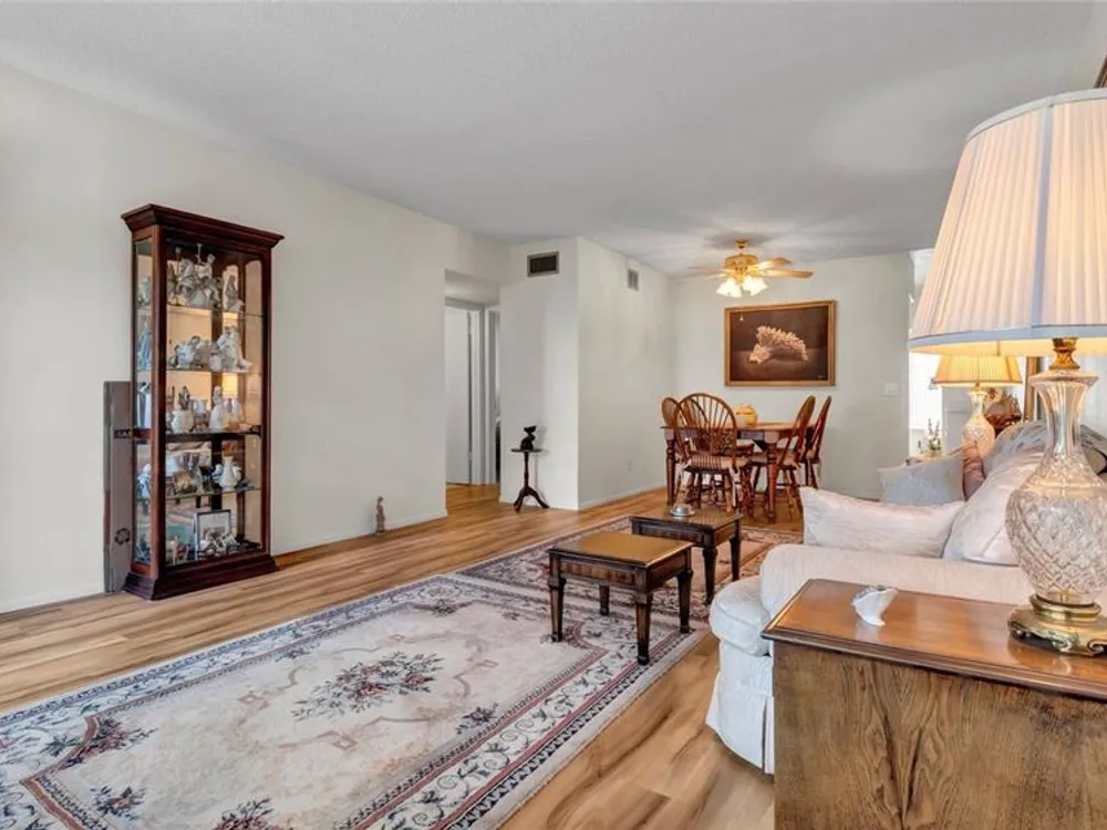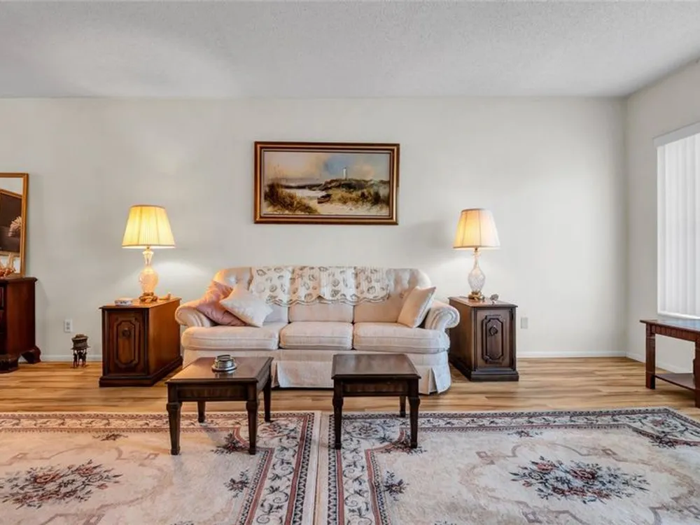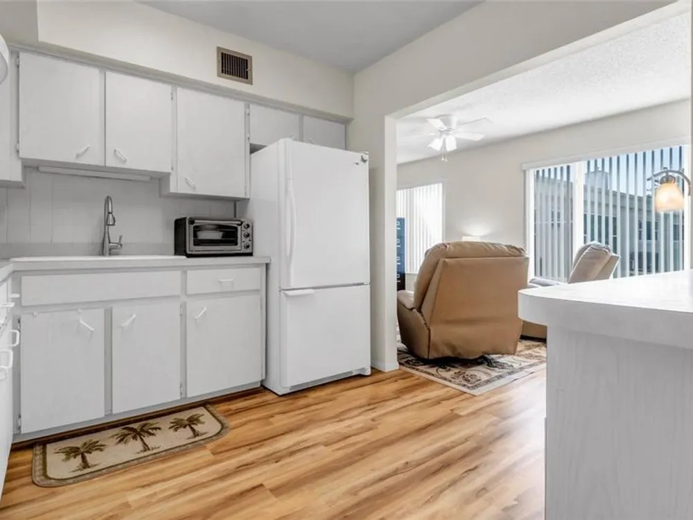 A bright and cheerful condo located in a 55+ community, which provides for all comforts of home living, centrally located to all major beach communities and shopping centers. Tastefully updated wood floors throughout (extra sound proofed install), new toilets, new oven and hotplate, ceiling fans, updated windows, air cond. serviced regularly, large living room, comfortably located bright (air cond.) Florida room with grassed view. Separate lockable storage room. A delightful location for restaurants and entertainment, full facilities within Top Of The World are available for your use. A MUST SEE - A VERY NICE SPACE TO LIVE.
