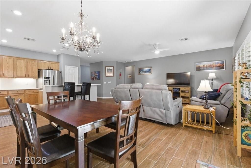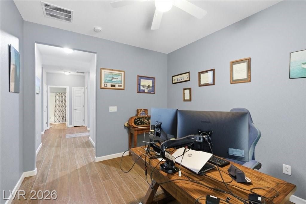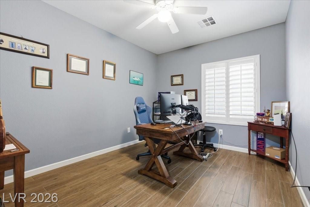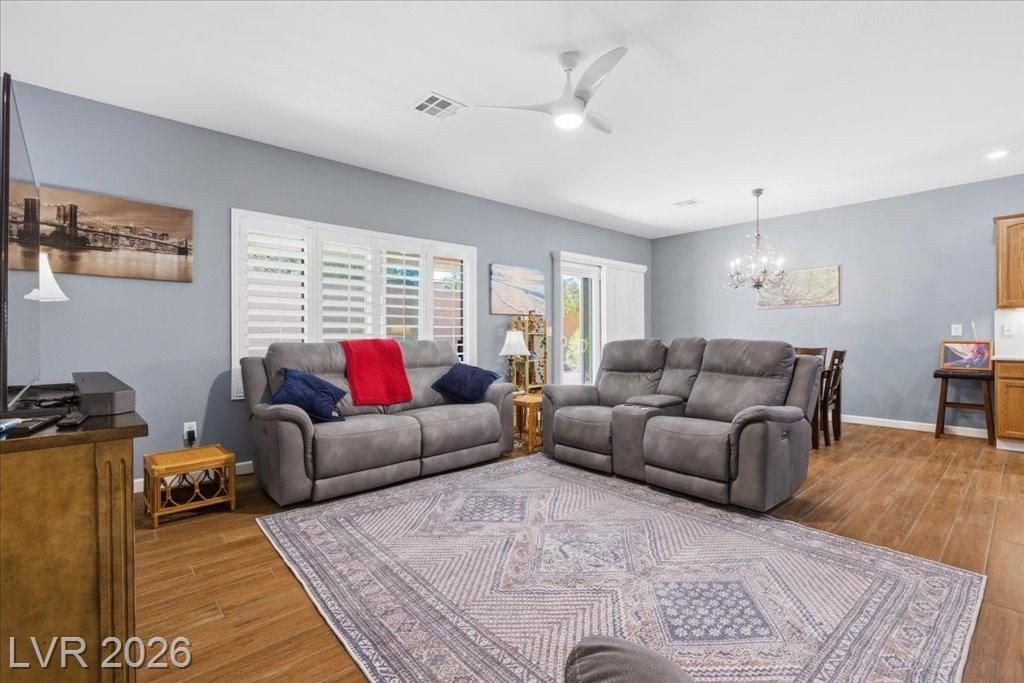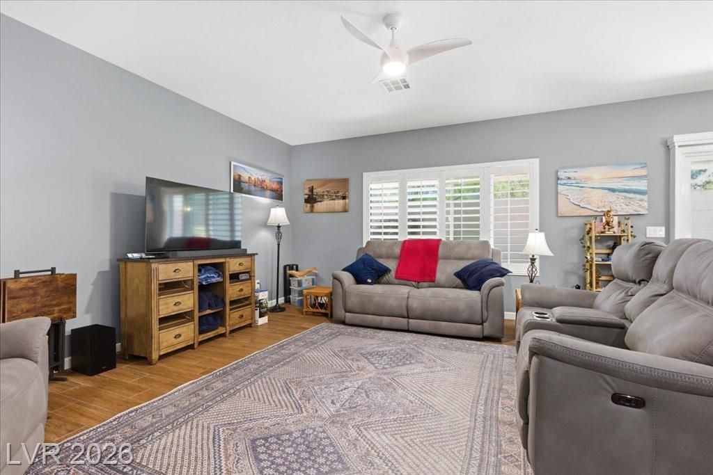 A gorgeous "Carolina" home in Sun City Anthem offering comfortable, low-maintenance living in a premier age-qualified setting. This 2-bedroom plus den floor plan features an open-concept layout with a spacious great room, dining area, and user friendly kitchen, ideal for both everyday living and entertaining. The primary suite includes a private bath and walk-in closet, while the second bedroom provides space for guests. A versatile den can serve as an office, hobby room, or additional lounge. This home thoughtfully built for ease of living, solar screens and ceiling fans make this home very comfortable. Have coffee or a sip of wine on your patio or on the front courtyard. Tasteful interior paint colors, wood plank tile floors and shutters add to this homes beauty. Residents enjoy access to resort-style amenities including an award winning clubhouse, fitness centers, pools, golf, and social clubs, all set within a scenic, master-planned community with mountain and city surrounding.