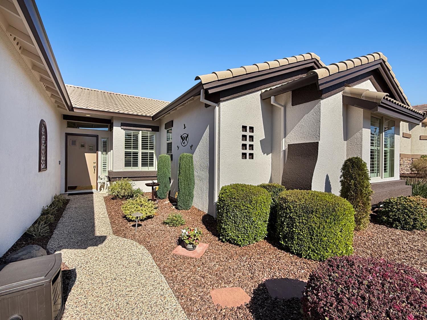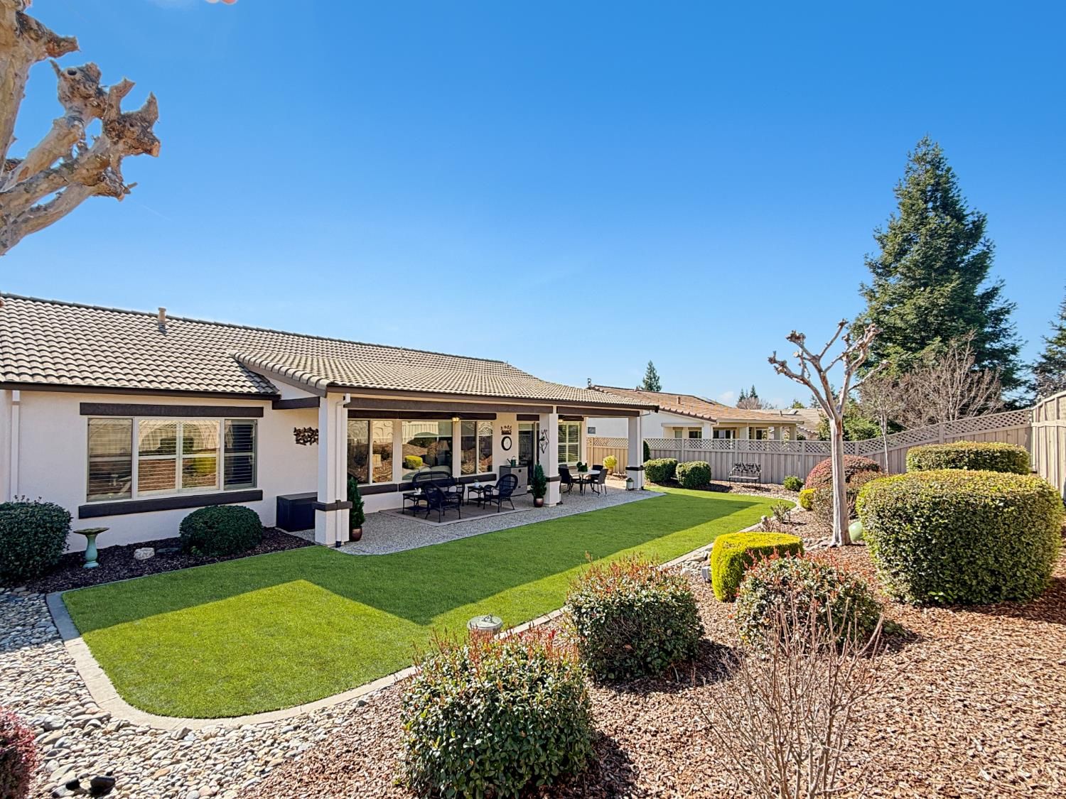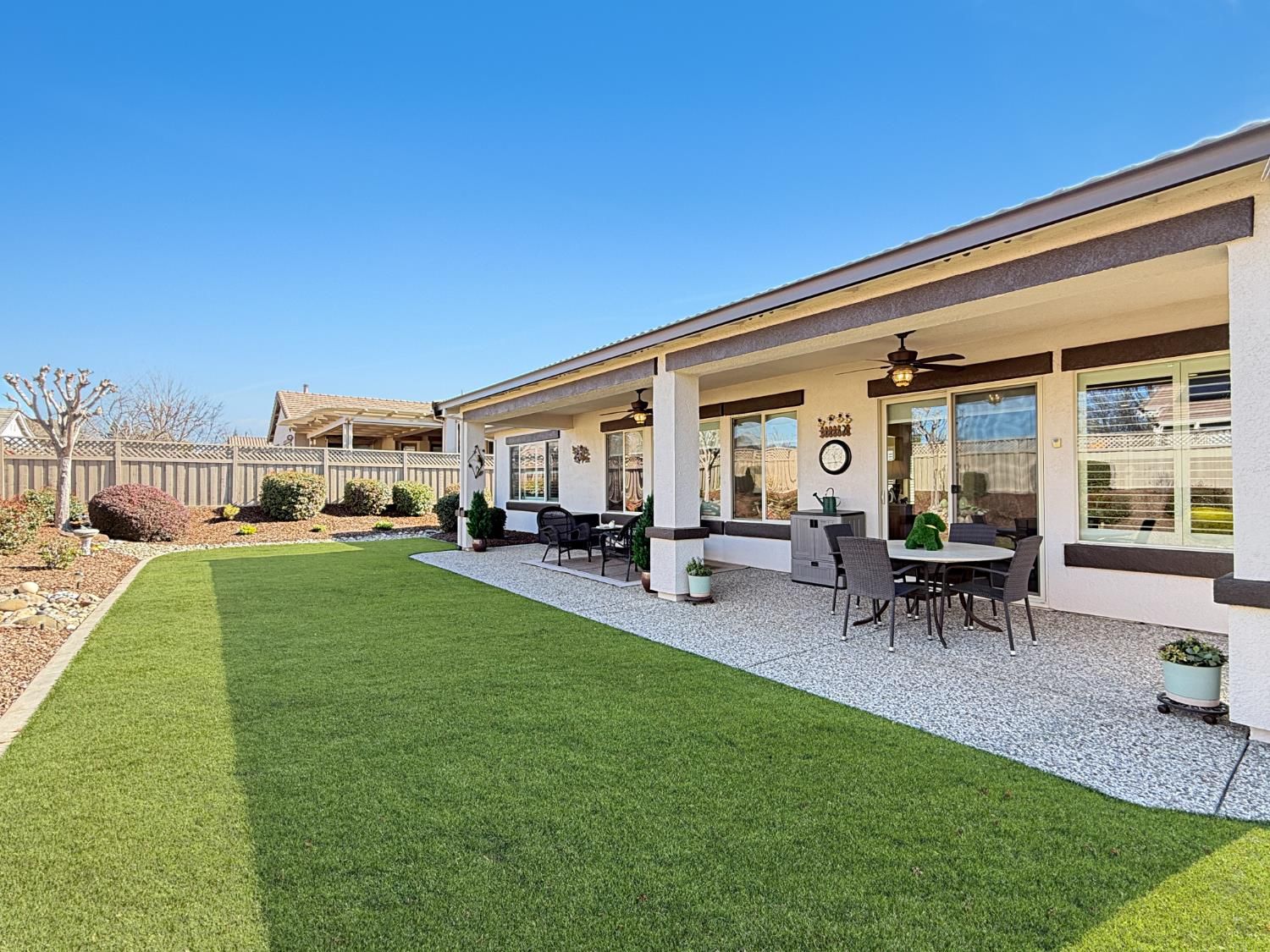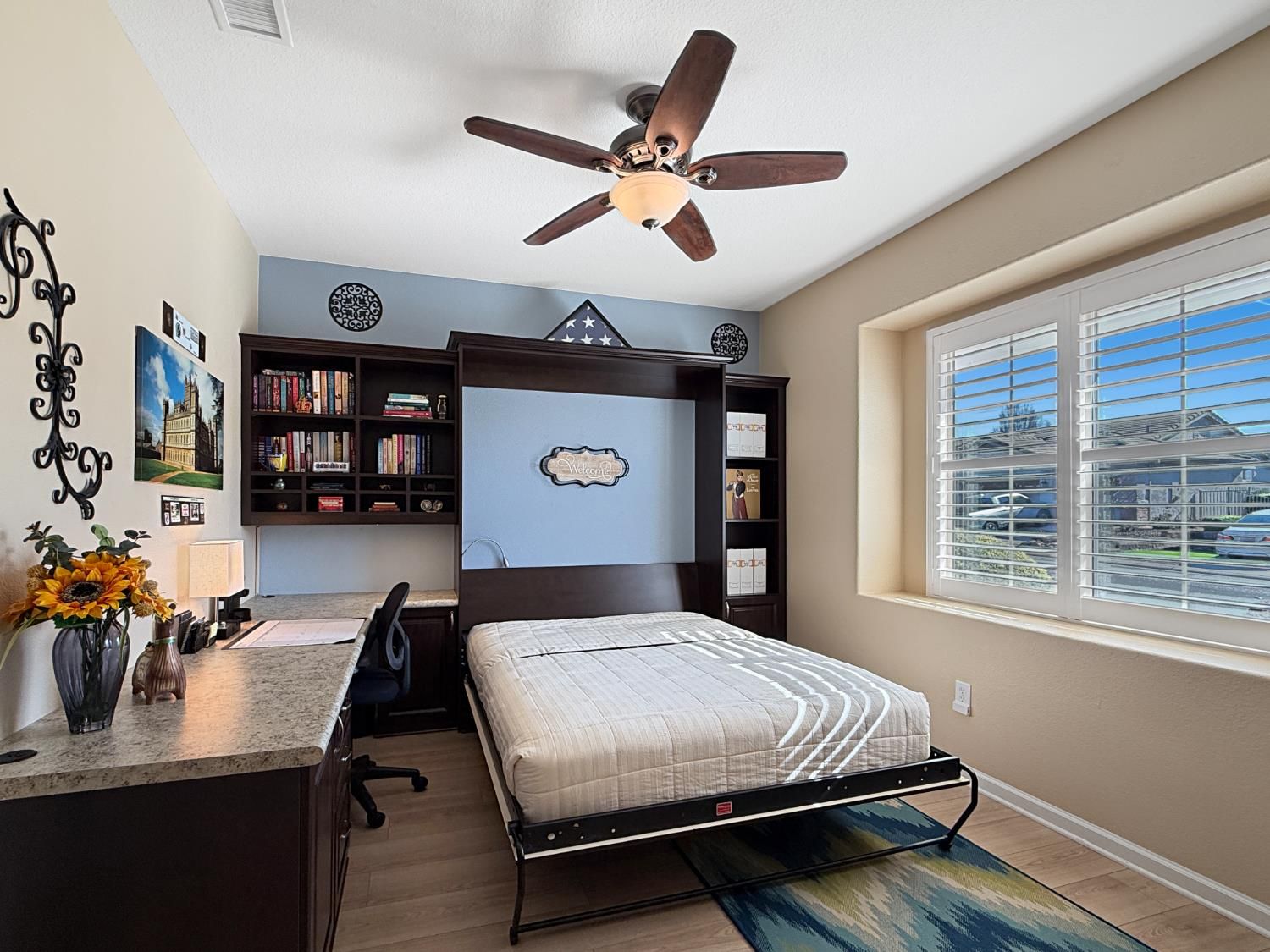 Welcome to this beautifully maintained Orchard Crest model in the sought-after 55+ community of Sun City Lincoln Hills. This thoughtfully designed home offers 2 bedrooms, 2 bathrooms, and a versatile office/den, providing flexible space for guests, hobbies, or working from home. Inside, you'll find a blend of tile, carpet, and vinyl plank flooring, Corian counters with granite in the kitchen, refinished cabinetry with pullout shelves, a pantry, shutters, and updated LED lighting throughout. The guest bedroom features a built-in desk and Murphy bed, creating the perfect multi-functional retreat. A newer HVAC system and no Kitec plumbing offer added peace of mind. Step outside to enjoy the beautifully landscaped backyard with a tranquil water feature, plus low-maintenance artificial grass. Living in Sun City Lincoln Hills means access to resort-style amenities including golf courses, fitness centers, pools, walking trails, clubs, and countless social activities, all designed for an active and connected lifestyle.
