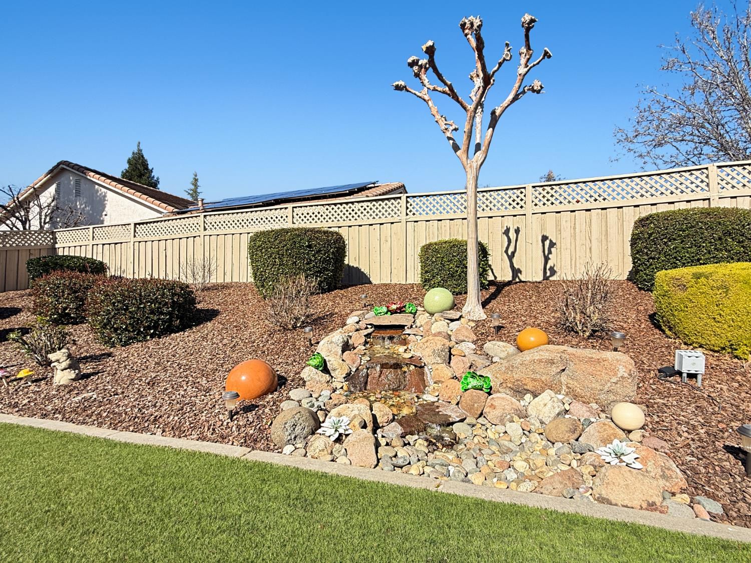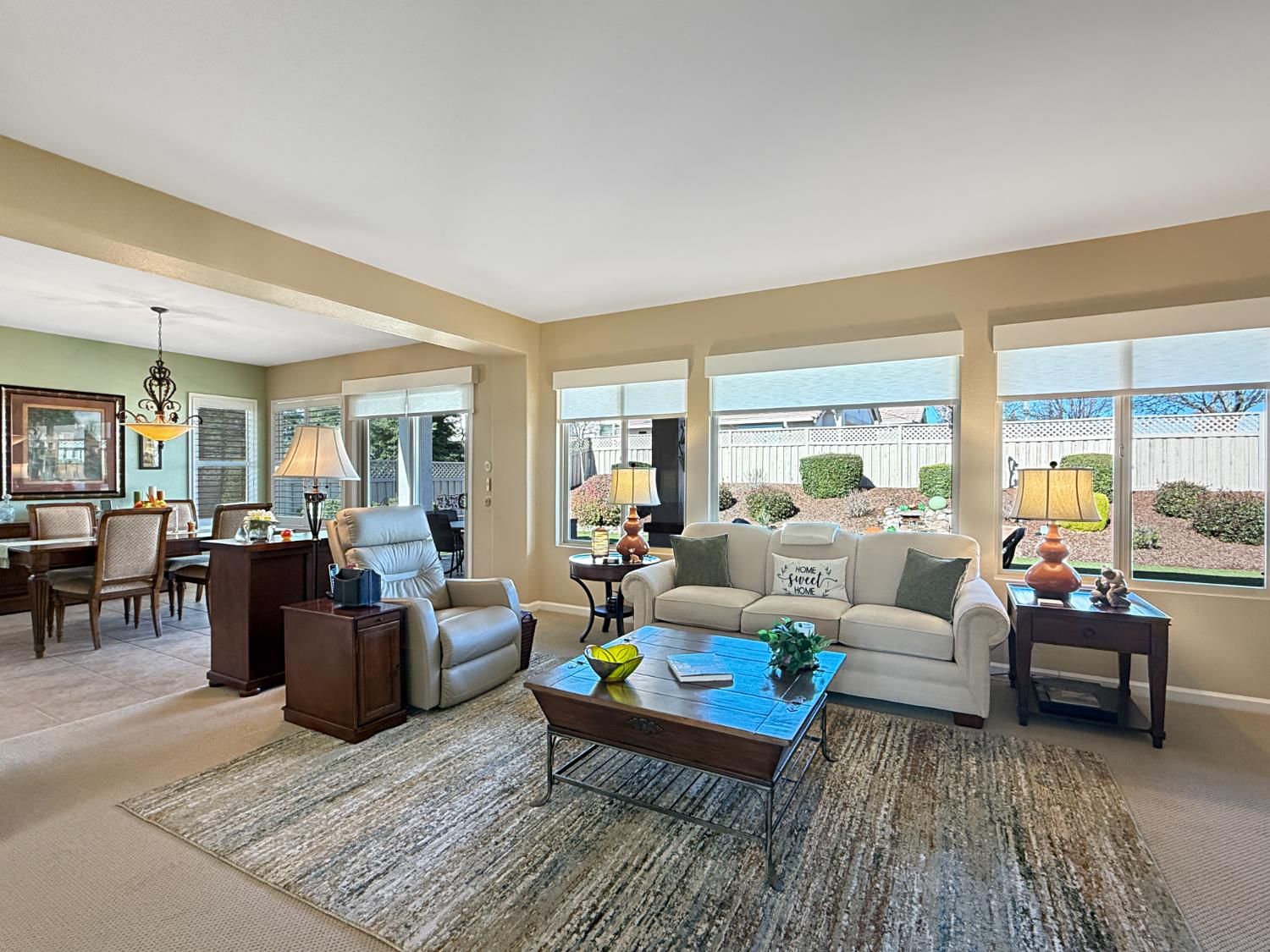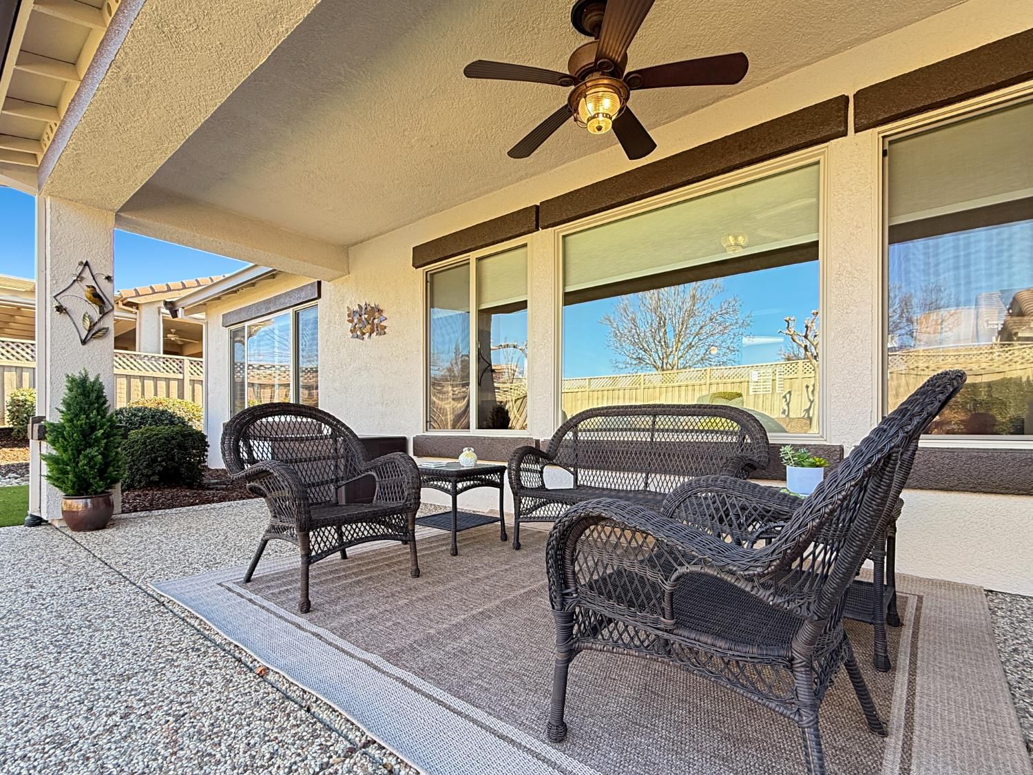 Welcome to this beautifully maintained Orchard Crest model in the sought-after 55+ community of Sun City Lincoln Hills. This thoughtfully designed home offers 2 bedrooms, 2 bathrooms, and a versatile office/den, providing flexible space for guests, hobbies, or working from home. Inside, you'll find a blend of tile, carpet, and vinyl plank flooring, Corian counters with granite in the kitchen, refinished cabinetry with pullout shelves, a pantry, shutters, and updated LED lighting throughout. The guest bedroom features a built-in desk and Murphy bed, creating the perfect multi-functional retreat. A newer HVAC system and no Kitec plumbing offer added peace of mind. Step outside to enjoy the beautifully landscaped backyard with a tranquil water feature, plus low-maintenance artificial grass. Living in Sun City Lincoln Hills means access to resort-style amenities including golf courses, fitness centers, pools, walking trails, clubs, and countless social activities, all designed for an active and connected lifestyle.