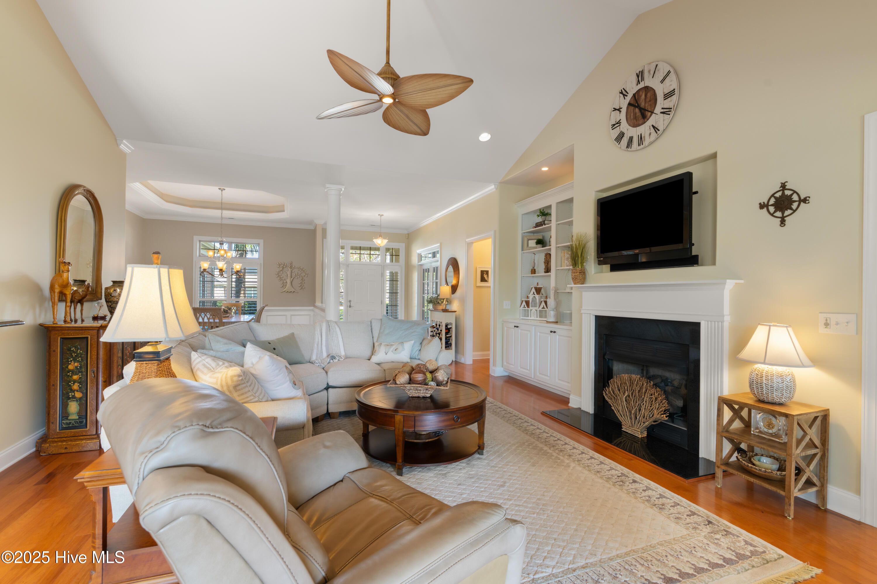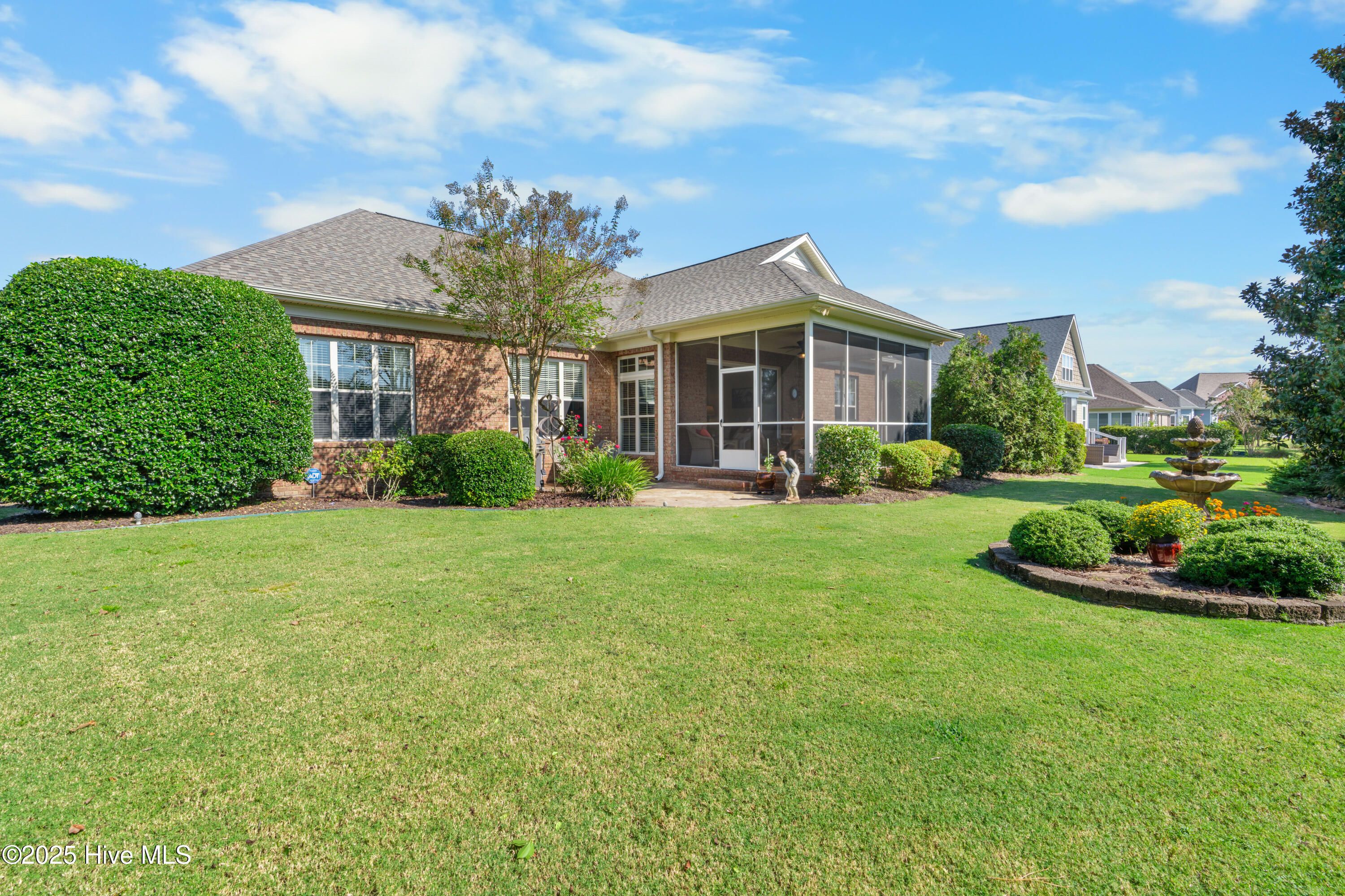 Discover exceptional living in this move-in ready, single-story home located in the prestigious Compass Pointe community in Leland. Designed with quality and thoughtful upgrades throughout, this residence welcomes you with an oversized, colored stamped concrete front porch and boasts an oversized garage with additional golf cart access. Step inside to high and vaulted ceilings in the great room and dining room, plantation shutters, an oversized study with glass French doors, and an open floor plan that seamlessly connects the sunroom and screened porch. The kitchen features beautiful oak cabinets, granite countertops, stainless steel appliances, and a custom backsplash, while the dining room dazzles with lighted tray ceilings and decorative moldings. Relax by the cozy fireplace with built-ins or enjoy the four-season sunroom, screen porch and outdoor patio. The owner's suite offers enhanced ceiling details, a spacious walk-in closet, and a luxurious tile shower and soaking tub. Engineered hardwood flooring and tile extend throughout the main living areas, with plush carpeting in the bedrooms. Set on mature landscaping with views of the #4 Green, the home grants exclusive access to Compass Pointe's resort-style amenities, including the Grand Lanai Clubhouse, Health and Wellness Center, multiple pools, a lazy river, tennis and pickleball courts, and a large events lawn. Golf and social memberships are available at Compass Pointe Golf Club, featuring an 18-hole course, restaurant, and state-of-the-art facilities. Why wait to build when you can enjoy this exceptional home and its savings today?