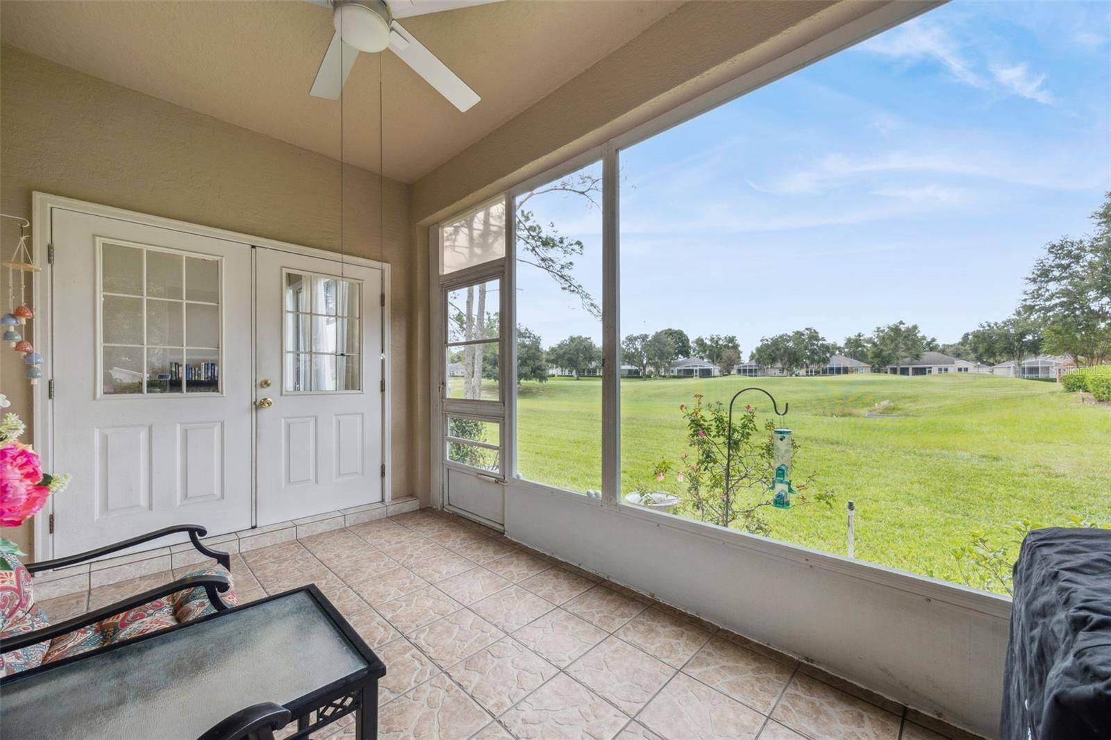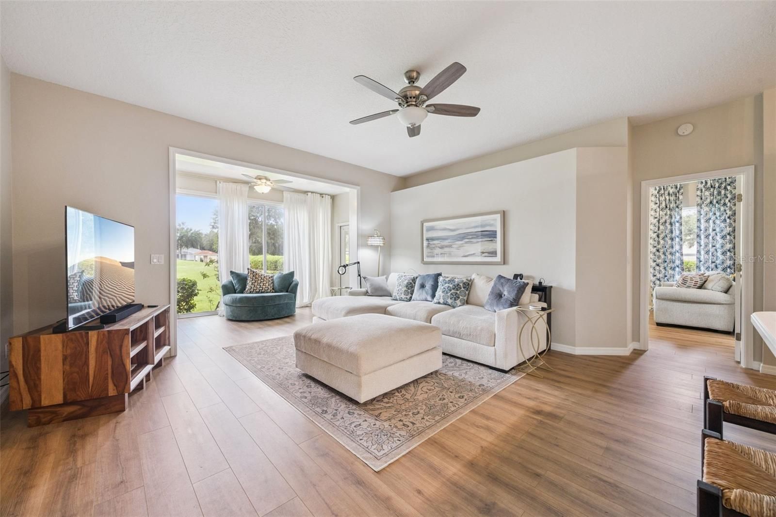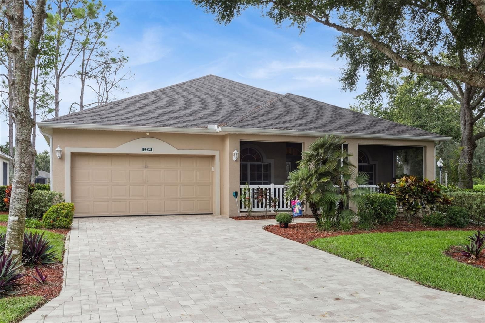PRICE REDUCED - The home you have been waiting for in Kings Ridge, the 55+ resort community of choice in Lake County. This St. Clair model with screened-in front porch home is located in the WELLINGTON Neighborhood and is a LARGE 3/2 plus 2 flex spaces plus a formal dining room. One is off the rear of home adjacent to covered and screened lanai and one is at front that can be a home office, den or formal living room. 2154 sq ft with plenty of room to spread out. Split bedrooms, high ceilings, open floor plan, too. No need to use an extra bedroom for a home office, exercise space or craft room. Fabulous large eat in kitchen with room to add an island, new lux vinyl plank flooring throughout (2025), new interior paint (2025), new appliances 2025, Roof 2021, AC 2021, Water Heater 2021. 2 screened in outdoor areas, front porch and rear lanai. New Paver Driveway and sidewalk 2024. Great location scenic, lush and quiet location on golf course at Hole #7 and at end of street on cul de sac, too. Kings Ridge is a 24-hour guard gated community with 2 golf courses, 3 swimming pools, tennis, clubhouse, activities, classes, excursions, etc. Easy access to great shopping, dining, medical facilities, Publix, nails without entering a main road. Disney only 30 min away. Golf carts welcome here. Monthly maintenance includes exterior repainting and lawn care. NO REAR OR RIGHT-SIDE HOME NEIGHBORS.