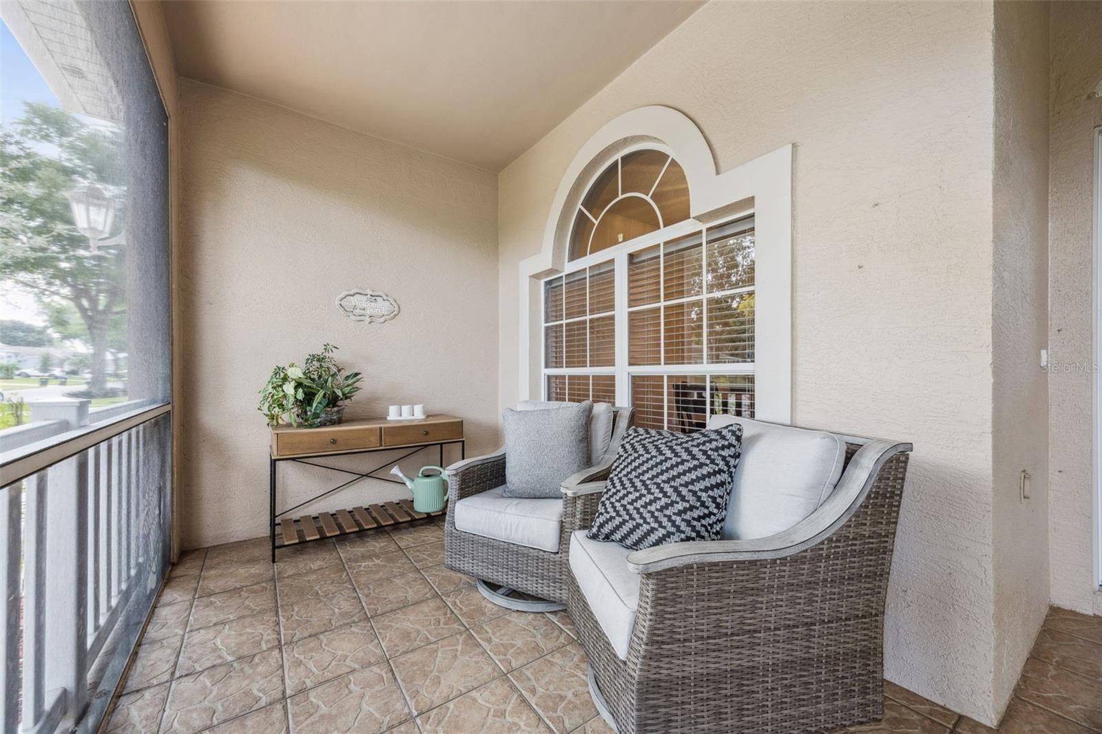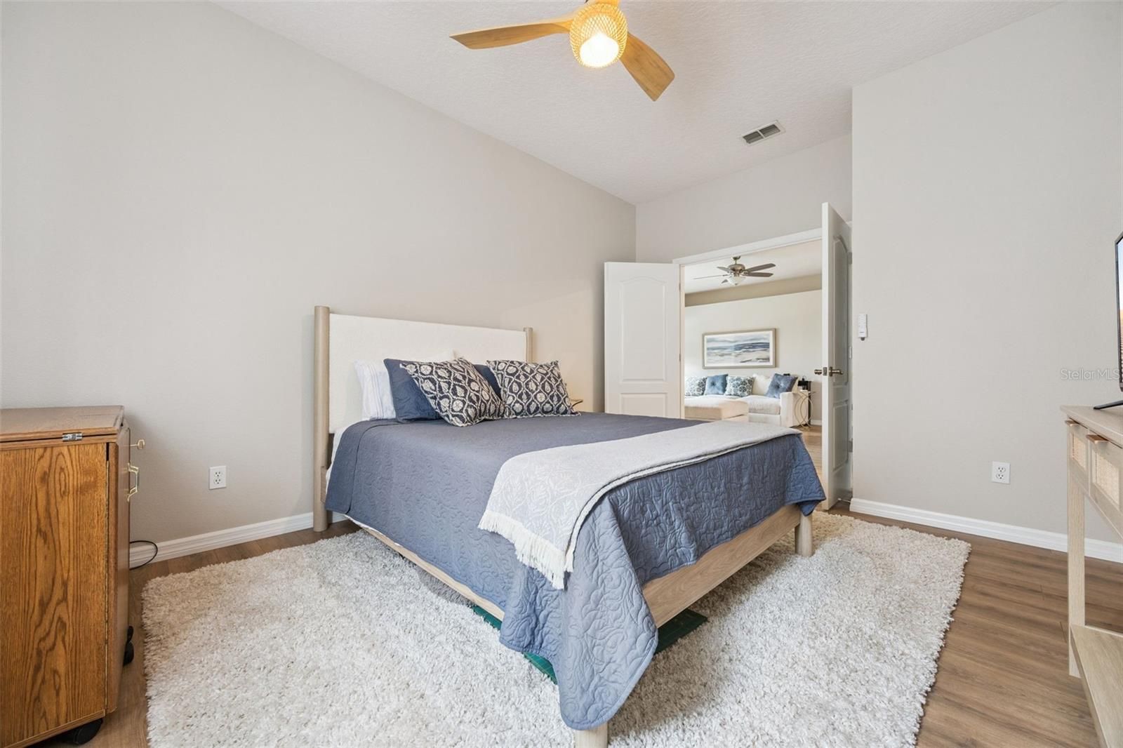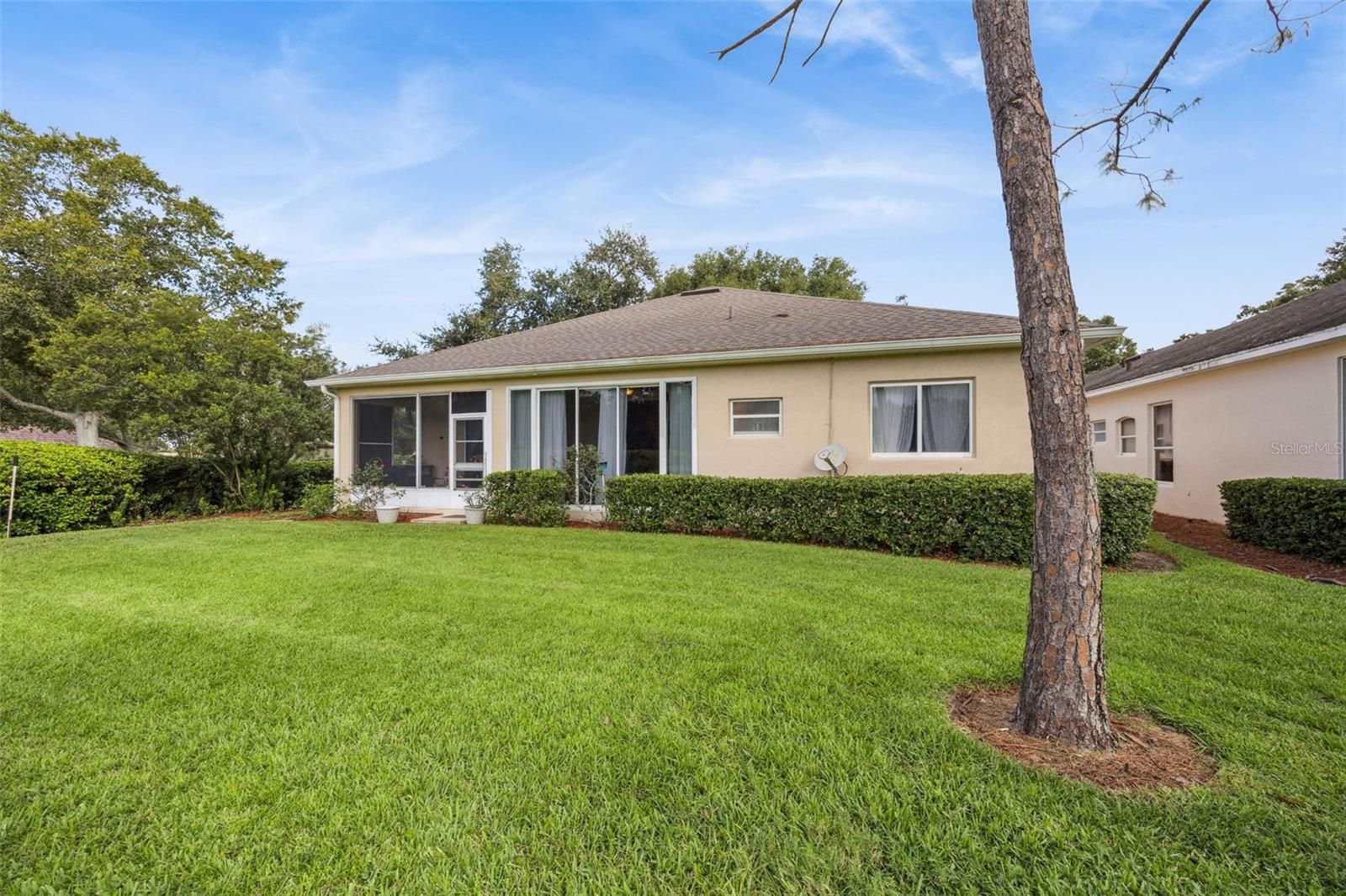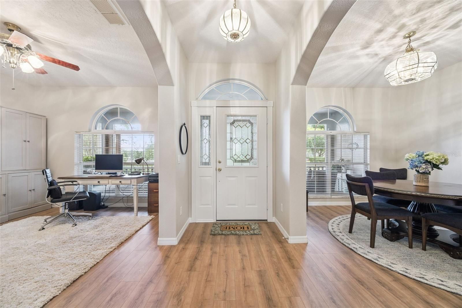 PRICE REDUCED - The home you have been waiting for in Kings Ridge, the 55+ resort community of choice in Lake County. This St. Clair model with screened-in front porch home is located in the WELLINGTON Neighborhood and is a LARGE 3/2 plus 2 flex spaces plus a formal dining room. One is off the rear of home adjacent to covered and screened lanai and one is at front that can be a home office, den or formal living room. 2154 sq ft with plenty of room to spread out. Split bedrooms, high ceilings, open floor plan, too. No need to use an extra bedroom for a home office, exercise space or craft room. Fabulous large eat in kitchen with room to add an island, new lux vinyl plank flooring throughout (2025), new interior paint (2025), new appliances 2025, Roof 2021, AC 2021, Water Heater 2021. 2 screened in outdoor areas, front porch and rear lanai. New Paver Driveway and sidewalk 2024. Great location scenic, lush and quiet location on golf course at Hole #7 and at end of street on cul de sac, too. Kings Ridge is a 24-hour guard gated community with 2 golf courses, 3 swimming pools, tennis, clubhouse, activities, classes, excursions, etc. Easy access to great shopping, dining, medical facilities, Publix, nails without entering a main road. Disney only 30 min away. Golf carts welcome here. Monthly maintenance includes exterior repainting and lawn care. NO REAR OR RIGHT-SIDE HOME NEIGHBORS.