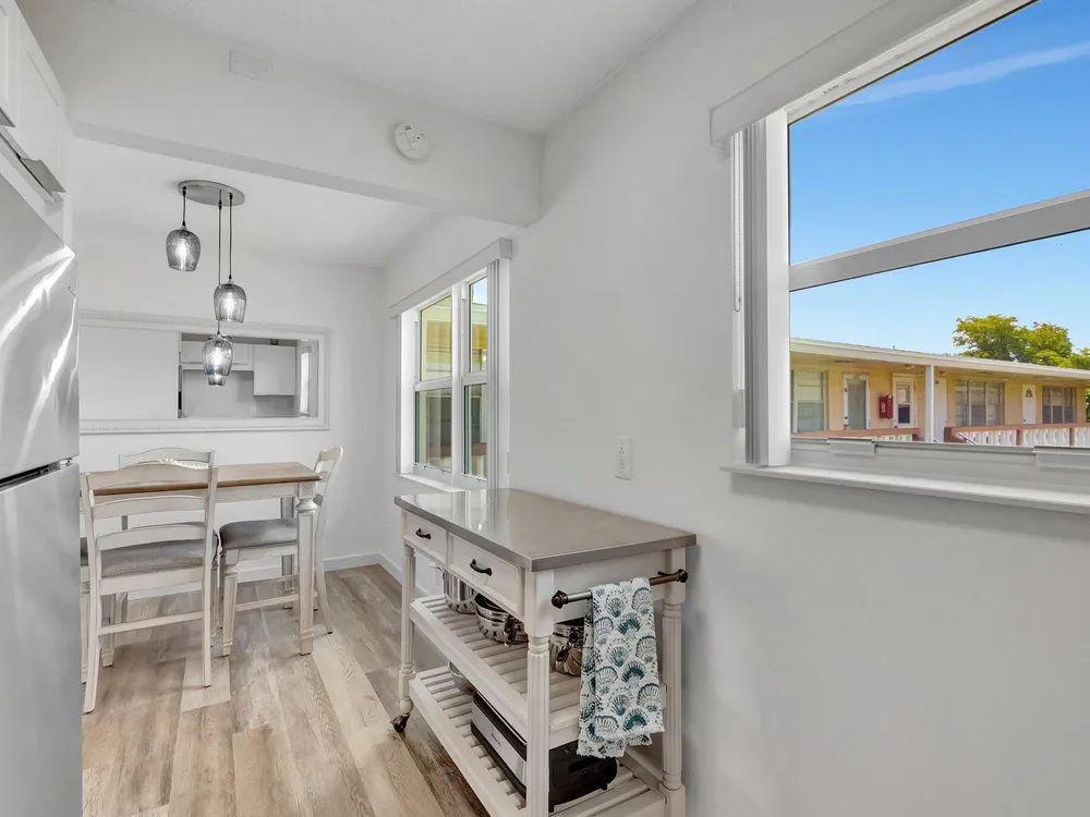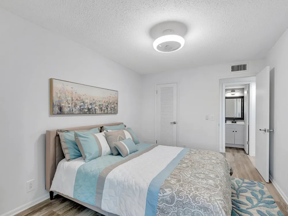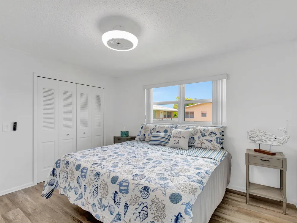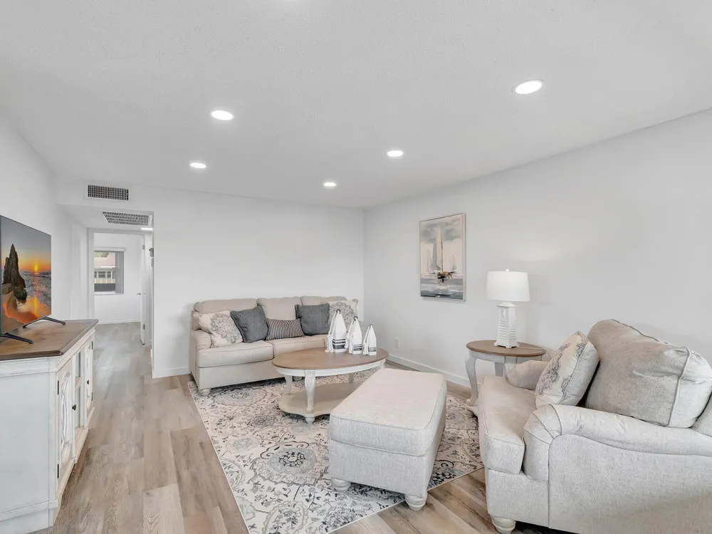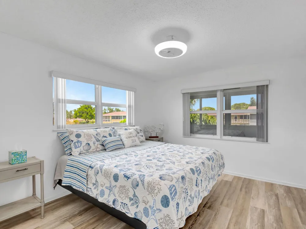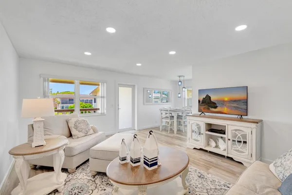 Look no further! Here is the awesomely updated corner unit you have been waiting for. Hurricane windows and doors with UV protection. Custom blinds and marble window sills throughout. New central A/C 2024 & HWH 2025. This unit has it all! Fully furnished with many upgrades including pendant lighting, recessed lighting, Smart T.V., transitional furniture, porcelain tile surround shower. Kitchen has quartz countertops, all new stainless steel appliances. High end LVP flooring throughout. Bonus of an extra long enclosed patio balcony with plexiglass windows and screens. Bedroom with walk-in California closet. Master Bedroom has California closet with king size adjustable bed. Building in great shape with updated roof from 2022. Don't miss this one! It is move in ready and exceptional.