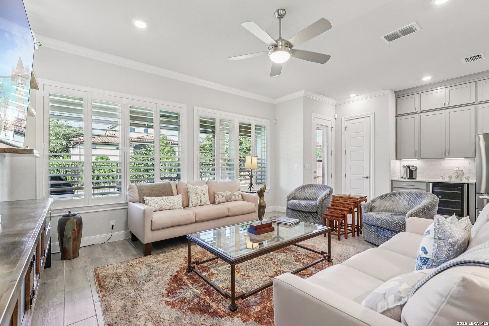 Seller is motivated and will look at all offers. Welcome to your dream oasis! Nestled within the prestigious in the prestigious gated Enclave of Campanas at Cibolo Canyons - a premier luxury community. This with over $55,000 in upgrades this stunning 4 bedroom, 3 bath home showcases an exquisite blend of luxury and functionality, perfect for today's modern family. As you step inside, the open-concept design greets you with elegant tile flooring that flows seamlessly throughout the main living areas. This beautifully appointed home features three spacious bedrooms and two luxurious bathrooms on the main floor, providing comfort and convenience for family and guests alike. The sophisticated dining room, adorned with custom lighting and a built-in buffet, sets the stage for memorable gatherings. The generous kitchen is a chef's delight, equipped with stainless steel appliances, a gas cooktop, and an impressive array of ceiling-height cabinetry for abundant storage. Designer pendant lighting illuminates the space, enhancing the upgraded countertops, while the double pantry and a dedicated butler's area create the perfect coffee bar for your morning routine. The expansive living room is the heart of the home, boasting custom-made floating cabinets and lighted shelves that add a touch of elegance. A breathtaking bank of windows invites the outdoors in, showcasing the serene backyard and leading to an extended covered patio complete with gas plumbing, epoxy flooring and electric screens by Texas Shades, perfect for those warm summer days. For those who work from home, a spacious study offers the ideal space, featuring a built-in desk and bookshelves, allowing you to create a productive and inspiring environment. Throughout the home, plantation shutters provide both elegance and privacy, allowing you to tailor the light as you wish. Retreat to the primary suite that serves as a tranquil sanctuary featuring a large walk-in shower and double vanity. The custom-designed closet and dressing area, featuring built-in dressers, ensure that organization is both effortless and stylish. Ascend to the upper level, where the expansive fourth bedroom awaits, showcasing a custom storage and closet system along one wall, an additional walk-in closet and a versatile full bath. This space can seamlessly transform into a media room, craft room, or game room, offering flexibility for all your lifestyle needs. But that's not all! This home also includes a walk-in attic with easy access via its own staircase in the garage, complete with epoxy flooring, ideal for storing holiday decorations and seasonal items effortlessly. Every inch of this home has been thoughtfully designed with meticulous attention to detail. Don't miss the opportunity to own this incredible property in one of the most sought-after communities.