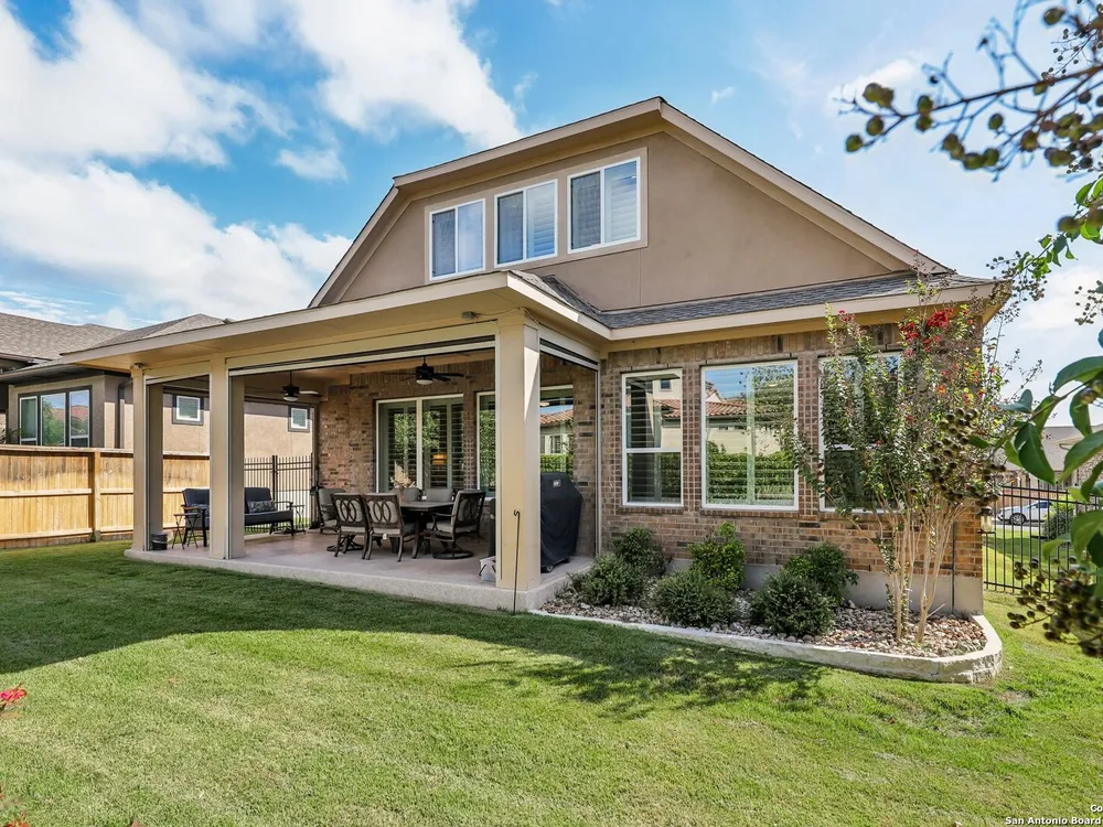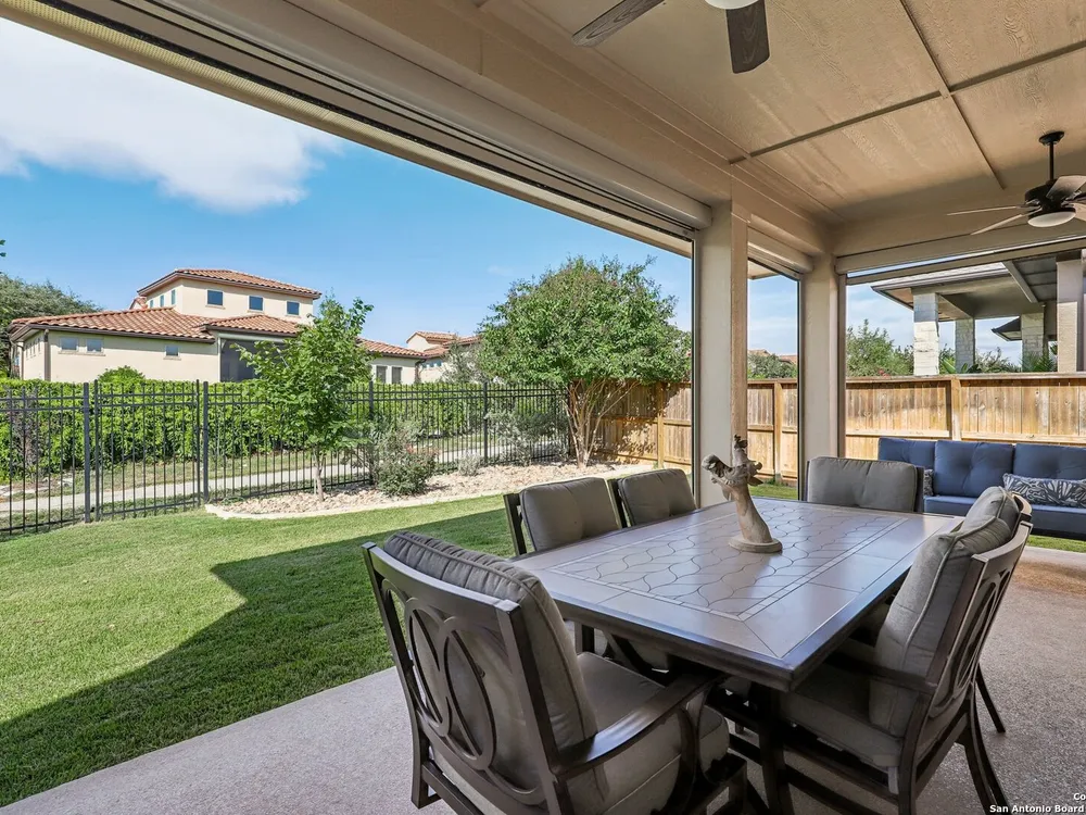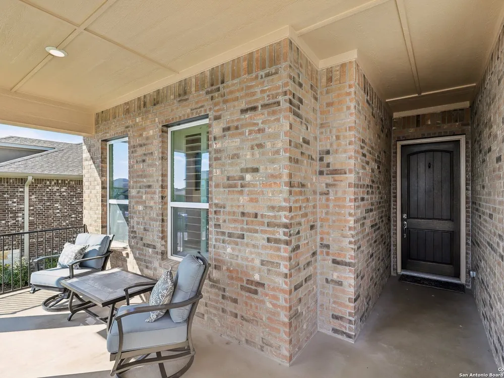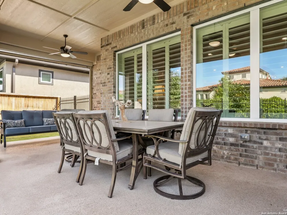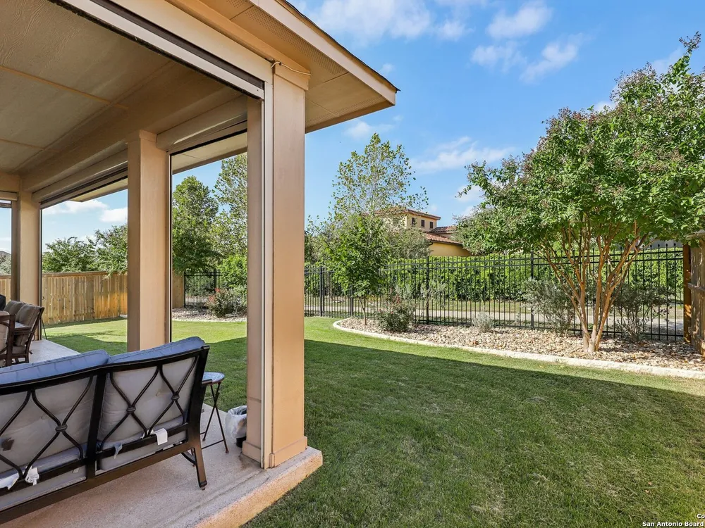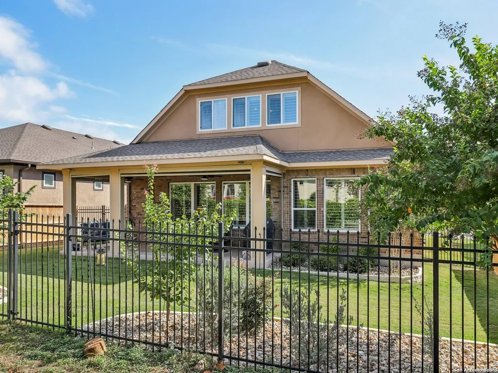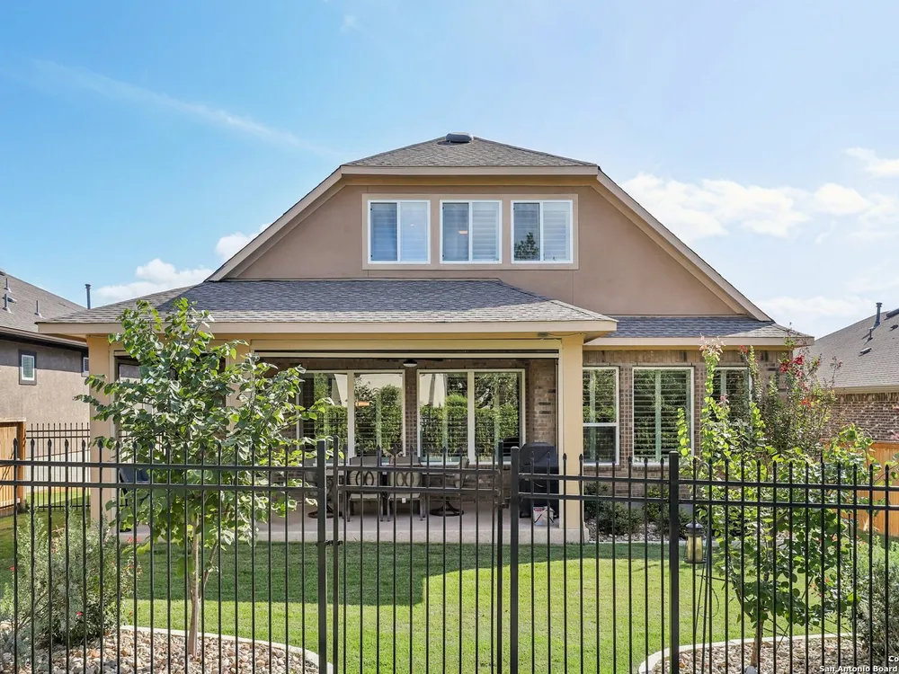 Welcome to your dream oasis! Nestled within the prestigious gated community of Campanas at Cibolo Canyons, this stunning 4 bedroom, 3 bath home showcases an exquisite blend of luxury and functionality, perfect for today's modern family. As you step inside, the open-concept design greets you with elegant tile flooring that flows seamlessly throughout the main living areas. This beautifully appointed home features three spacious bedrooms and two luxurious bathrooms on the main floor, providing comfort and convenience for family and guests alike. The sophisticated dining room, adorned with custom lighting and a built-in buffet, sets the stage for memorable gatherings. The generous kitchen is a chef's delight, equipped with stainless steel appliances, a gas cooktop, and an impressive array of ceiling-height cabinetry for abundant storage. Designer pendant lighting illuminates the space, enhancing the upgraded countertops, while the double pantry and a dedicated butler's area create the perfect coffee bar for your morning routine. The expansive living room is the heart of the home, boasting custom-made floating cabinets and lighted shelves that add a touch of elegance. A breathtaking bank of windows invites the outdoors in, showcasing the serene backyard and leading to an extended covered patio complete with gas plumbing, epoxy flooring and electric screens by Texas Shades, perfect for those warm summer days. For those who work from home, a spacious study offers the ideal space, featuring a built-in desk and bookshelves, allowing you to create a productive and inspiring environment. Throughout the home, plantation shutters provide both elegance and privacy, allowing you to tailor the light as you wish. Retreat to the primary suite that serves as a tranquil sanctuary featuring a large walk-in shower and double vanity. The custom-designed closet and dressing area, featuring built-in dressers, ensure that organization is both effortless and stylish. Ascend to the upper level, where the expansive fourth bedroom awaits, showcasing a custom storage and closet system along one wall, an additional walk-in closet and a versatile full bath. This space can seamlessly transform into a media room, craft room, or game room, offering flexibility for all your lifestyle needs. But that's not all! This home also includes a walk-in attic with easy access via its own staircase in the garage, complete with epoxy flooring, ideal for storing holiday decorations and seasonal items effortlessly. Every inch of this home has been thoughtfully designed with meticulous attention to detail. Don't miss the opportunity to own this incredible property in one of the most sought-after communities.