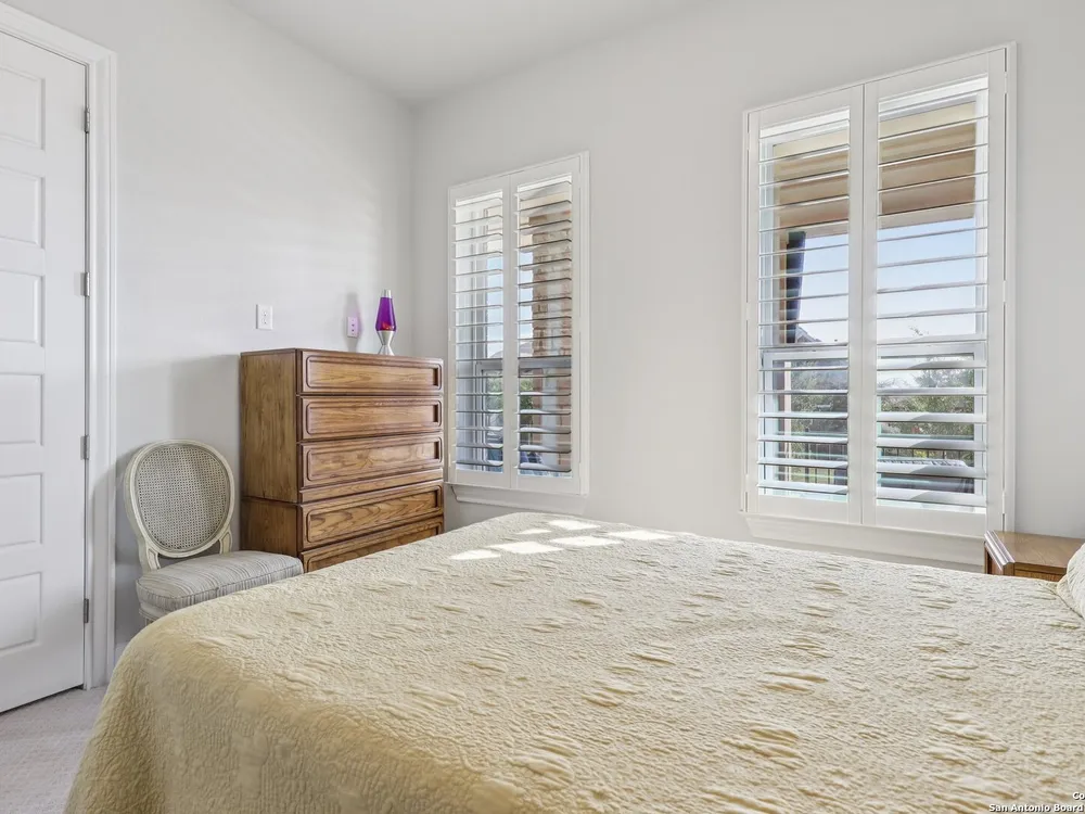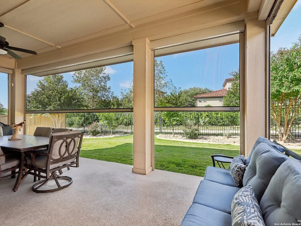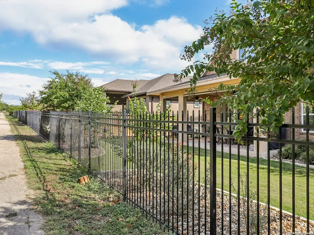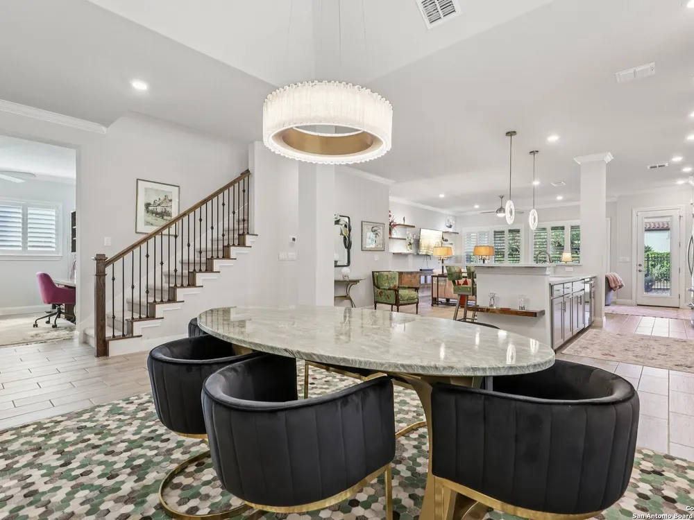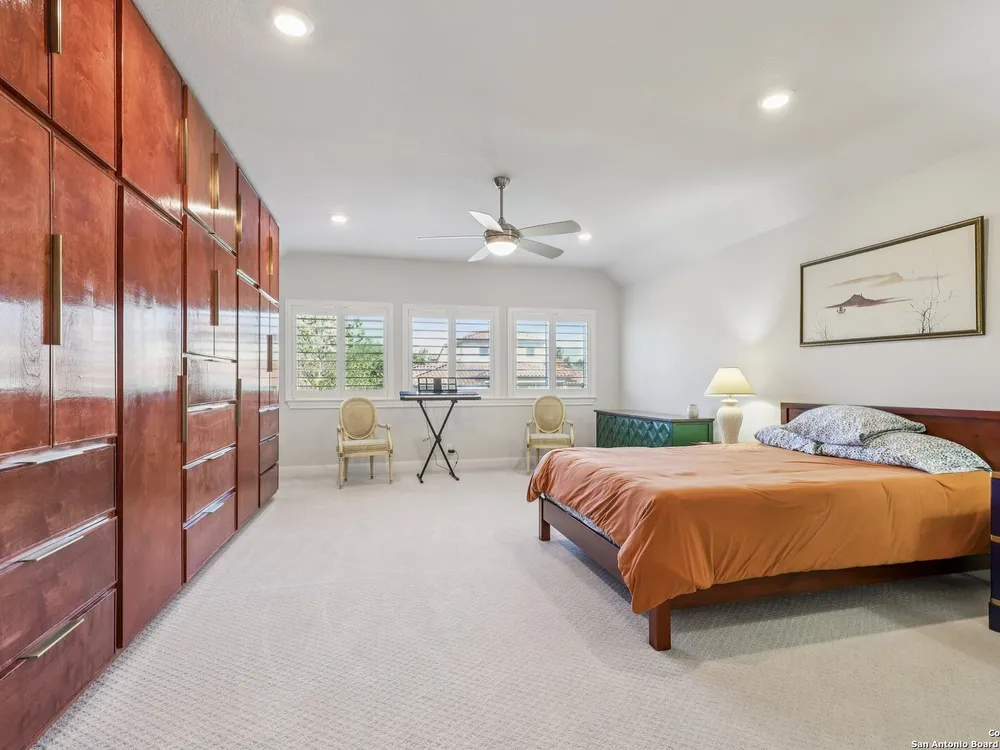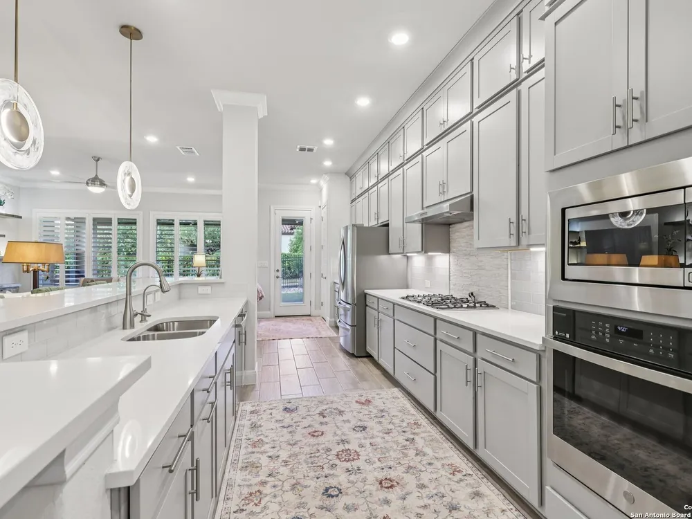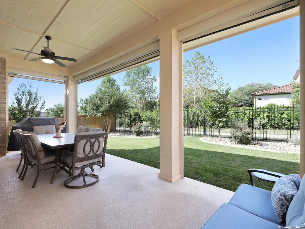 Welcome to your dream oasis! Nestled within the prestigious gated community of Campanas at Cibolo Canyons, this stunning 4 bedroom, 3 bath home showcases an exquisite blend of luxury and functionality, perfect for today's modern family. As you step inside, the open-concept design greets you with elegant tile flooring that flows seamlessly throughout the main living areas. This beautifully appointed home features three spacious bedrooms and two luxurious bathrooms on the main floor, providing comfort and convenience for family and guests alike. The sophisticated dining room, adorned with custom lighting and a built-in buffet, sets the stage for memorable gatherings. The generous kitchen is a chef's delight, equipped with stainless steel appliances, a gas cooktop, and an impressive array of ceiling-height cabinetry for abundant storage. Designer pendant lighting illuminates the space, enhancing the upgraded countertops, while the double pantry and a dedicated butler's area create the perfect coffee bar for your morning routine. The expansive living room is the heart of the home, boasting custom-made floating cabinets and lighted shelves that add a touch of elegance. A breathtaking bank of windows invites the outdoors in, showcasing the serene backyard and leading to an extended covered patio complete with gas plumbing, epoxy flooring and electric screens by Texas Shades, perfect for those warm summer days. For those who work from home, a spacious study offers the ideal space, featuring a built-in desk and bookshelves, allowing you to create a productive and inspiring environment. Throughout the home, plantation shutters provide both elegance and privacy, allowing you to tailor the light as you wish. Retreat to the primary suite that serves as a tranquil sanctuary featuring a large walk-in shower and double vanity. The custom-designed closet and dressing area, featuring built-in dressers, ensure that organization is both effortless and stylish. Ascend to the upper level, where the expansive fourth bedroom awaits, showcasing a custom storage and closet system along one wall, an additional walk-in closet and a versatile full bath. This space can seamlessly transform into a media room, craft room, or game room, offering flexibility for all your lifestyle needs. But that's not all! This home also includes a walk-in attic with easy access via its own staircase in the garage, complete with epoxy flooring, ideal for storing holiday decorations and seasonal items effortlessly. Every inch of this home has been thoughtfully designed with meticulous attention to detail. Don't miss the opportunity to own this incredible property in one of the most sought-after communities.