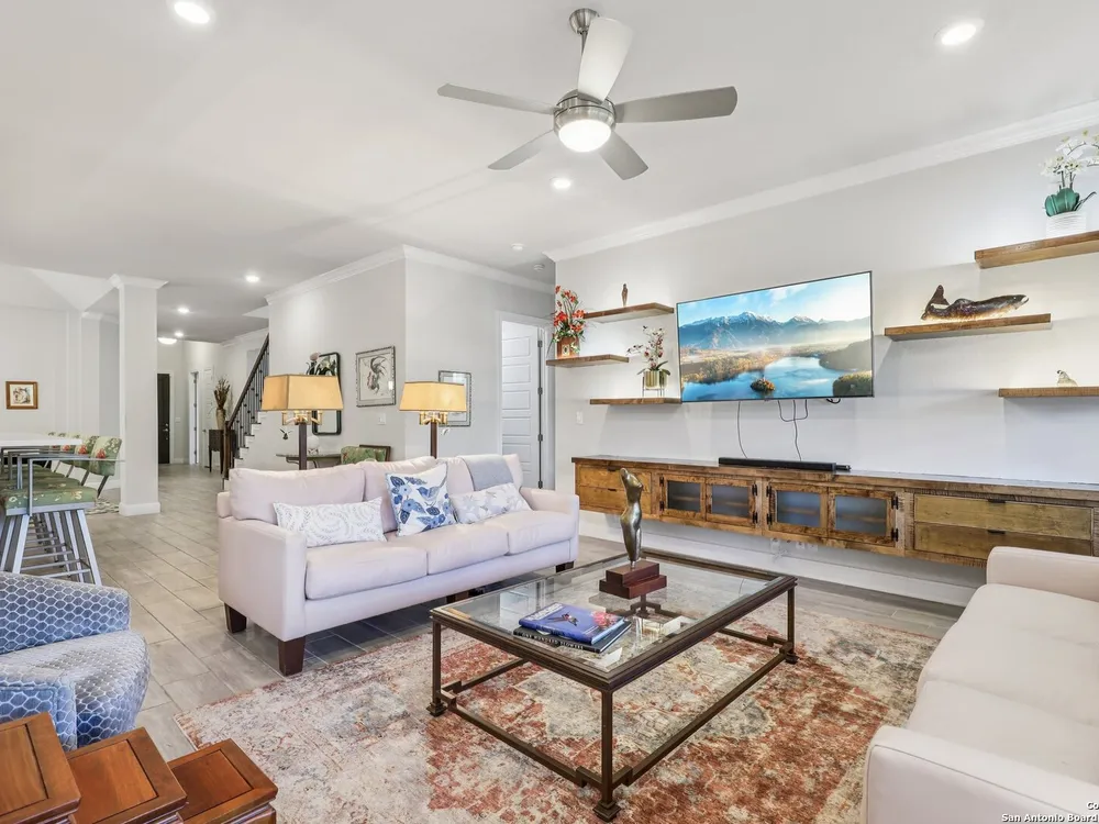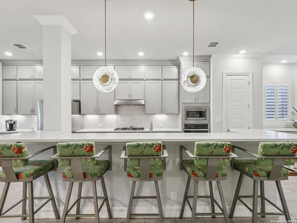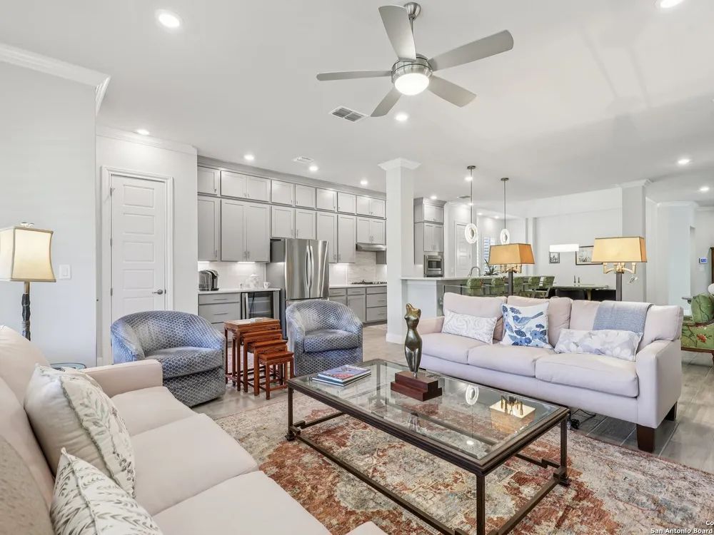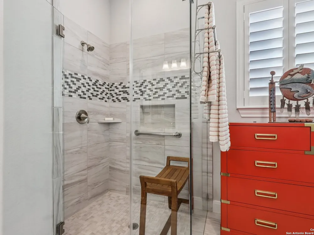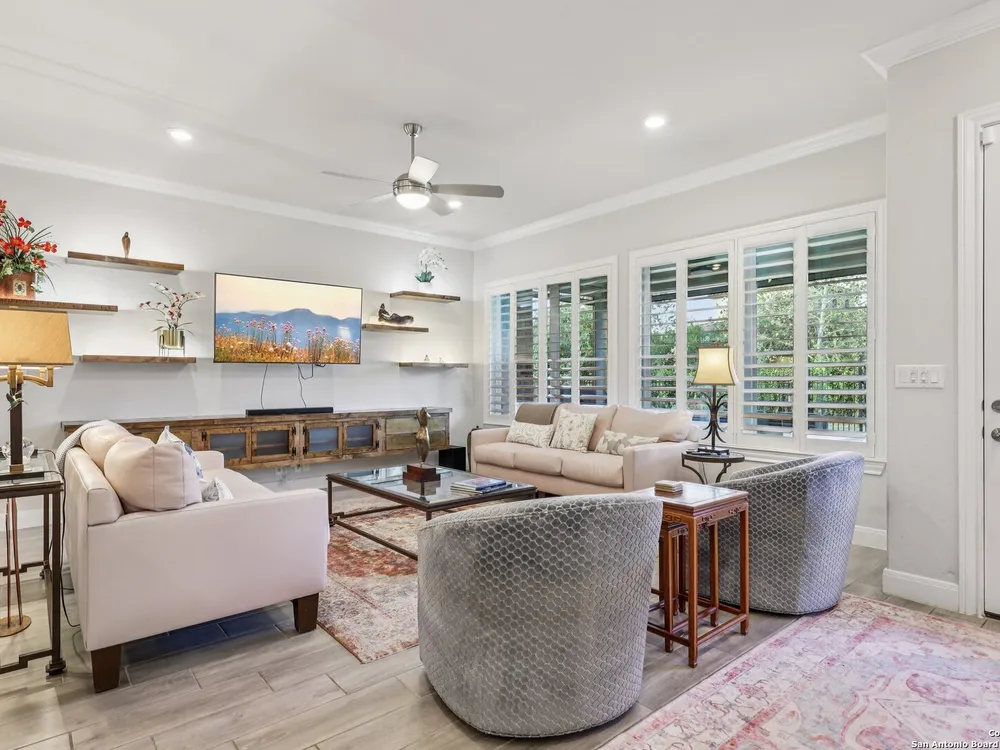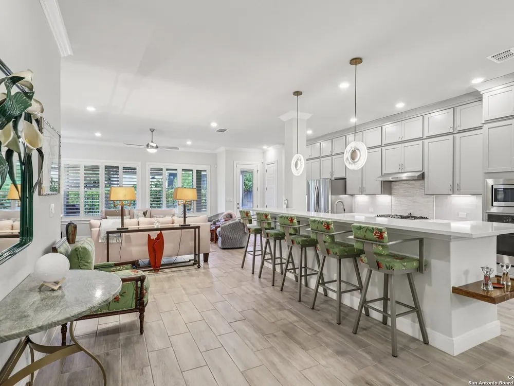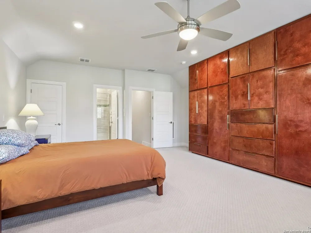 Welcome to your dream oasis! Nestled within the prestigious gated community of Campanas at Cibolo Canyons, this stunning 4 bedroom, 3 bath home showcases an exquisite blend of luxury and functionality, perfect for today's modern family. As you step inside, the open-concept design greets you with elegant tile flooring that flows seamlessly throughout the main living areas. This beautifully appointed home features three spacious bedrooms and two luxurious bathrooms on the main floor, providing comfort and convenience for family and guests alike. The sophisticated dining room, adorned with custom lighting and a built-in buffet, sets the stage for memorable gatherings. The generous kitchen is a chef's delight, equipped with stainless steel appliances, a gas cooktop, and an impressive array of ceiling-height cabinetry for abundant storage. Designer pendant lighting illuminates the space, enhancing the upgraded countertops, while the double pantry and a dedicated butler's area create the perfect coffee bar for your morning routine. The expansive living room is the heart of the home, boasting custom-made floating cabinets and lighted shelves that add a touch of elegance. A breathtaking bank of windows invites the outdoors in, showcasing the serene backyard and leading to an extended covered patio complete with gas plumbing, epoxy flooring and electric screens by Texas Shades, perfect for those warm summer days. For those who work from home, a spacious study offers the ideal space, featuring a built-in desk and bookshelves, allowing you to create a productive and inspiring environment. Throughout the home, plantation shutters provide both elegance and privacy, allowing you to tailor the light as you wish. Retreat to the primary suite that serves as a tranquil sanctuary featuring a large walk-in shower and double vanity. The custom-designed closet and dressing area, featuring built-in dressers, ensure that organization is both effortless and stylish. Ascend to the upper level, where the expansive fourth bedroom awaits, showcasing a custom storage and closet system along one wall, an additional walk-in closet and a versatile full bath. This space can seamlessly transform into a media room, craft room, or game room, offering flexibility for all your lifestyle needs. But that's not all! This home also includes a walk-in attic with easy access via its own staircase in the garage, complete with epoxy flooring, ideal for storing holiday decorations and seasonal items effortlessly. Every inch of this home has been thoughtfully designed with meticulous attention to detail. Don't miss the opportunity to own this incredible property in one of the most sought-after communities.