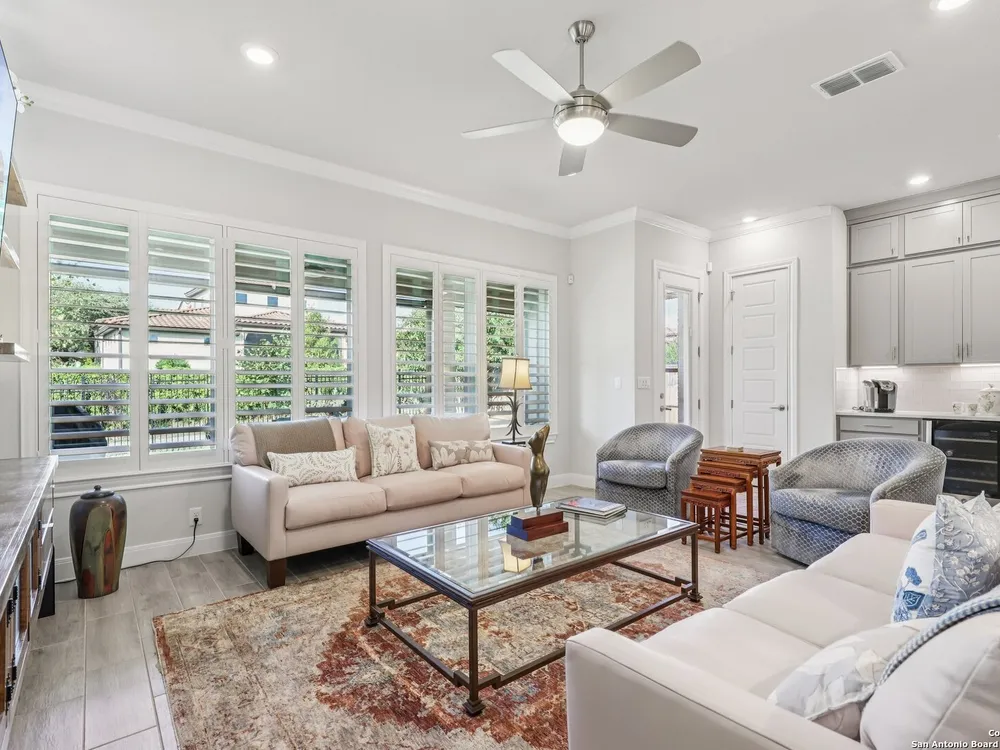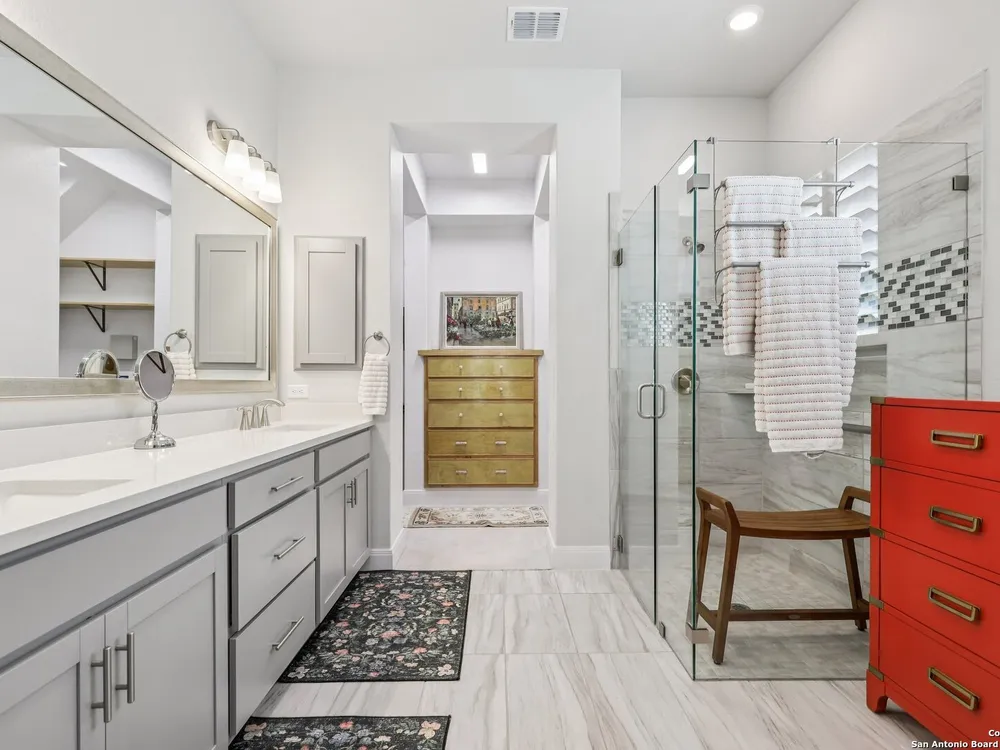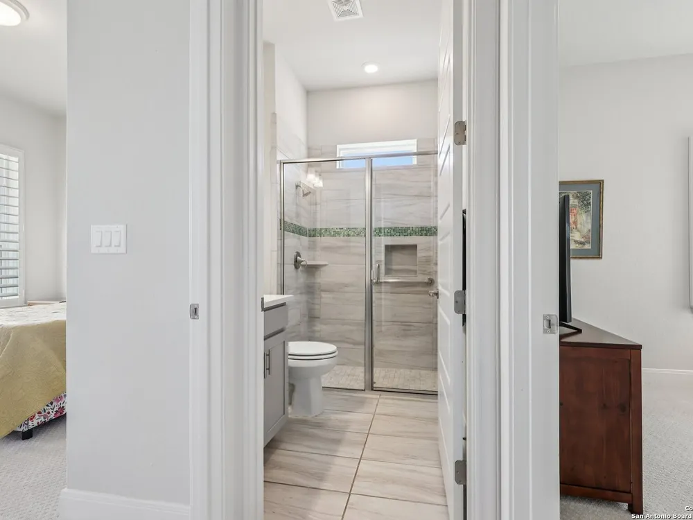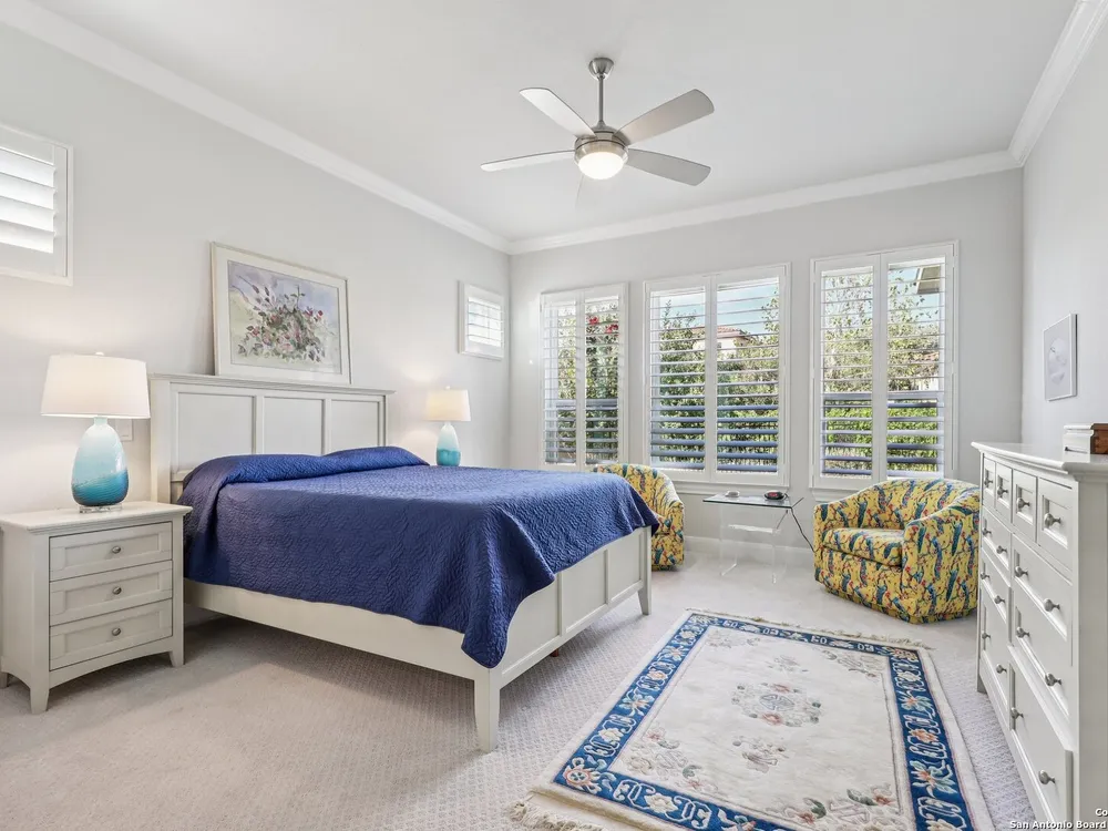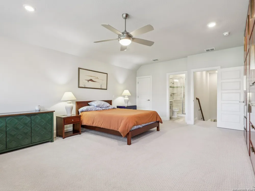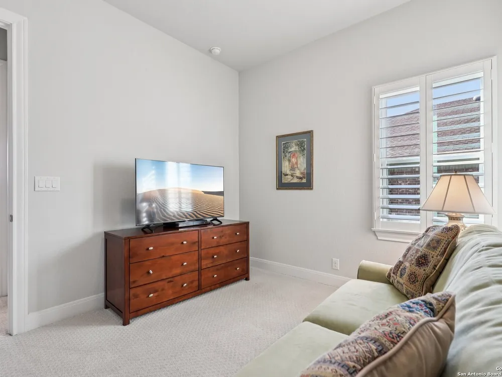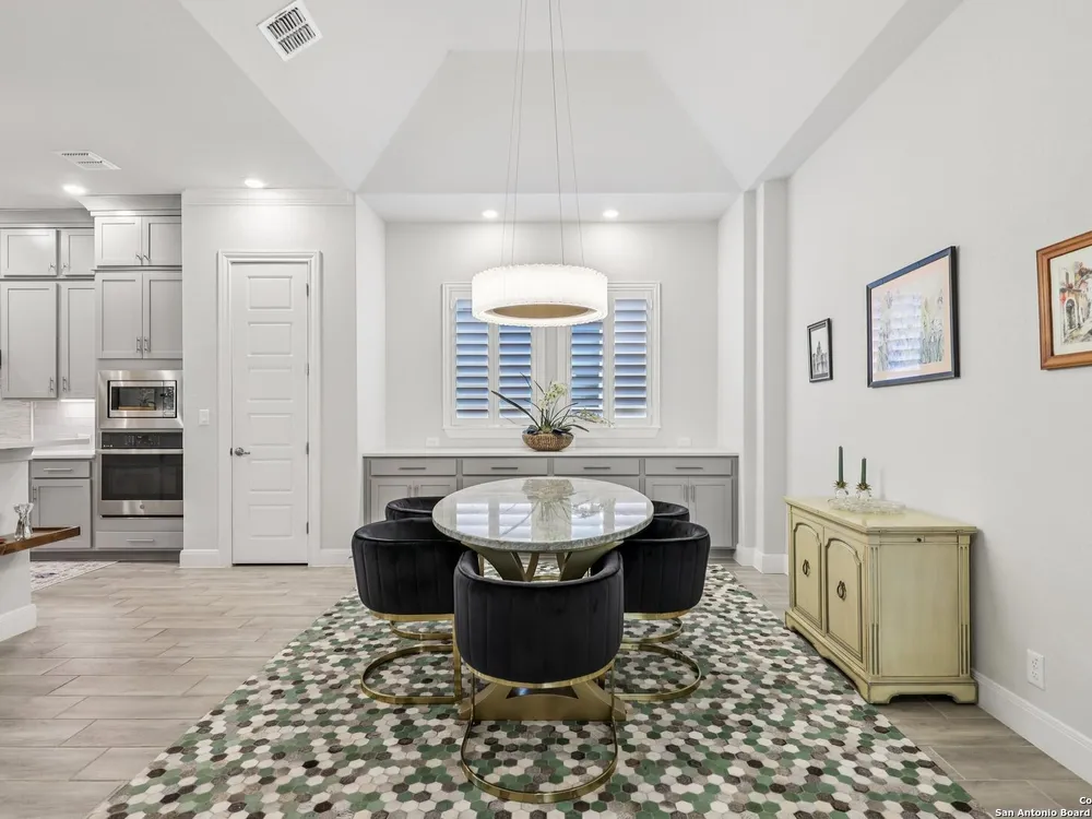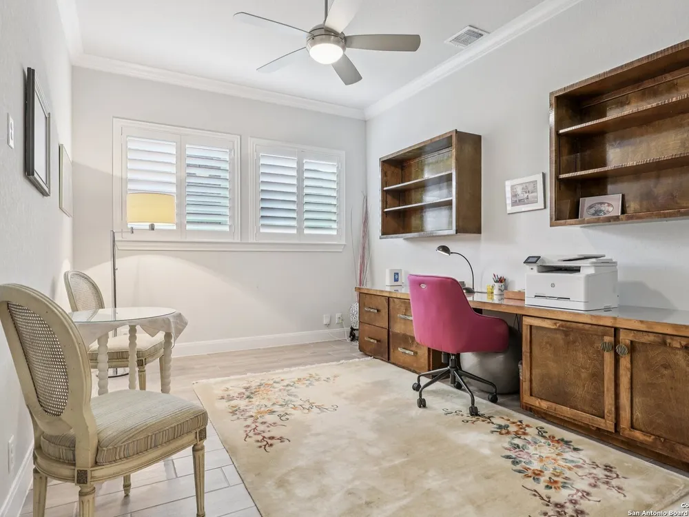 Welcome to your dream oasis! Nestled within the prestigious gated community of Campanas at Cibolo Canyons, this stunning 4 bedroom, 3 bath home showcases an exquisite blend of luxury and functionality, perfect for today's modern family. As you step inside, the open-concept design greets you with elegant tile flooring that flows seamlessly throughout the main living areas. This beautifully appointed home features three spacious bedrooms and two luxurious bathrooms on the main floor, providing comfort and convenience for family and guests alike. The sophisticated dining room, adorned with custom lighting and a built-in buffet, sets the stage for memorable gatherings. The generous kitchen is a chef's delight, equipped with stainless steel appliances, a gas cooktop, and an impressive array of ceiling-height cabinetry for abundant storage. Designer pendant lighting illuminates the space, enhancing the upgraded countertops, while the double pantry and a dedicated butler's area create the perfect coffee bar for your morning routine. The expansive living room is the heart of the home, boasting custom-made floating cabinets and lighted shelves that add a touch of elegance. A breathtaking bank of windows invites the outdoors in, showcasing the serene backyard and leading to an extended covered patio complete with gas plumbing, epoxy flooring and electric screens by Texas Shades, perfect for those warm summer days. For those who work from home, a spacious study offers the ideal space, featuring a built-in desk and bookshelves, allowing you to create a productive and inspiring environment. Throughout the home, plantation shutters provide both elegance and privacy, allowing you to tailor the light as you wish. Retreat to the primary suite that serves as a tranquil sanctuary featuring a large walk-in shower and double vanity. The custom-designed closet and dressing area, featuring built-in dressers, ensure that organization is both effortless and stylish. Ascend to the upper level, where the expansive fourth bedroom awaits, showcasing a custom storage and closet system along one wall, an additional walk-in closet and a versatile full bath. This space can seamlessly transform into a media room, craft room, or game room, offering flexibility for all your lifestyle needs. But that's not all! This home also includes a walk-in attic with easy access via its own staircase in the garage, complete with epoxy flooring, ideal for storing holiday decorations and seasonal items effortlessly. Every inch of this home has been thoughtfully designed with meticulous attention to detail. Don't miss the opportunity to own this incredible property in one of the most sought-after communities.
