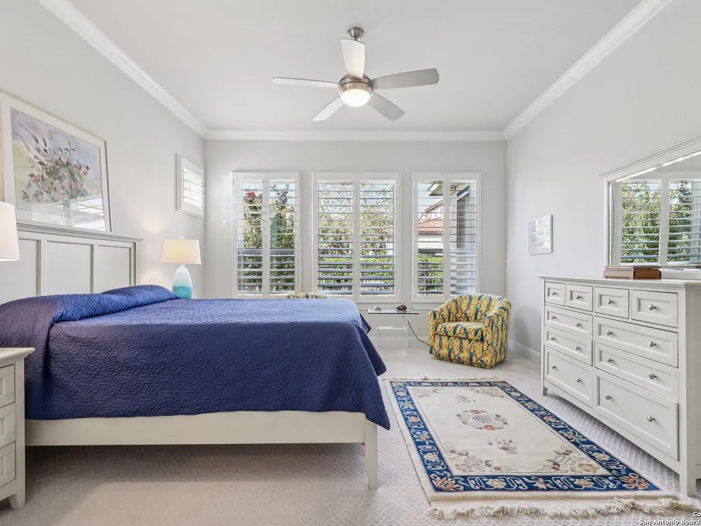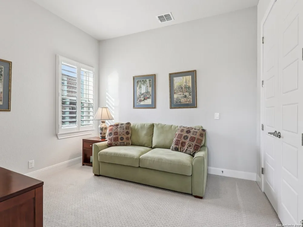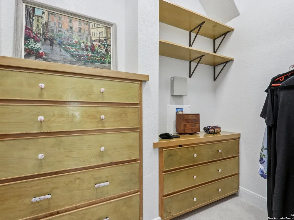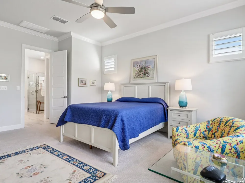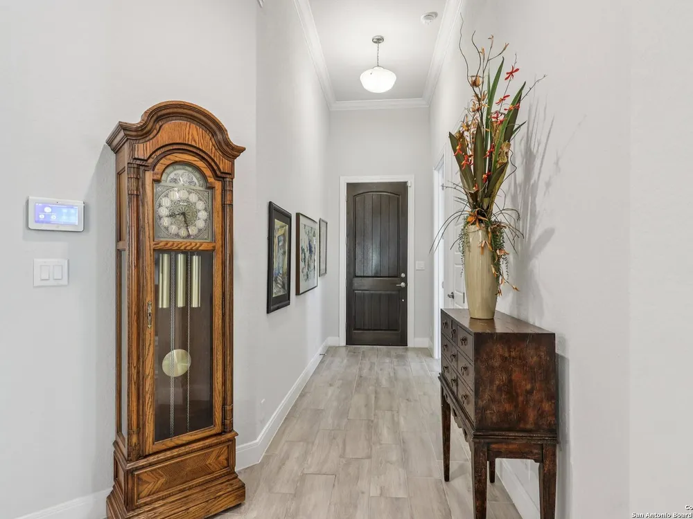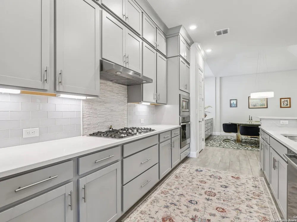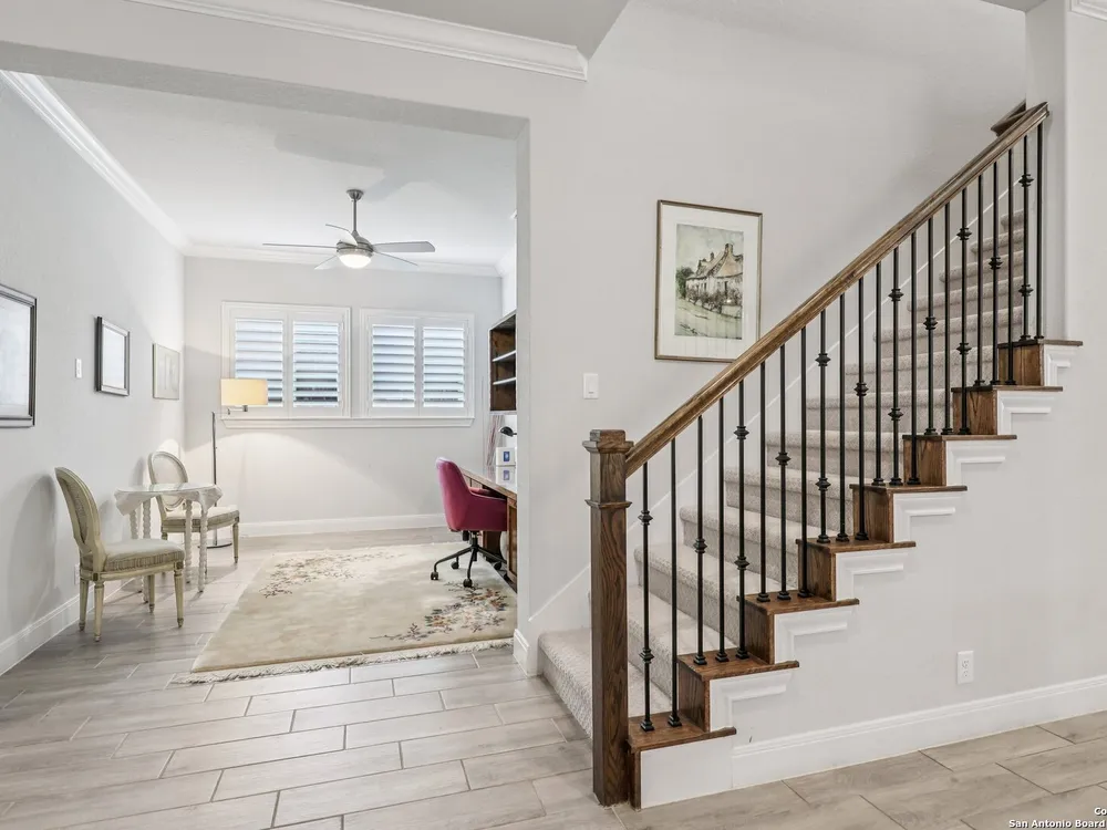 Welcome to your dream oasis! Nestled within the prestigious gated community of Campanas at Cibolo Canyons, this stunning 4 bedroom, 3 bath home showcases an exquisite blend of luxury and functionality, perfect for today's modern family. As you step inside, the open-concept design greets you with elegant tile flooring that flows seamlessly throughout the main living areas. This beautifully appointed home features three spacious bedrooms and two luxurious bathrooms on the main floor, providing comfort and convenience for family and guests alike. The sophisticated dining room, adorned with custom lighting and a built-in buffet, sets the stage for memorable gatherings. The generous kitchen is a chef's delight, equipped with stainless steel appliances, a gas cooktop, and an impressive array of ceiling-height cabinetry for abundant storage. Designer pendant lighting illuminates the space, enhancing the upgraded countertops, while the double pantry and a dedicated butler's area create the perfect coffee bar for your morning routine. The expansive living room is the heart of the home, boasting custom-made floating cabinets and lighted shelves that add a touch of elegance. A breathtaking bank of windows invites the outdoors in, showcasing the serene backyard and leading to an extended covered patio complete with gas plumbing, epoxy flooring and electric screens by Texas Shades, perfect for those warm summer days. For those who work from home, a spacious study offers the ideal space, featuring a built-in desk and bookshelves, allowing you to create a productive and inspiring environment. Throughout the home, plantation shutters provide both elegance and privacy, allowing you to tailor the light as you wish. Retreat to the primary suite that serves as a tranquil sanctuary featuring a large walk-in shower and double vanity. The custom-designed closet and dressing area, featuring built-in dressers, ensure that organization is both effortless and stylish. Ascend to the upper level, where the expansive fourth bedroom awaits, showcasing a custom storage and closet system along one wall, an additional walk-in closet and a versatile full bath. This space can seamlessly transform into a media room, craft room, or game room, offering flexibility for all your lifestyle needs. But that's not all! This home also includes a walk-in attic with easy access via its own staircase in the garage, complete with epoxy flooring, ideal for storing holiday decorations and seasonal items effortlessly. Every inch of this home has been thoughtfully designed with meticulous attention to detail. Don't miss the opportunity to own this incredible property in one of the most sought-after communities.