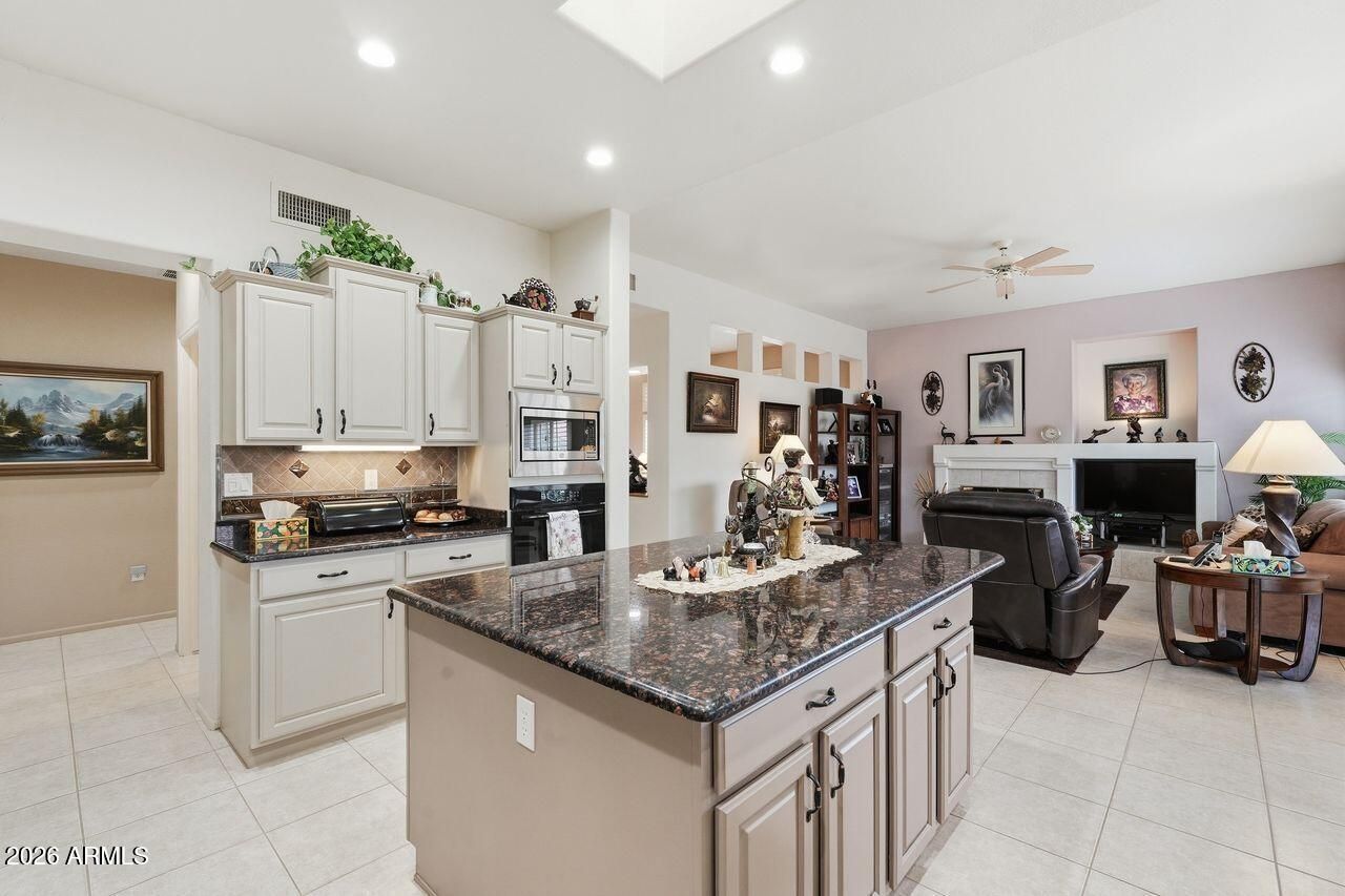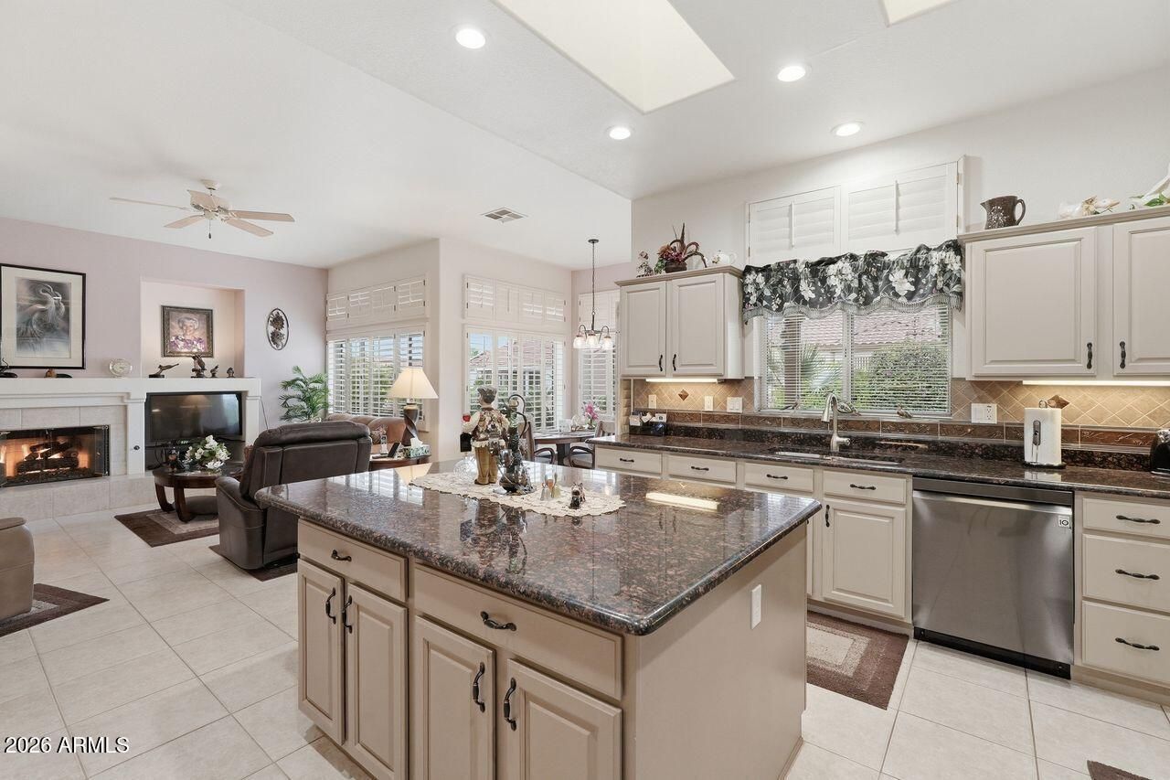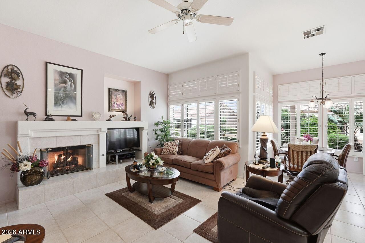 Upgraded Spacious Home w/ Charm offers two bedrooms and two and a half bathrooms. The open floorplan features a spacious kitchen with a large island, granite countertops, refinished cabinets, and a tiled backsplash. The breakfast nook provides access to the backyard, which includes a covered patio, pavers, and a fountain. Throughout the home, there are skylights, sunscreens, and plantation shutters. The Arizona room has a gas fireplace, and the home office includes a built-in desk. The powder room and custom vanities showcase designer touches. Recent home improvements include Lennox HVAC units installed in 2017, roof underlayment replacement in 2018, and additional insulation added in 2023. This home is situated in an excellent location and features a popular floorplan.