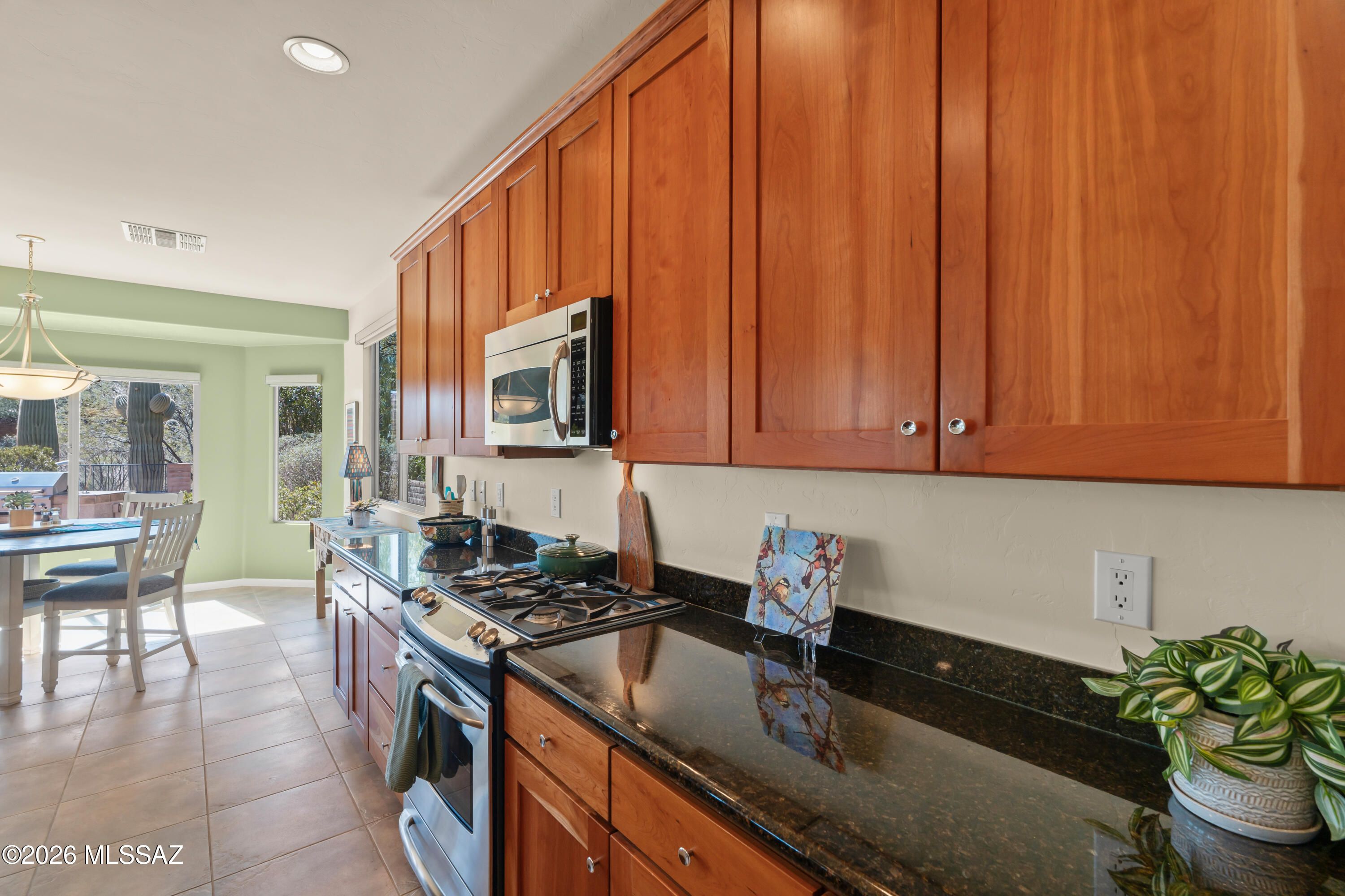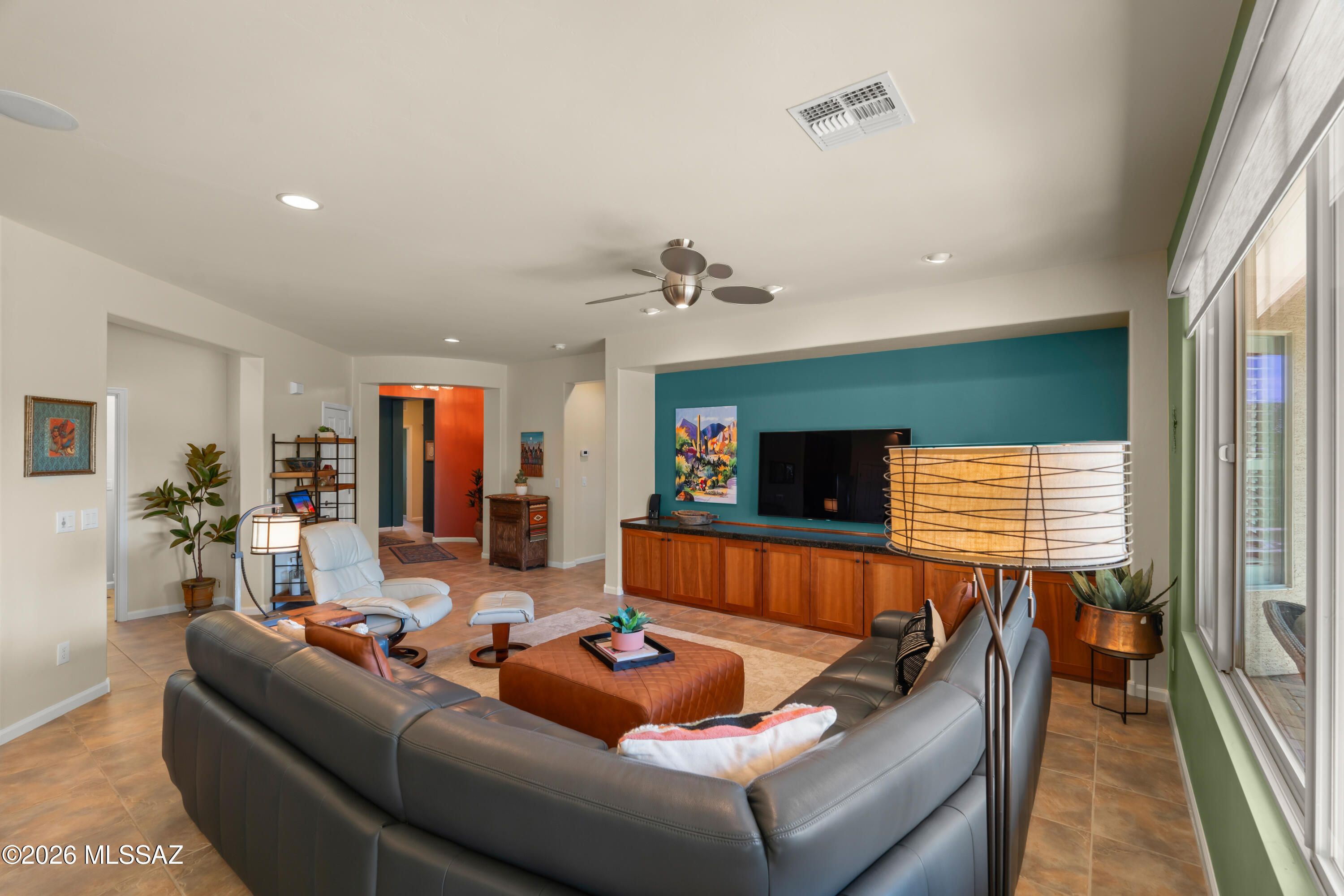 Located in the beautiful, active adult lifestyle community of Quail Creek Country Club, this elegantly appointed Newport model offers quality upgrades throughout. Featuring 2 bedrooms, 2 full bathrooms, a versatile den, and a golf cart garage, this home is perfectly designed for Arizona-style living. Situated on a desirable corner lot, the property captures stunning southern mountain views while providing exceptional privacy.The curved foyer entryway creates an elegant first impression and sets the tone for the home's refined finishes. From the moment you enter, you'll appreciate the spacious great room design. An expansive, open living area seamlessly connected to the kitchen.