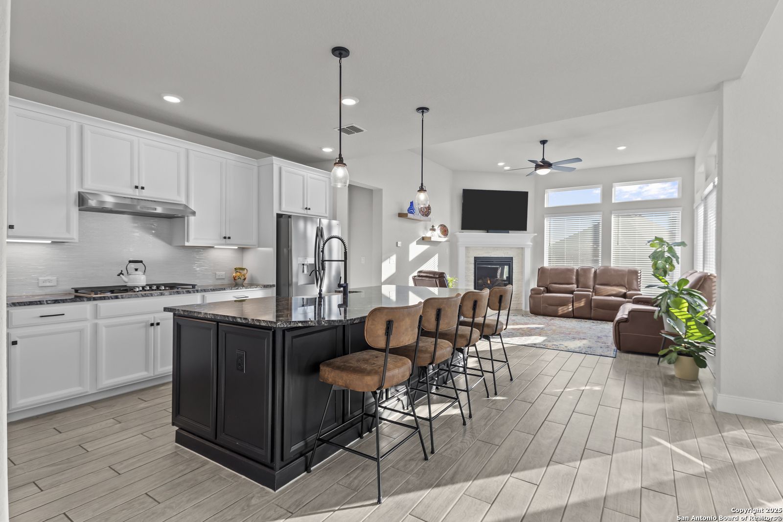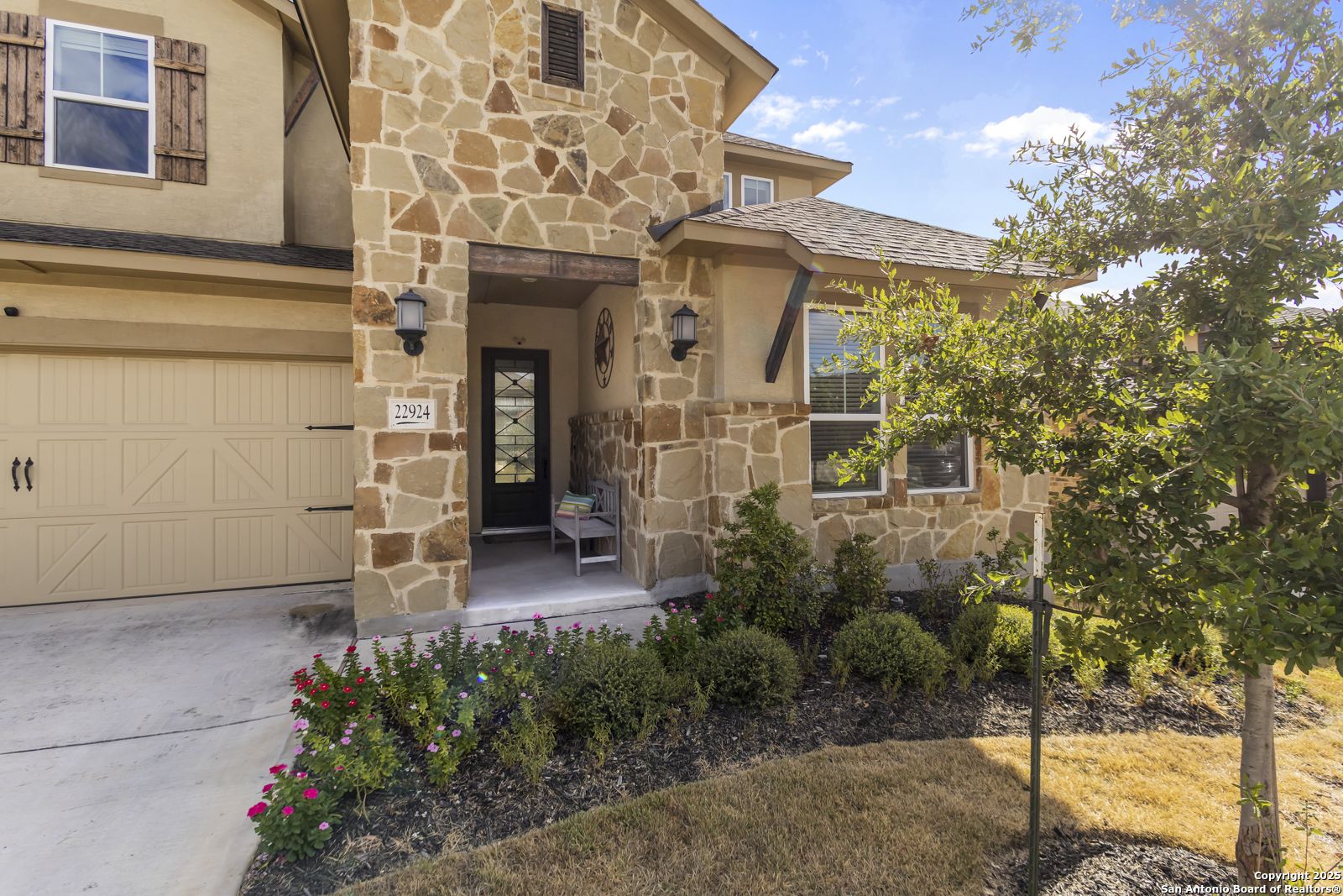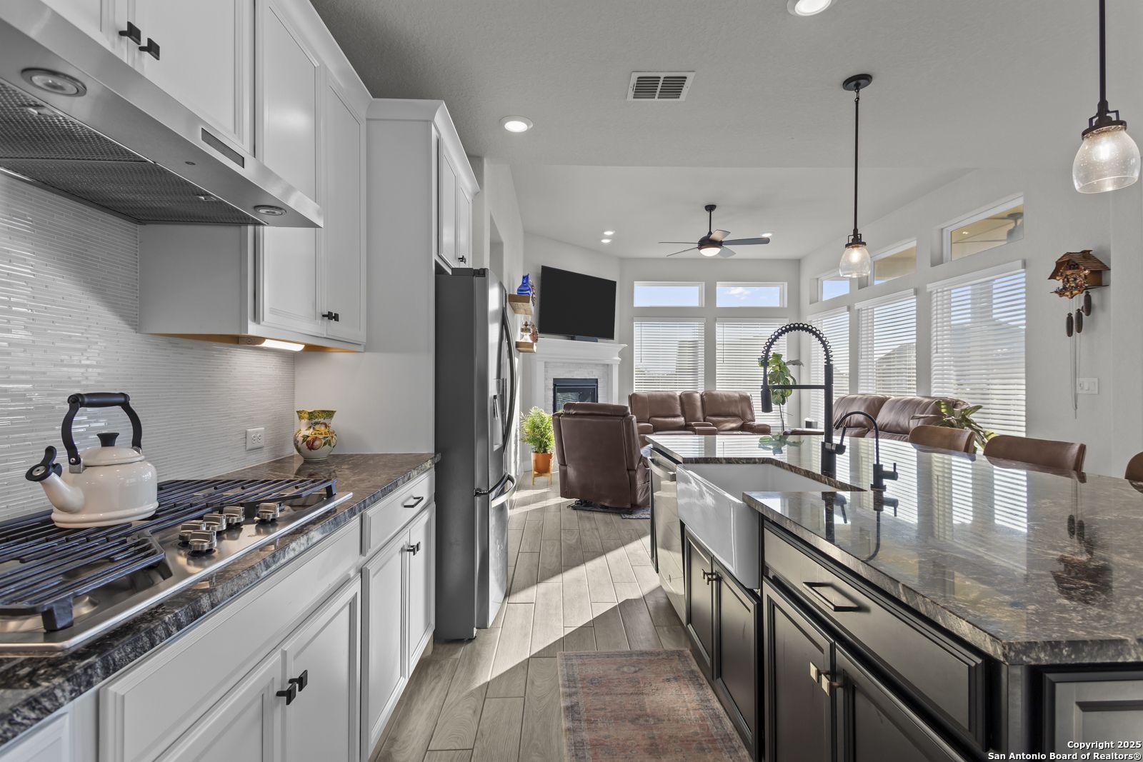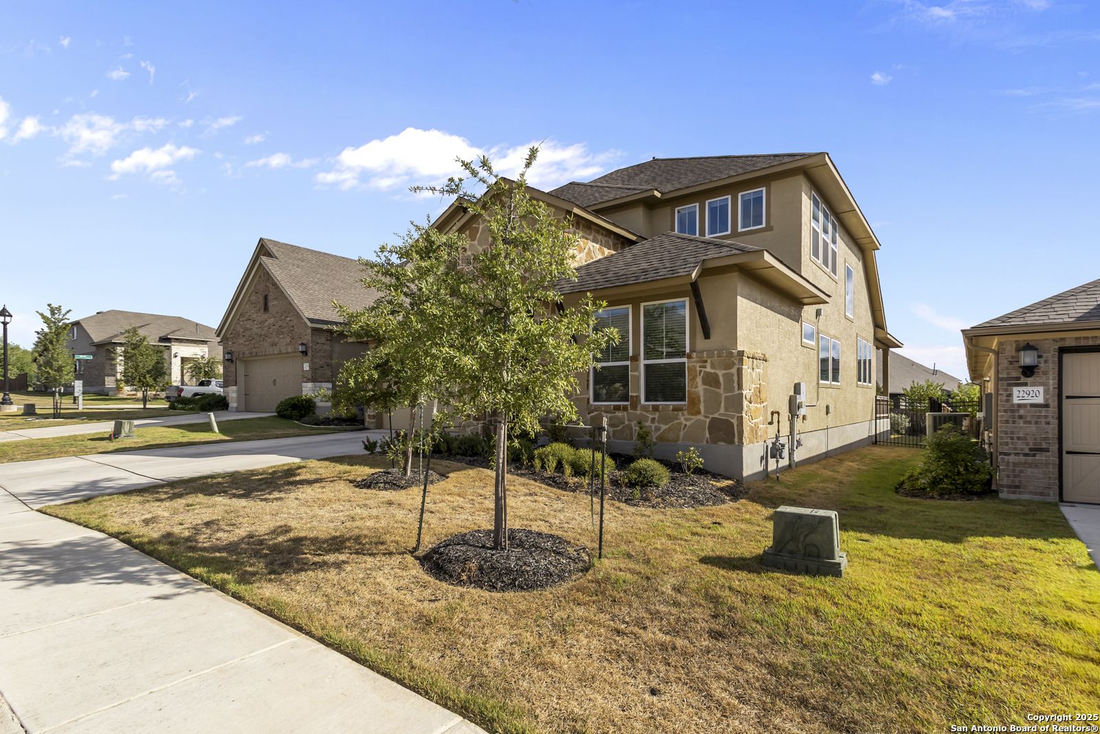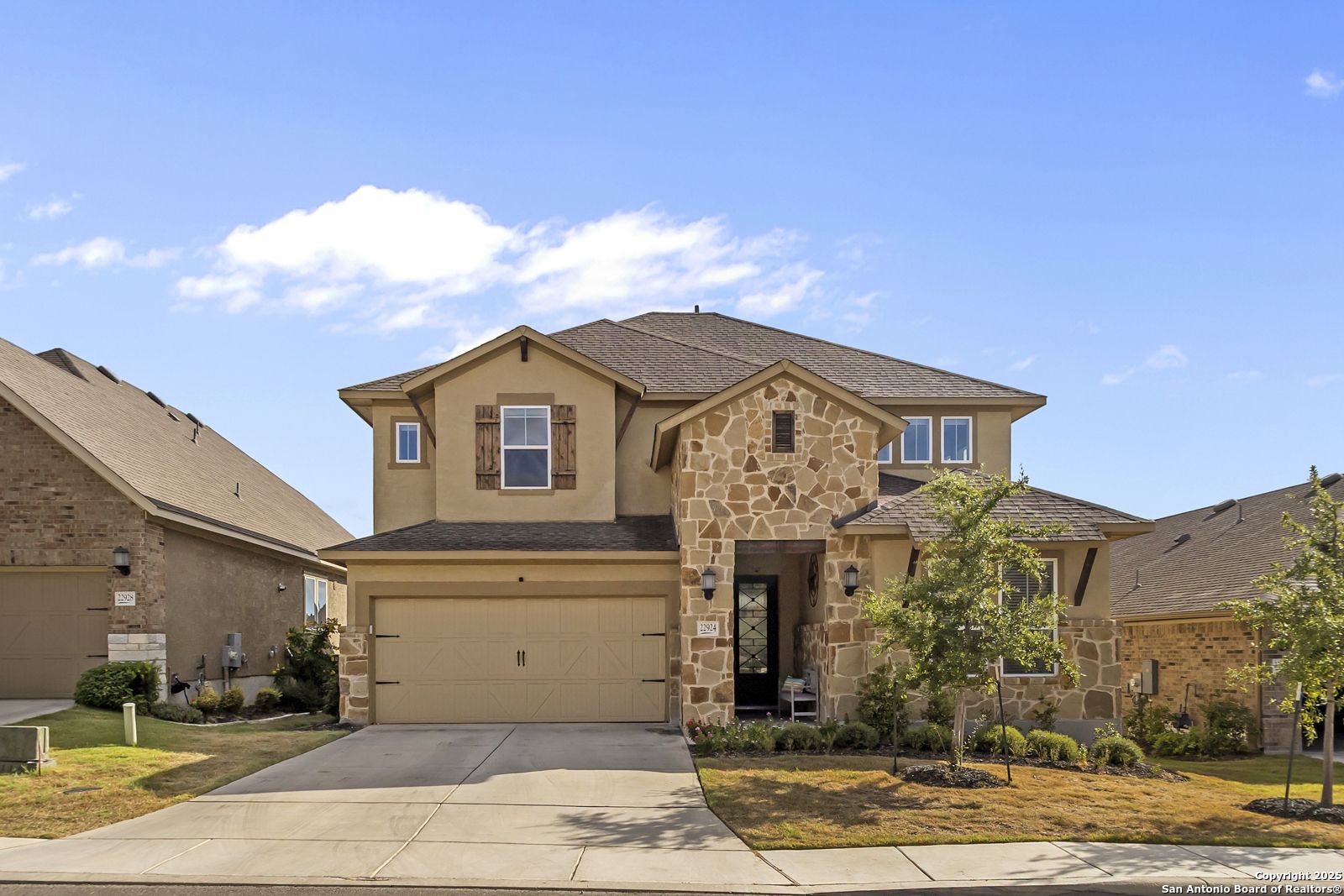 Welcome to 22924 Grande Vista, a striking, modern home in the coveted Campanas at Cibolo Canyons community. Built in 2022 and spanning approximately 2,733 square feet, this residence blends fresh finishes with timeless design and offers an ideal layout for both entertaining and everyday living. Step inside to discover a chef's dream kitchen featuring crisp white 42-inch cabinets, bold black and white granite countertops, and a farmhouse apron-front sink. The kitchen is open to the living and dining areas, allowing natural light to flood the space through expansive windows and creating a seamless flow between the rooms. The oversized island, pendant lighting, and thoughtful layout make this home ideal for hosting gatherings or relaxing with loved ones. One of the highlights of this home is the main-level master suite. This luxurious retreat includes a separate soaking tub and walk-in shower, dual vanities, and a generous walk-in closet. The additional bedrooms and baths are well appointed and designed for comfort. A versatile loft upstairs offers space for a media area, home office, or play zone. Outside, a covered back porch with a ceiling fan overlooks your oversized backyard, a private sanctuary ready for gardens, play, or quiet evenings under the Texas sky. Located under the sweeping Hill Country skies and just minutes from shops, dining, and major corridors, this home offers an elevated lifestyle with easy access to San Antonio and beyond.
