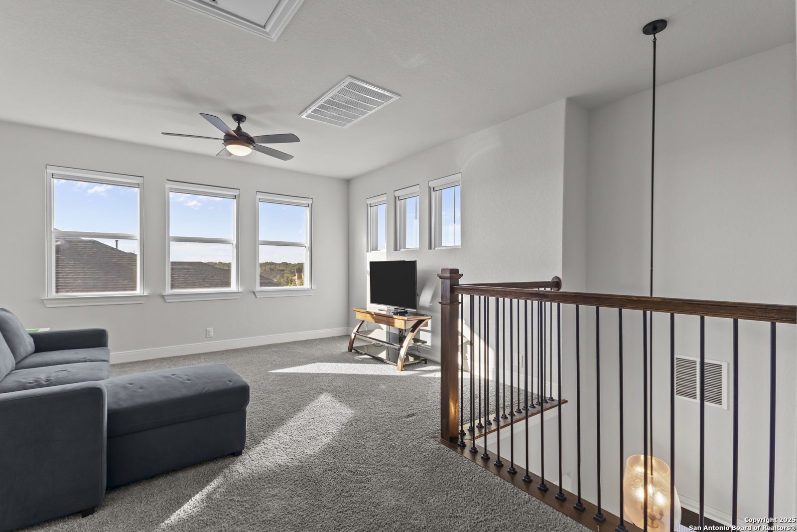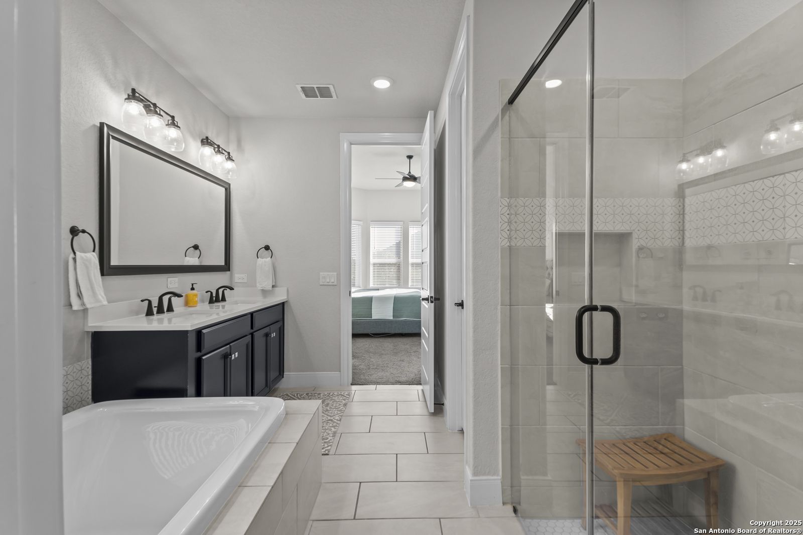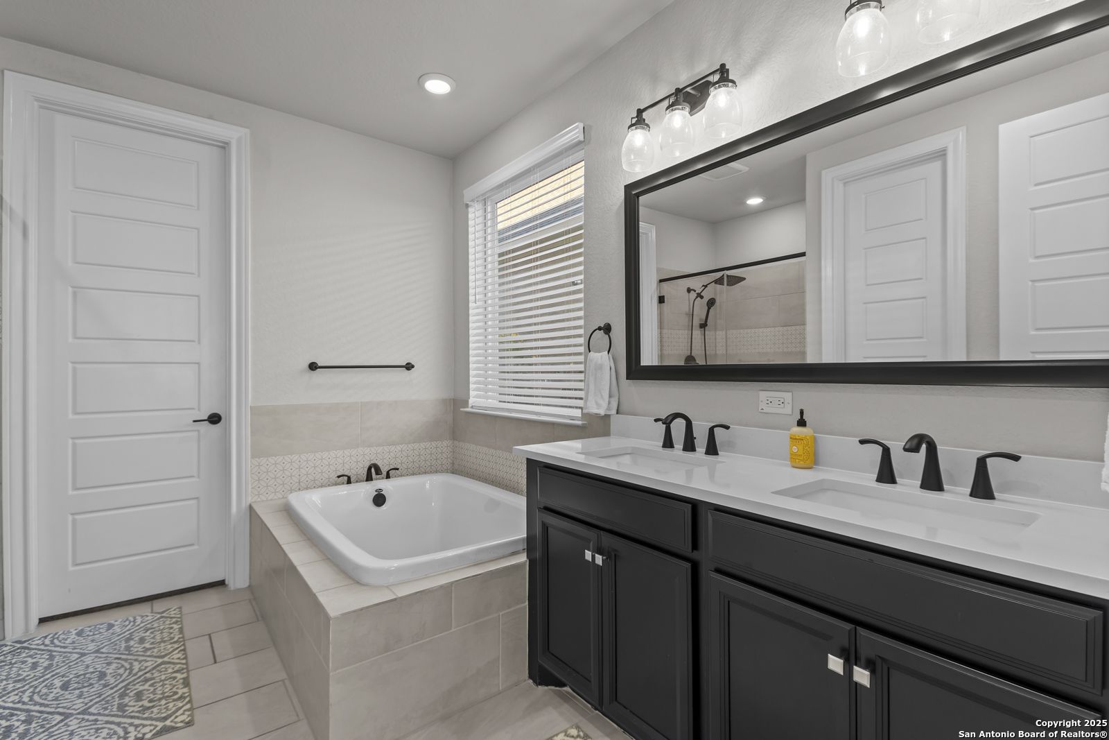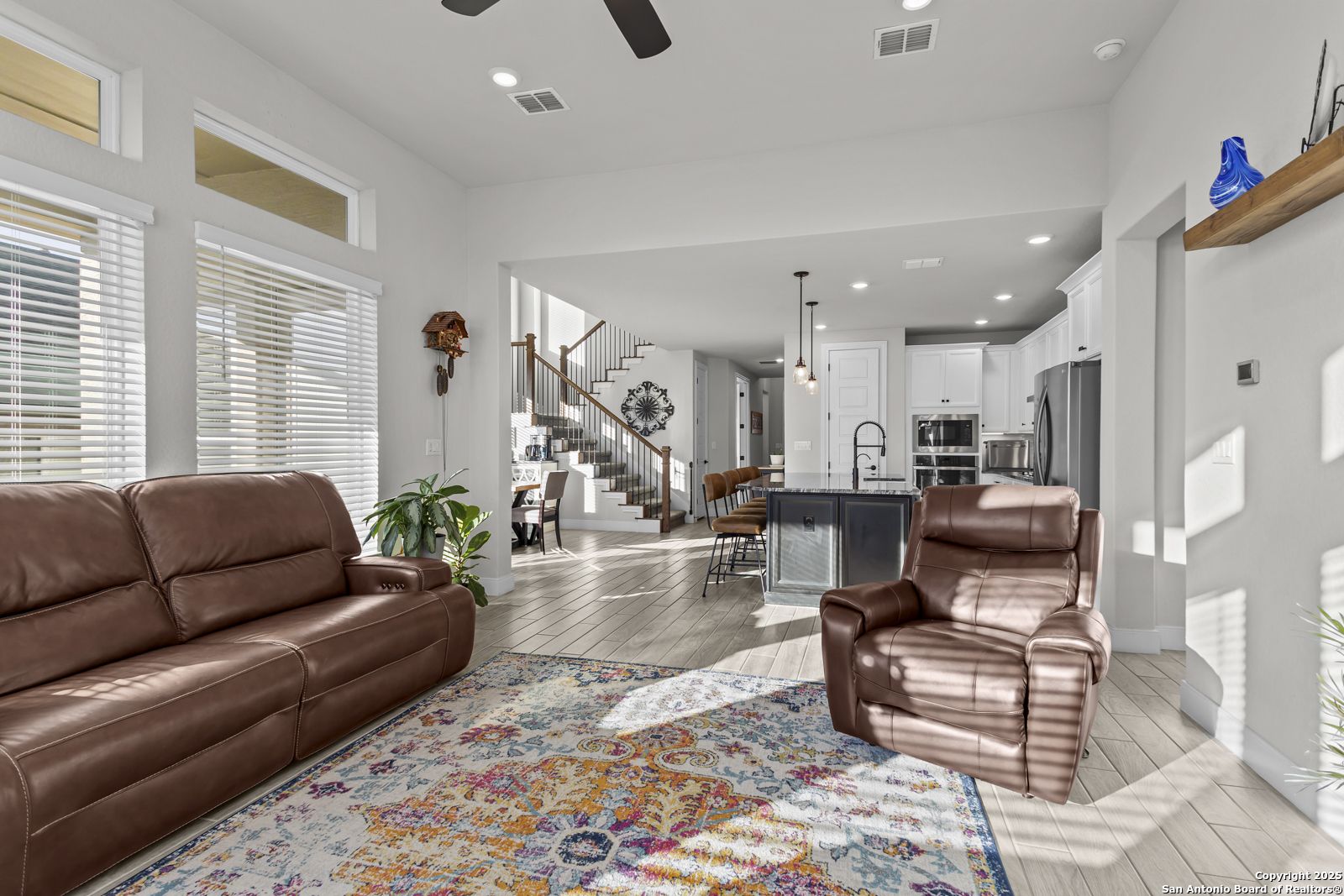 Welcome to 22924 Grande Vista, a striking, modern home in the coveted Campanas at Cibolo Canyons community. Built in 2022 and spanning approximately 2,733 square feet, this residence blends fresh finishes with timeless design and offers an ideal layout for both entertaining and everyday living. Step inside to discover a chef's dream kitchen featuring crisp white 42-inch cabinets, bold black and white granite countertops, and a farmhouse apron-front sink. The kitchen is open to the living and dining areas, allowing natural light to flood the space through expansive windows and creating a seamless flow between the rooms. The oversized island, pendant lighting, and thoughtful layout make this home ideal for hosting gatherings or relaxing with loved ones. One of the highlights of this home is the main-level master suite. This luxurious retreat includes a separate soaking tub and walk-in shower, dual vanities, and a generous walk-in closet. The additional bedrooms and baths are well appointed and designed for comfort. A versatile loft upstairs offers space for a media area, home office, or play zone. Outside, a covered back porch with a ceiling fan overlooks your oversized backyard, a private sanctuary ready for gardens, play, or quiet evenings under the Texas sky. Located under the sweeping Hill Country skies and just minutes from shops, dining, and major corridors, this home offers an elevated lifestyle with easy access to San Antonio and beyond.