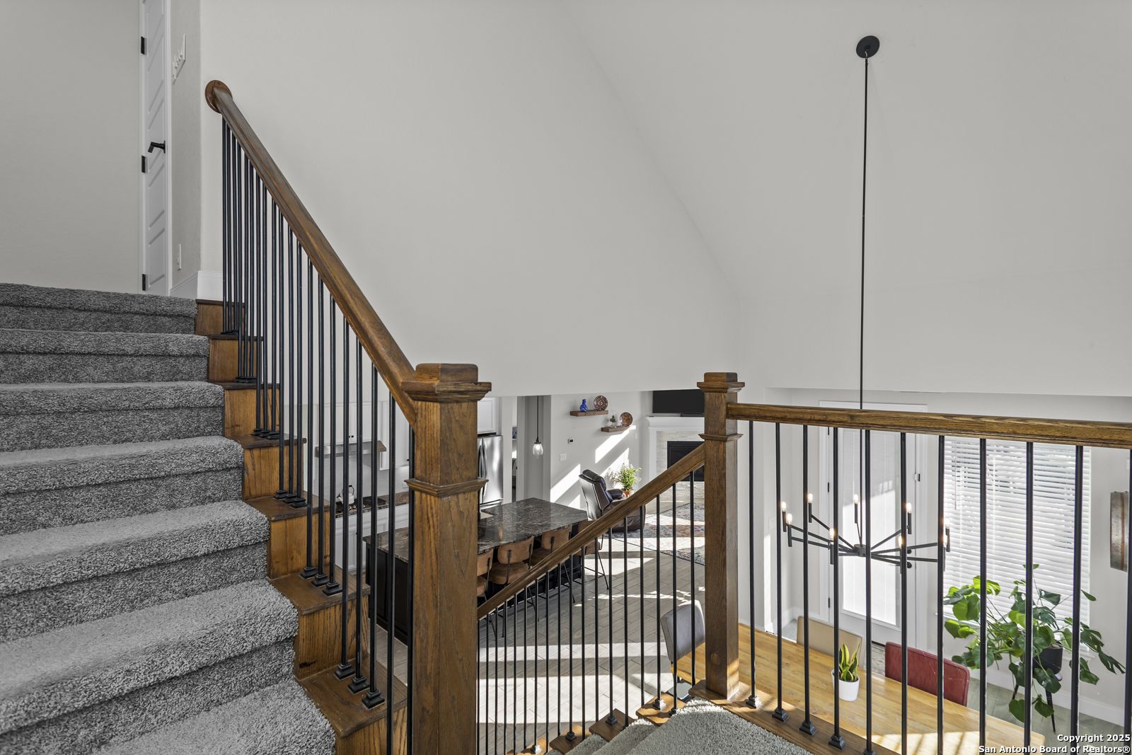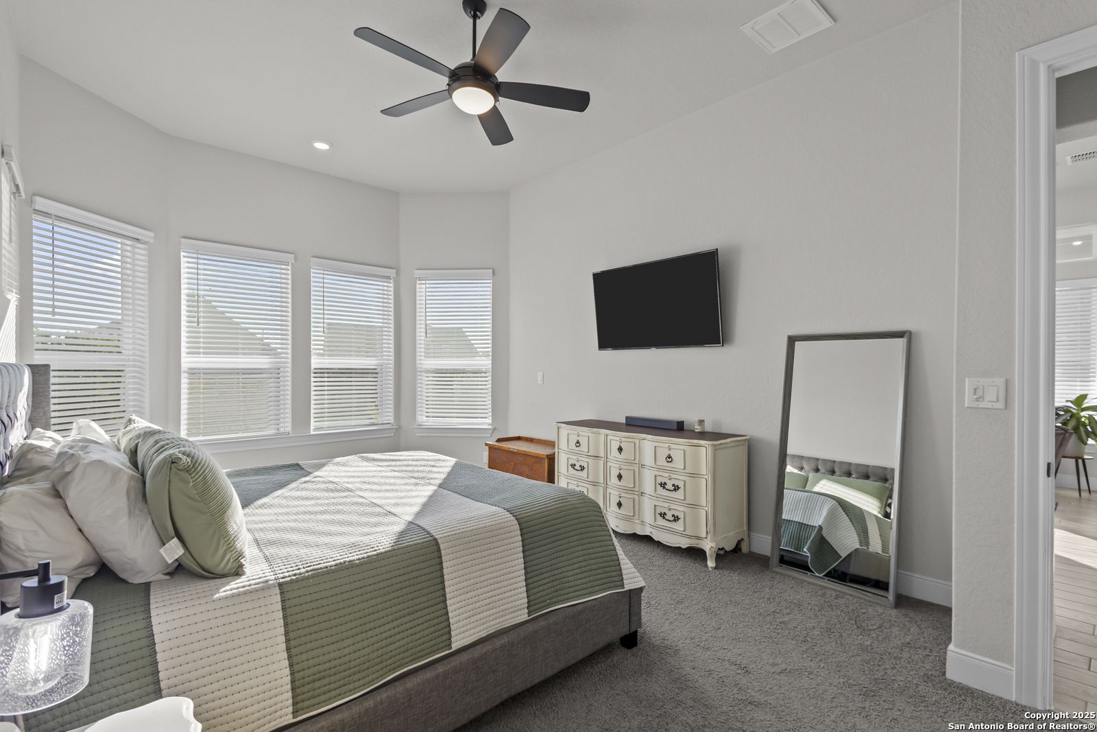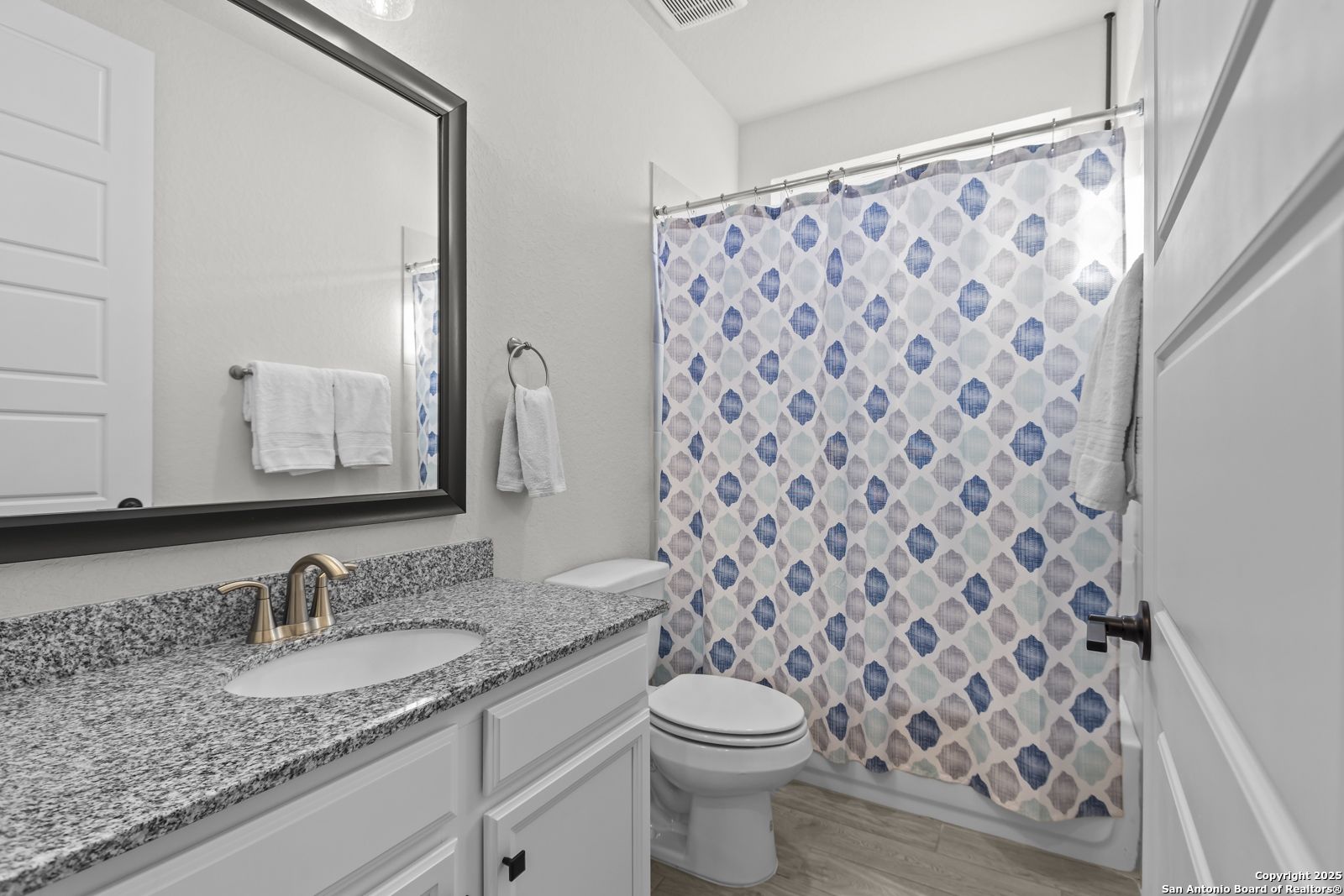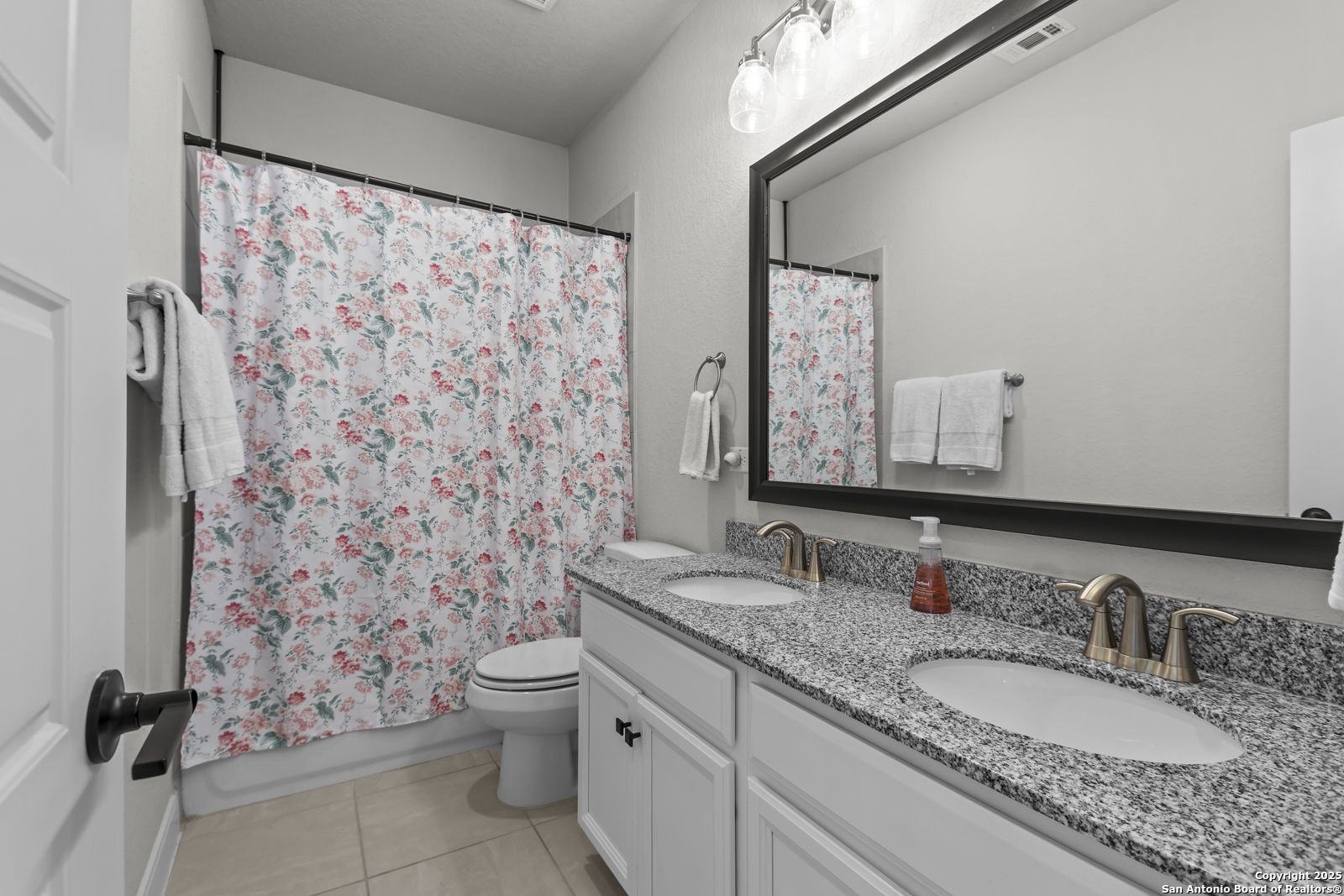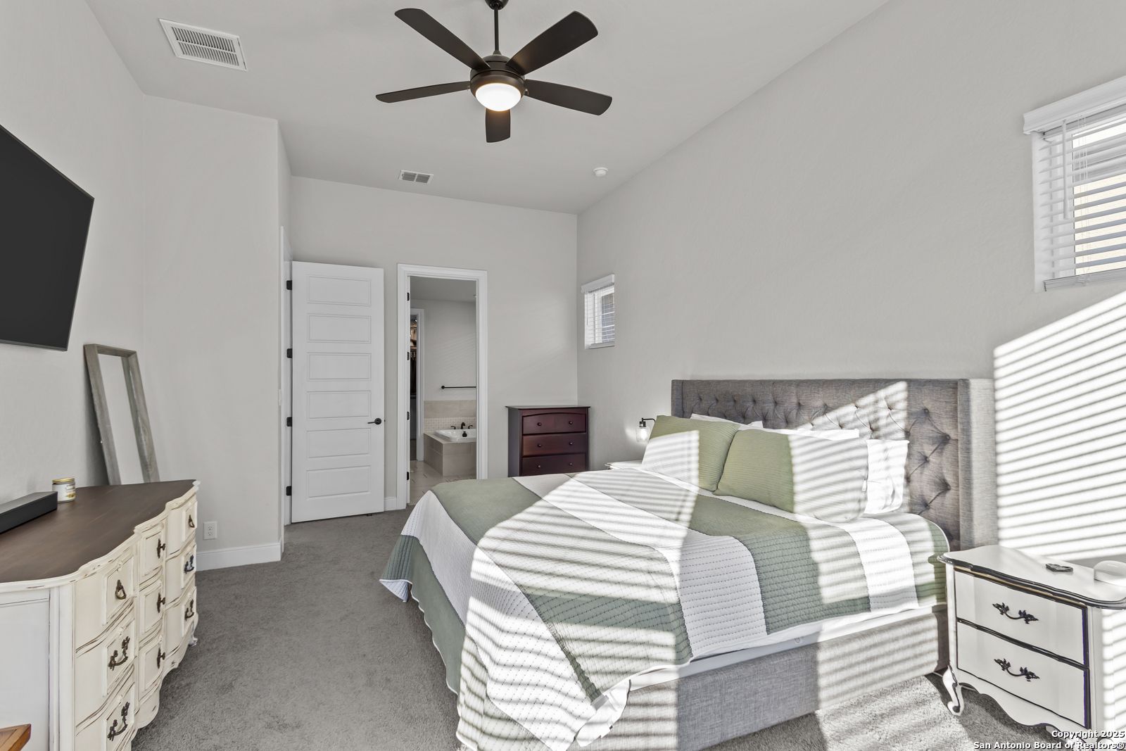 Welcome to 22924 Grande Vista, a striking, modern home in the coveted Campanas at Cibolo Canyons community. Built in 2022 and spanning approximately 2,733 square feet, this residence blends fresh finishes with timeless design and offers an ideal layout for both entertaining and everyday living. Step inside to discover a chef's dream kitchen featuring crisp white 42-inch cabinets, bold black and white granite countertops, and a farmhouse apron-front sink. The kitchen is open to the living and dining areas, allowing natural light to flood the space through expansive windows and creating a seamless flow between the rooms. The oversized island, pendant lighting, and thoughtful layout make this home ideal for hosting gatherings or relaxing with loved ones. One of the highlights of this home is the main-level master suite. This luxurious retreat includes a separate soaking tub and walk-in shower, dual vanities, and a generous walk-in closet. The additional bedrooms and baths are well appointed and designed for comfort. A versatile loft upstairs offers space for a media area, home office, or play zone. Outside, a covered back porch with a ceiling fan overlooks your oversized backyard, a private sanctuary ready for gardens, play, or quiet evenings under the Texas sky. Located under the sweeping Hill Country skies and just minutes from shops, dining, and major corridors, this home offers an elevated lifestyle with easy access to San Antonio and beyond.