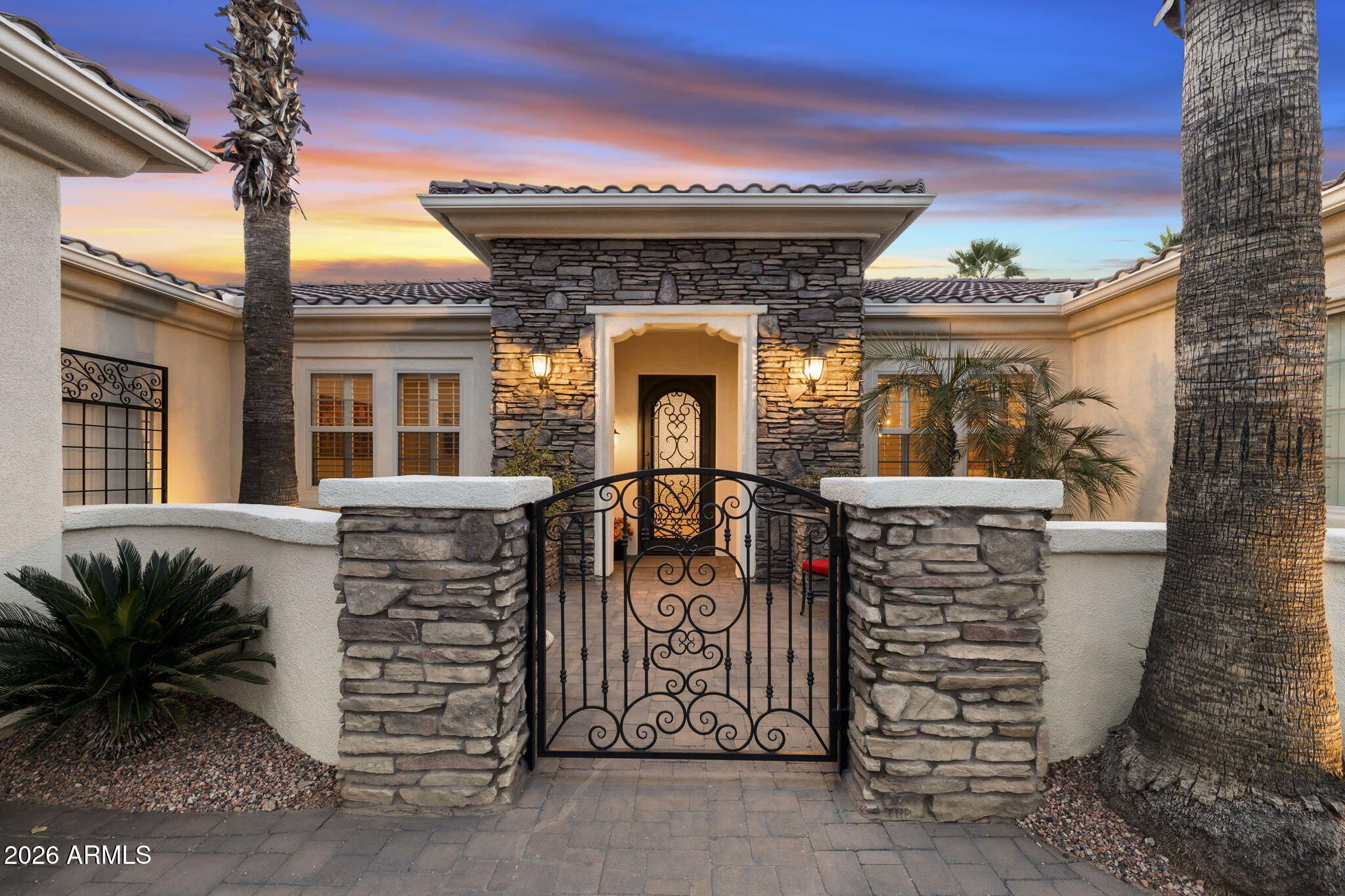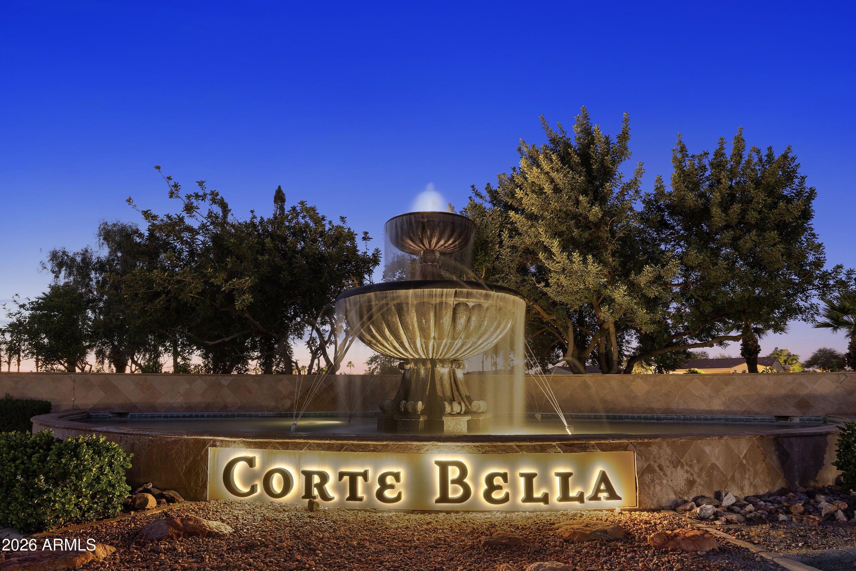 The largest floor plan in Corte Bella Country Club, this beautifully reimagined ''Granada'' has been completely transformed. The redesign elevates the home's appeal by seamlessly blending the family room, custom bar, and kitchen into a versatile flex space--perfect for entertaining and everyday comfort. Enjoy this backyard paradise with heated pool, sweeping mountain views and overlook the 13th fairway, with breathtaking sunsets to end each day This move-in-ready home is sure to win you over. Designer colors create a warm farmhouse charm paired with striking style and sophistication. The kitchen features newer top-of-the-line appliances, high-end cabinetry, and premium countertops, while the remodeled bathrooms offer a truly stunning, spa-like experience. Custom-designed master closet! A gated front courtyard with turf and a cozy seating area welcomes you to an iron and glass front door. Inside, expansive picture windows frame a dream backyard designed for both comfort and upscale living--complete with a private heated pool, spacious patio, outdoor fireplace, built-in BBQ, elevated seating area, second fire pit, and beautiful water features. A whole-house water filtration system was recently added. This home is designed to embrace the Arizona sunshine with solar energy efficiency. In addition to the two-car garage, there is a separate one-car garage for added convenience. Corte Bella offers a semi-private golf club, two restaurants with bars, a variety of social activities, a heated pool, state-of-the-art fitness center, and sport courts. Pickleball is especially popular! Shopping, medical facilities, and banks are all just a short golf cart ride away. The prestigious community of Corte Bella truly is the gem of the West Valley. Furniture available.