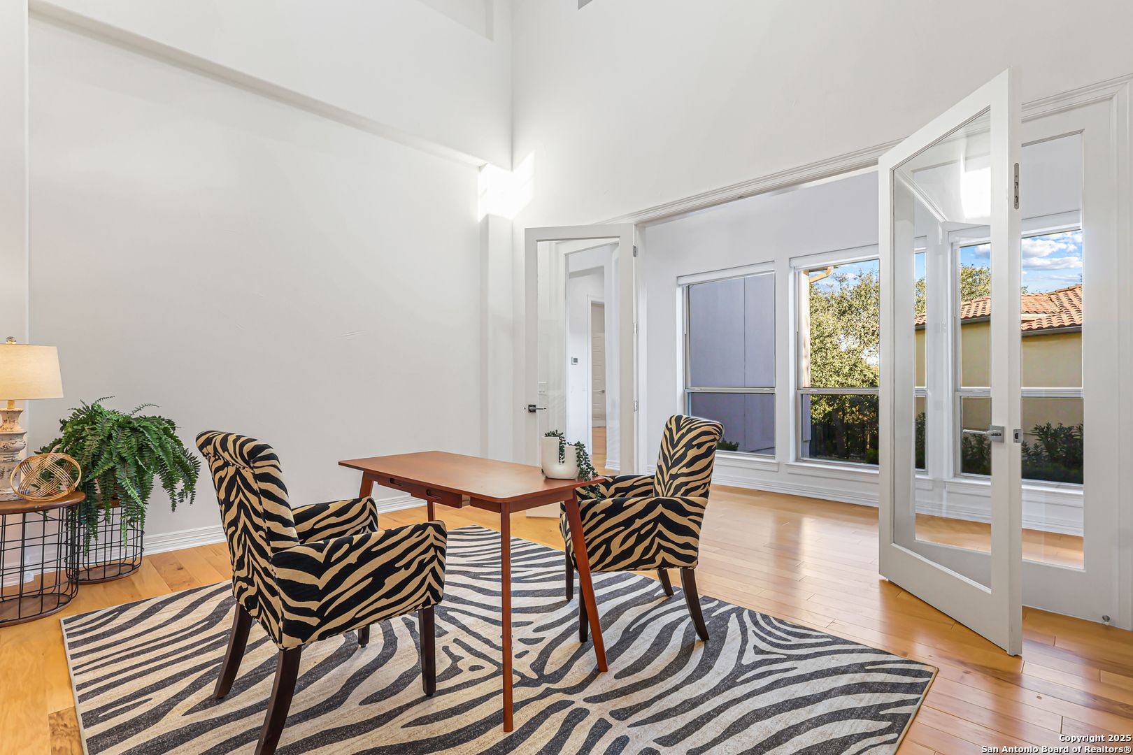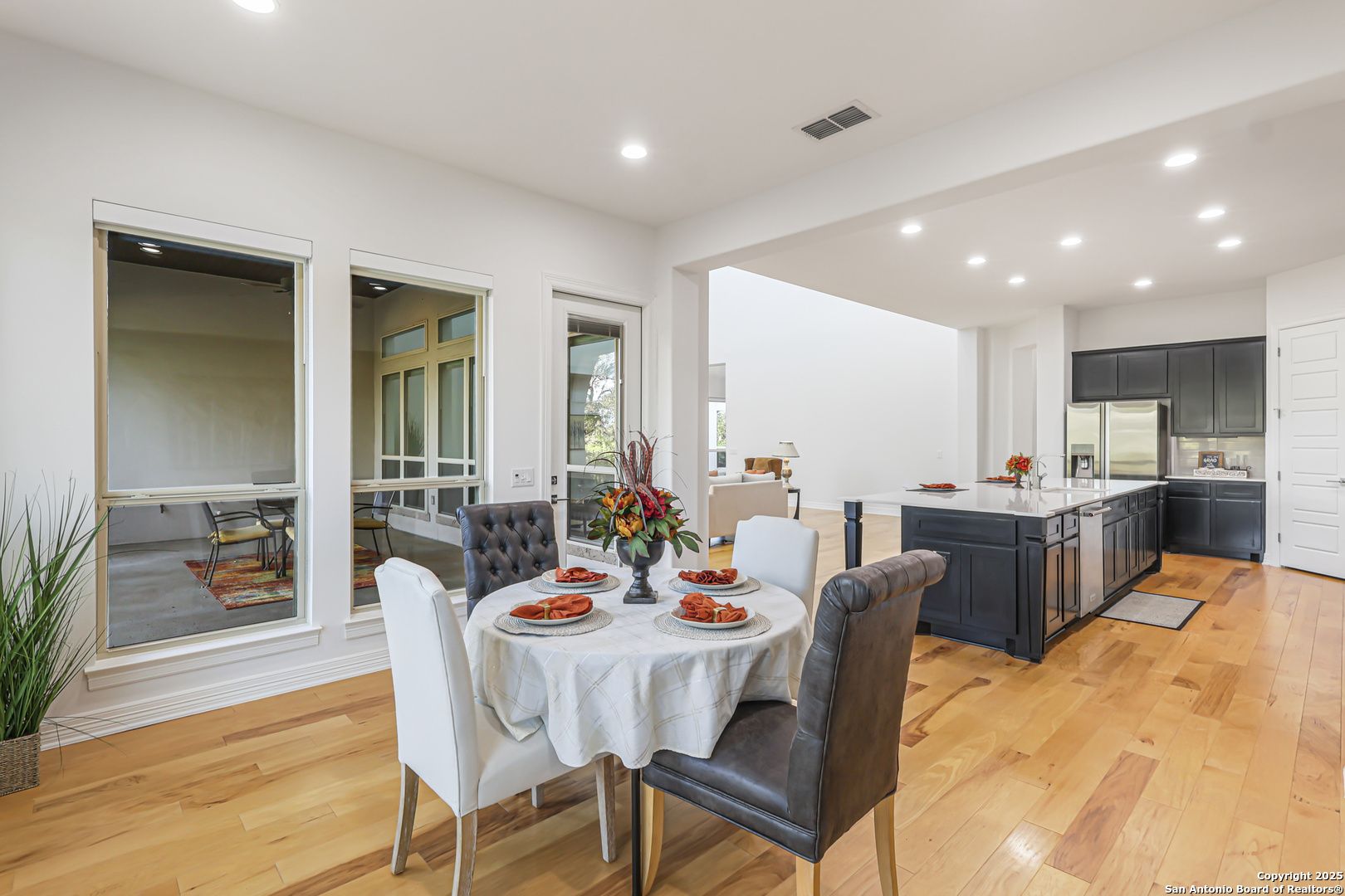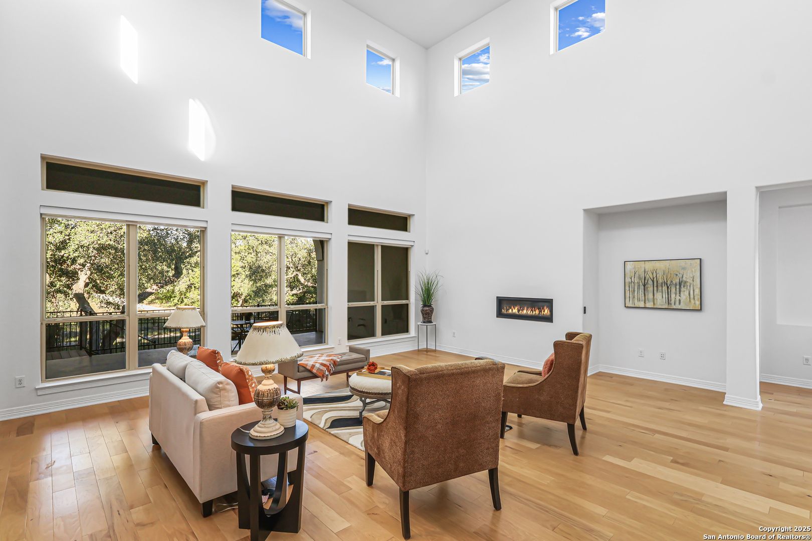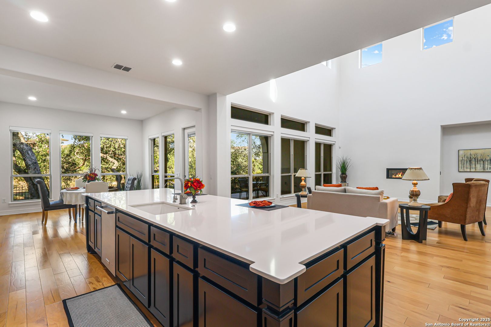 Elegant Sitterle Legend Series one-story home tucked away on a quiet cul-de-sac in the gated Campanas at Cibolo Canyons. This meticulously maintained 3058 SF residence backs to a peaceful greenbelt and showcases soaring 20'+ ceilings throughout, solid core doors, and hand-trowel wall finish. The open-concept layout features a gourmet kitchen with gas cooking, extended breakfast bar, stainless steel appliances (including refrigerator), and abundant cabinetry-ideal for entertaining. The living area is accented by a sleek built-in gas fireplace, creating a warm and inviting atmosphere. A private office with elegant glass doors offers the perfect space for working from home or a quiet study. Each of the three spacious bedrooms offers a private en-suite bath for ultimate comfort. Enjoy outdoor living on an expansive 22' x 13' loggia overlooking the wrought-iron-fenced yard and private courtyard with a full sprinkler system. Additional highlights include large windows for abundant natural light, a concrete tile roof, water softener, and regularly serviced systems for peace of mind. Campanas residents enjoy resort-style amenities with three community pools, clubhouse, fitness center, and HOA-maintained lawn care. A truly exceptional home offering luxury, low maintenance, and timeless craftsmanship. Don't miss out!