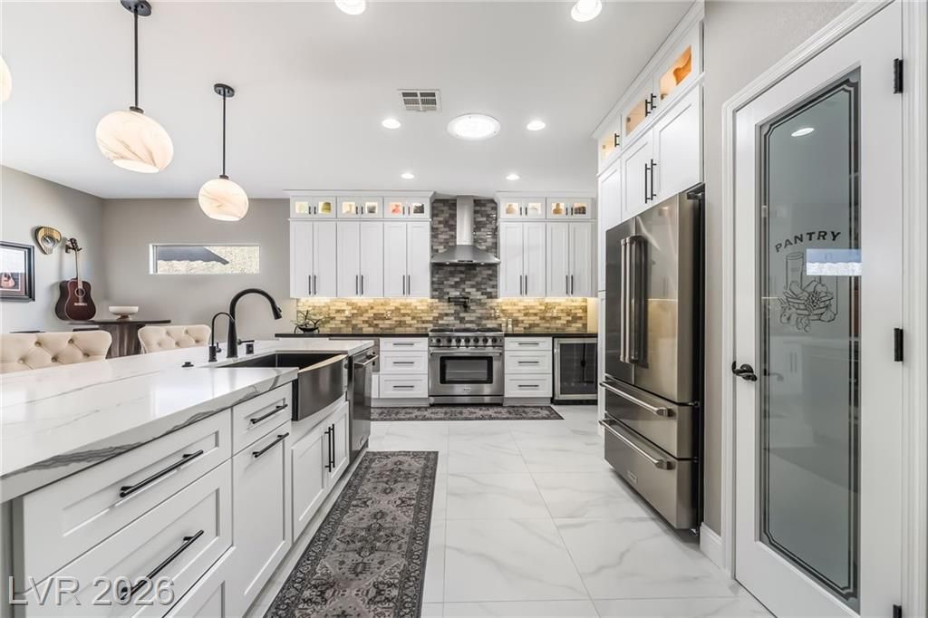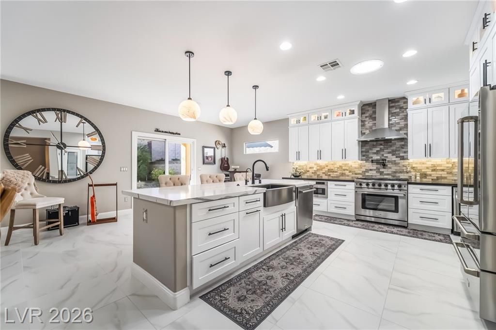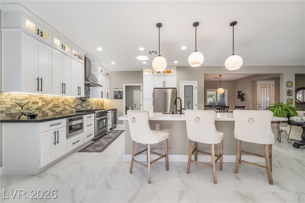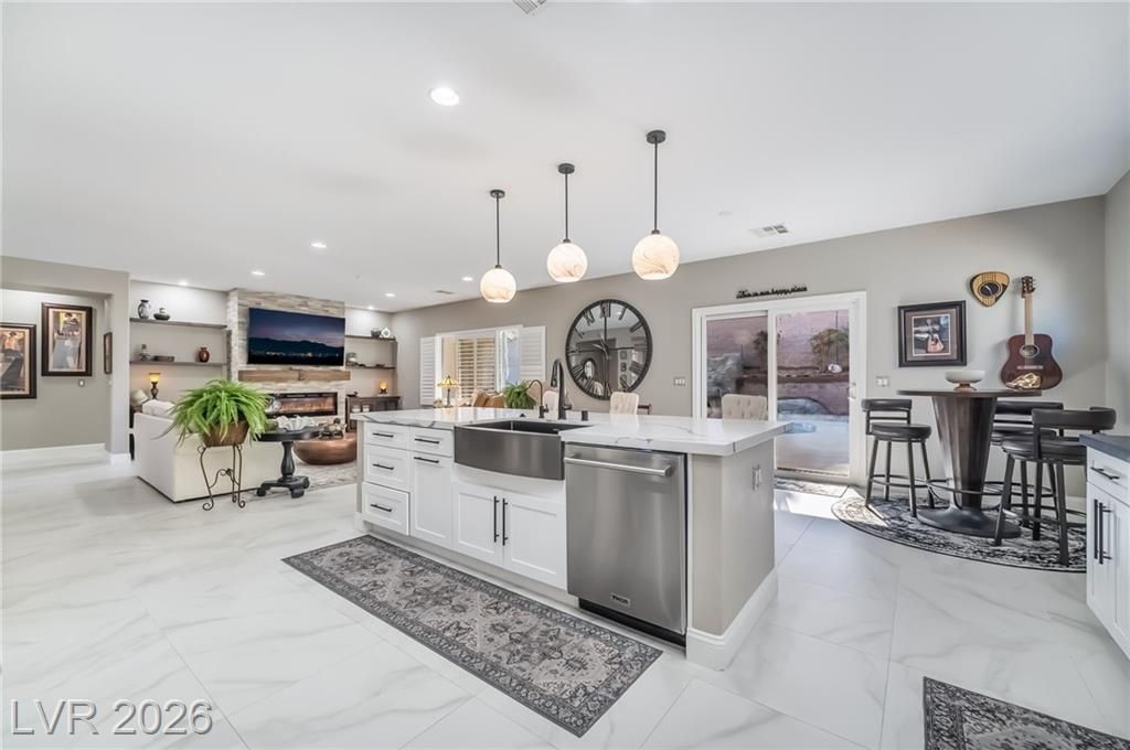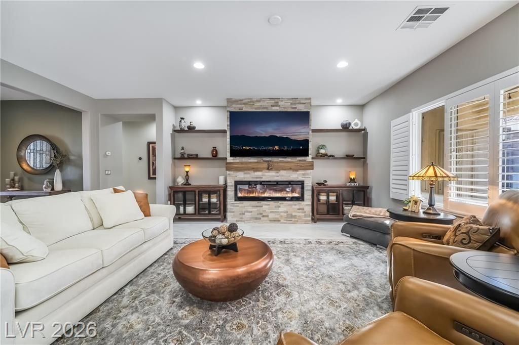 Stunningly remodeled home in the highly desirable 55+ community of Sun City Anthem. This 2,012 sq ft, 2 bed, 2 bath residence showcases a completely reimagined kitchen featuring a relocated oversized island, custom cabinetry with lighting, quartz countertops, farmhouse sink, pot filler, glass tile backsplash, wine chiller, filtered water faucet, osmosis water system, and all new appliances including a 6-burner gas range. New porcelain tile flooring & 5" designer molding throughout, new door hardware throughout, and interior of home was repainted. The living room offers a redesigned fireplace with new tile and floating shelves. Both bathrooms have been upgraded with modern finishes. Enjoy outdoor living with a private pool (new pool pump & vacuum) and a newly landscaped front yard. Add'l upgrades include a new garage door, hot water heater & front yard irrigation system. Truly move-in ready with exceptional attention to detail. Schedule your tour today!