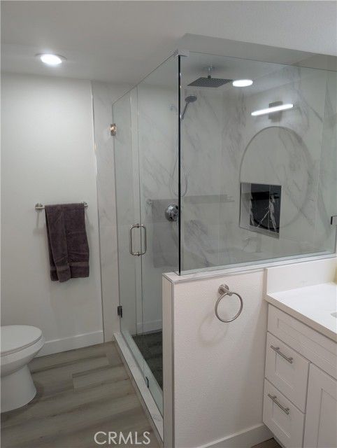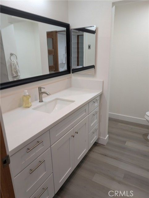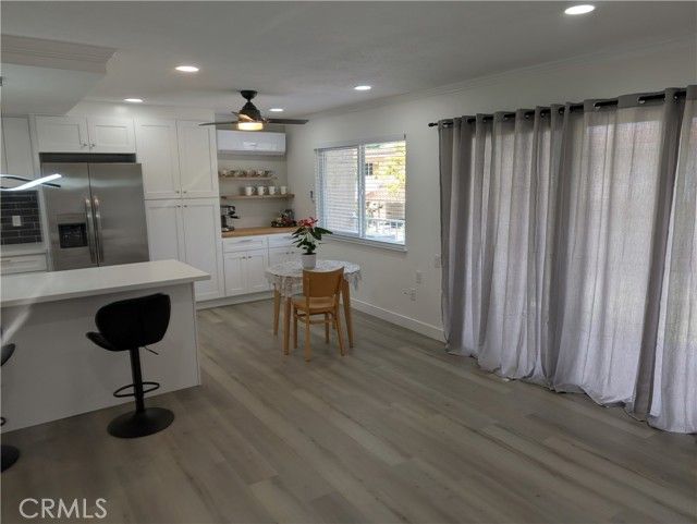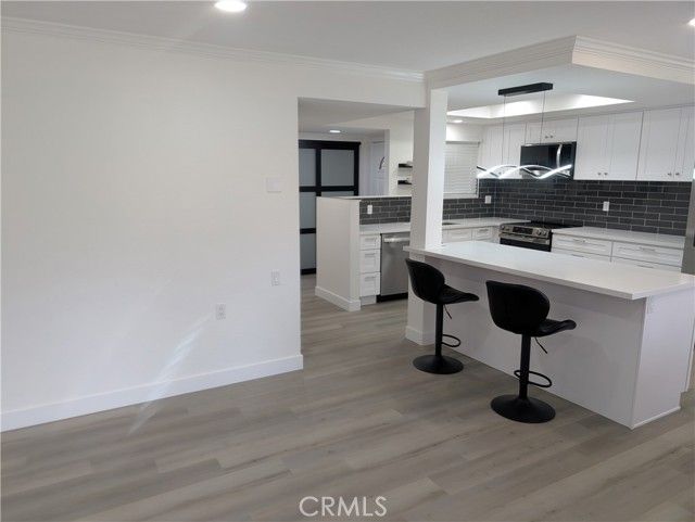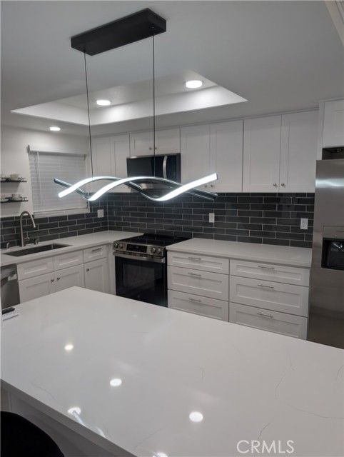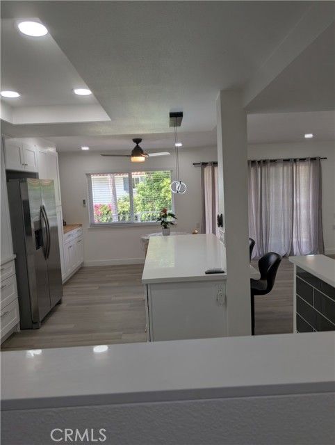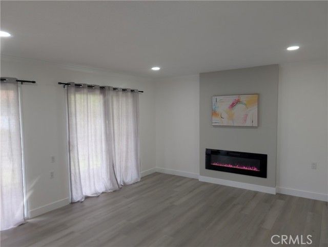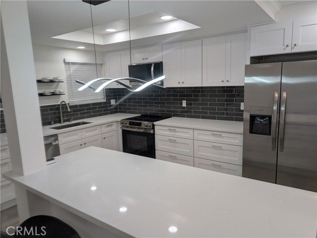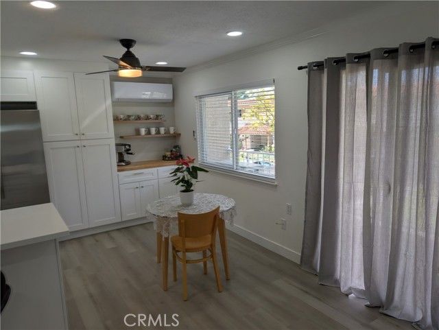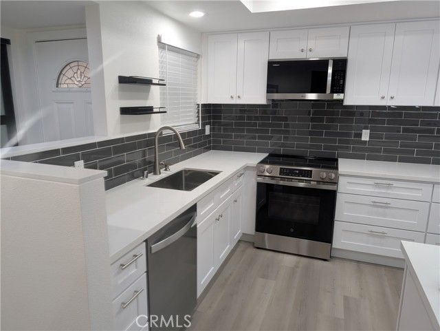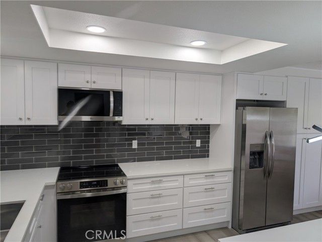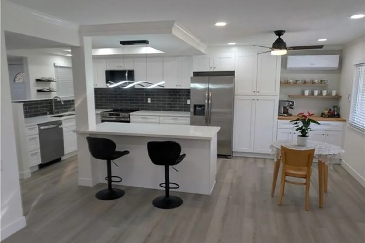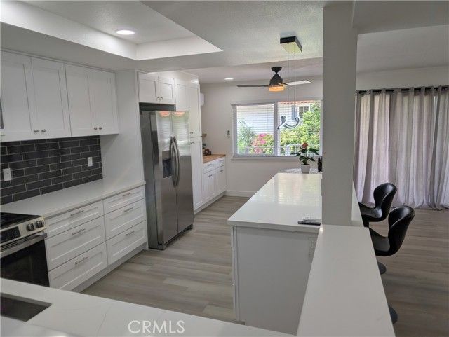 Welcome to your dream home in the heart of Laguna Woods! This extensively remodeled 2-bedroom, 2-bathroom condo is a masterpiece of modern design, offering unparalleled style, comfort, and functionality in a vibrant community. Step into a bright and airy open-concept living space, accentuated by light-toned paint that creates a fresh and inviting atmosphere. The interior features stunning mahogany-style doors with glass accents, adding a touch of elegance and allowing natural light to flow seamlessly throughout the home. The gourmet kitchen is a showstopper, designed to be both aesthetically pleasing and functional. It boasts sleek white cabinetry, brand-new stainless steel appliances—including a full-size refrigerator and a sophisticated slide-in oven—and a chic, gray-toned floor that exudes contemporary flair. A large kitchen island offers extra counter space and seating for bar stools, making it perfect for casual dining or entertaining. A dedicated coffee area adds convenience to your morning routine, while abundant storage ensures everything has its place. The adjacent dining area, complete with a ceiling fan for added comfort, flows effortlessly into the spacious living room. Here, an electric fireplace creates a cozy ambiance, making it the ideal spot for relaxing or hosting guests. Both bedrooms are generously sized, each equipped with a ceiling fan for optimal comfort. The primary suite offers a private retreat, while the second bedroom is versatile enough for guests or a home office. Two beautifully remodeled bathrooms complement the home’s modern aesthetic with their thoughtful design. Practicality meets luxury with a full-size stackable washer and dryer, a highly efficient central AC system to keep you cool year-round, and a nice-sized balcony perfect for enjoying morning coffee or sunsets with views of the Laguna Woods community. This condo is more than just a home—it’s a lifestyle. With access to Laguna Woods’ world-class amenities, including golf courses, pools, and social clubs, this impeccably remodeled gem offers the perfect blend of elegance and convenience. Don’t miss your opportunity to own this stunning residence—schedule your private tour today!