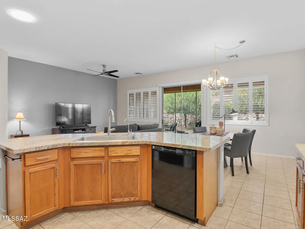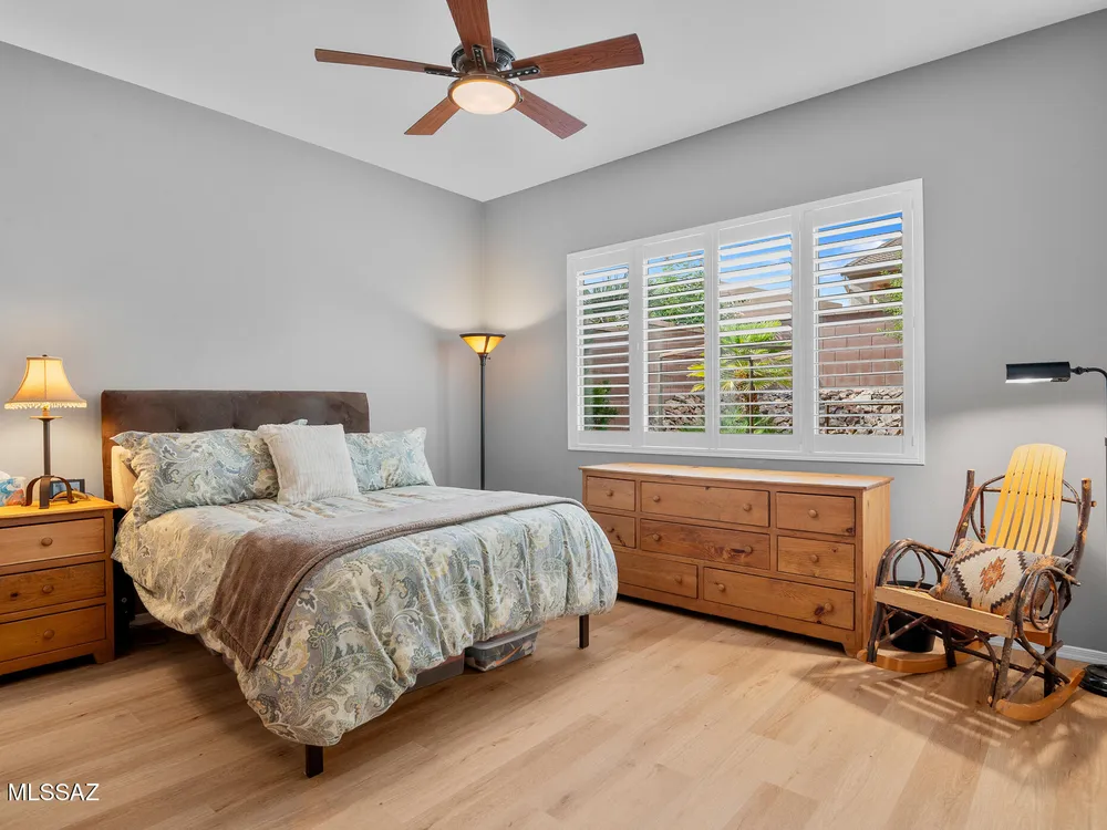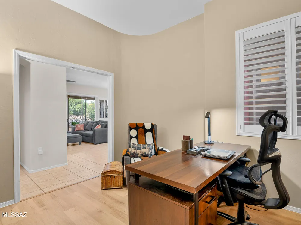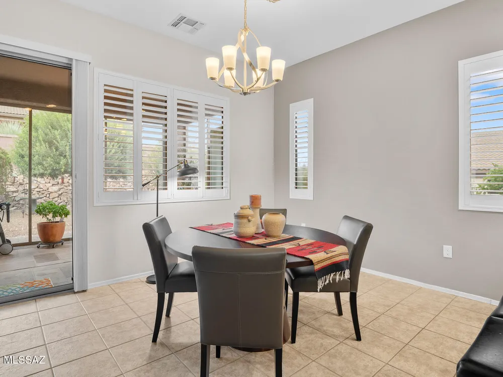 Realize the pinnacle of retirement living nestled in the serene landscape of Southern Arizona. This elegant residence offers a harmonious blend of comfort and style, ideal for retirees seeking an active and fulfilling lifestyle amidst the desert's beauty. As you enter the circular front courtyard, you will see breathtaking 180-degree views of majestic mountains and the expansive desert, setting the stage for a home that is truly in harmony with its surroundings. The distinctive Winslow floor plan unfolds with curved walls and 10-foot ceilings, creating an open and airy ambiance. Complemented by plantation shutters and designer, yet neutral paint colors, this home is a canvas awaiting your personal touch. Every detail is crafted with convenience and luxury in mind. The easy-care tile and