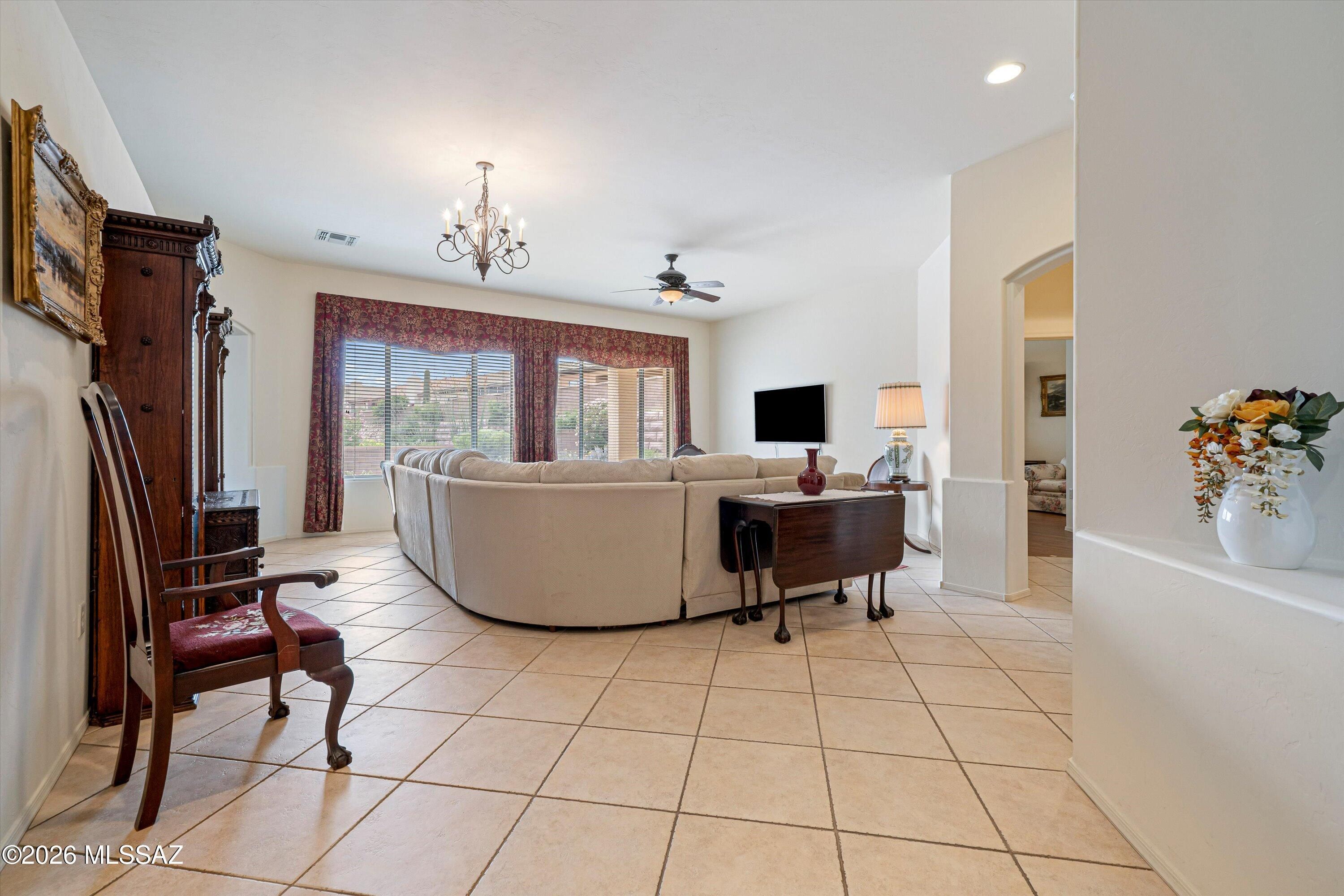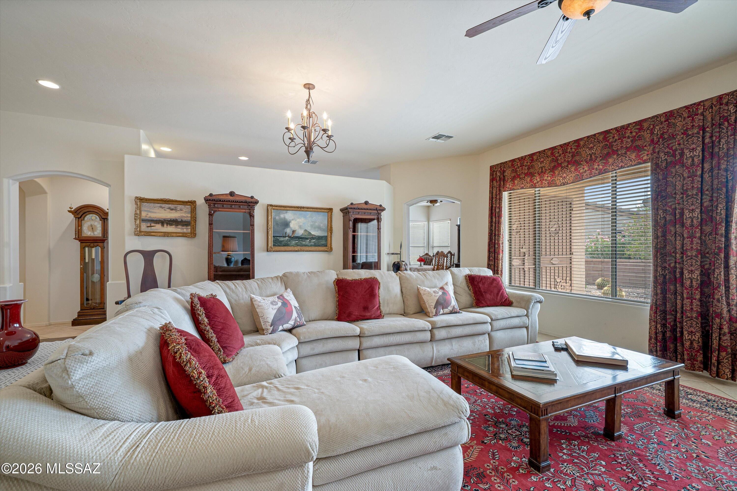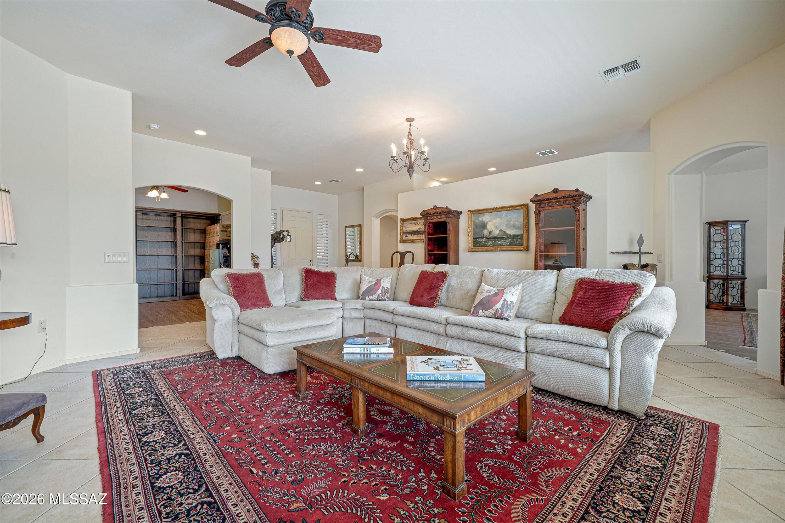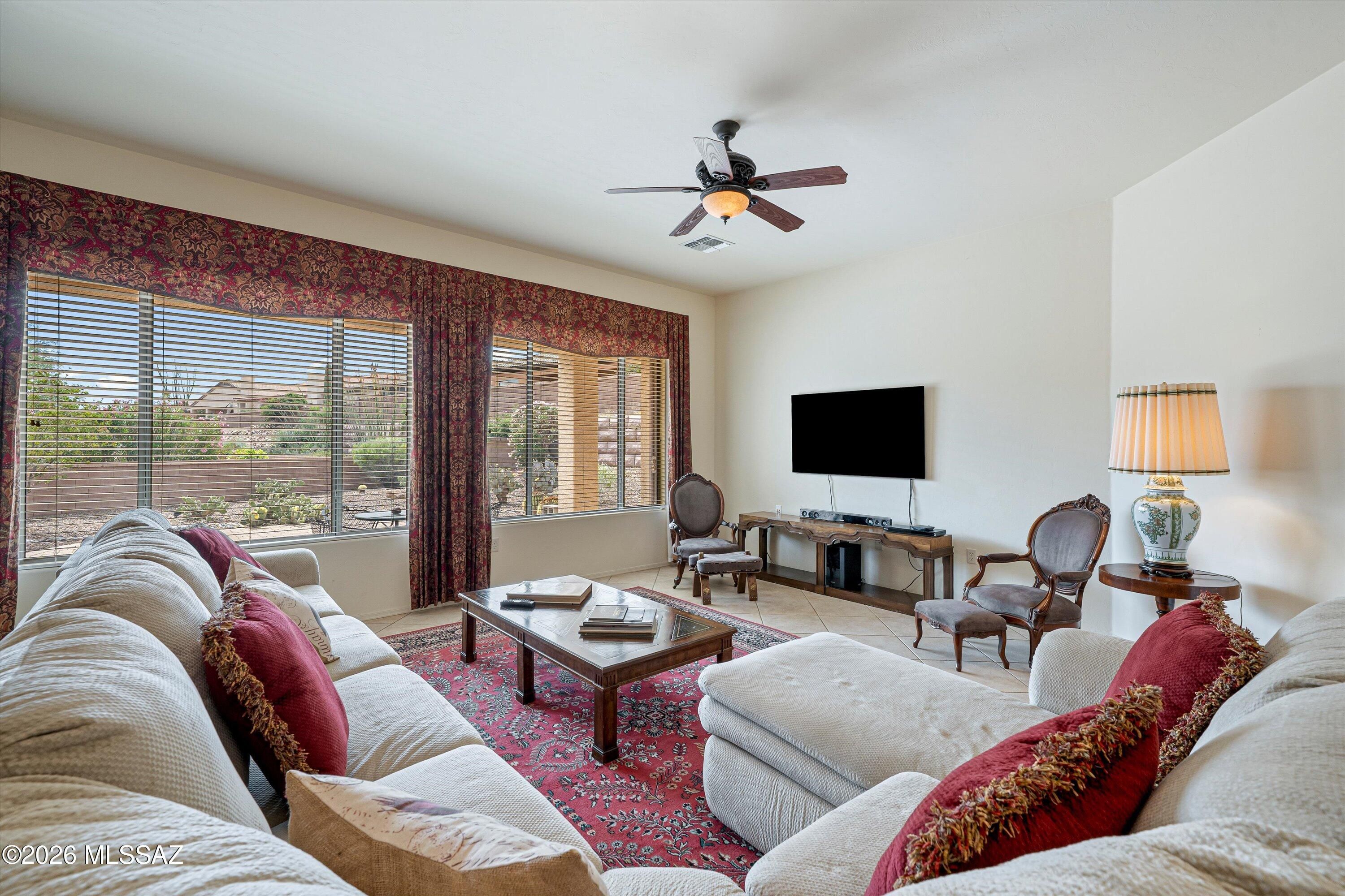 Located in the highly desirable gated 55+ community of Canoa Northwest in Green Valley, Arizona, this well-maintained home offers a peaceful setting surrounded by beautiful mountain views and pristine desert landscape. Situated on an Extra large lot, the property provides exceptional privacy while still being conveniently close to many of the area's most sought-after amenities.A welcoming secure front porch sets the tone for comfort and relaxation. Inside, you will find a thoughtfully designed floor plan featuring an open den with custom built-in bookcases, creating the perfect space for a home office, reading nook, or hobby room. The spacious kitchen offers abundant cabinetry and workspace, ideal for everyday living as well as entertaining guests.