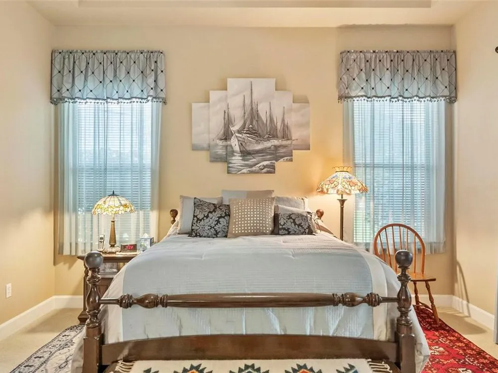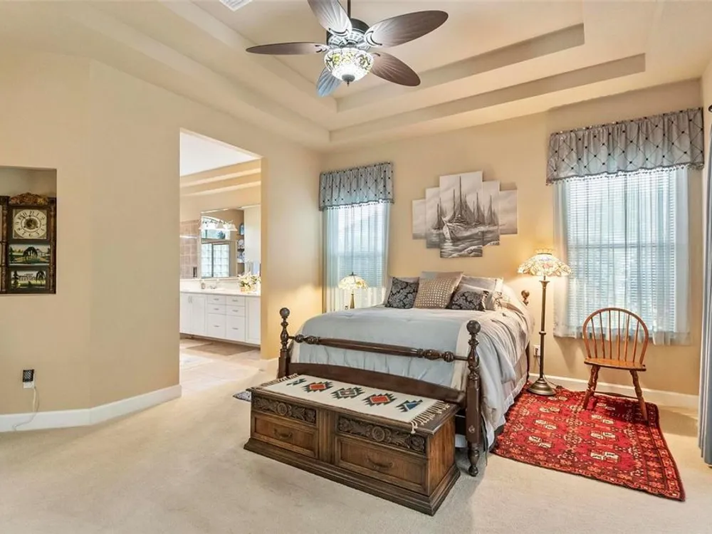 - Solid-Wood Cabinets, Tray Ceiling(s), Window Treatments, Ceiling Fan(s), Eat-in Kitchen, High Ceilings, Main Level Primary, Split Bedrooms, Stone Counters, Thermostat, Walk-In Closet(s)