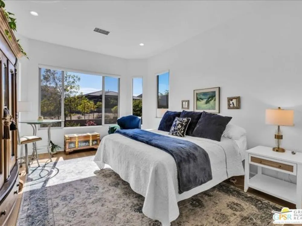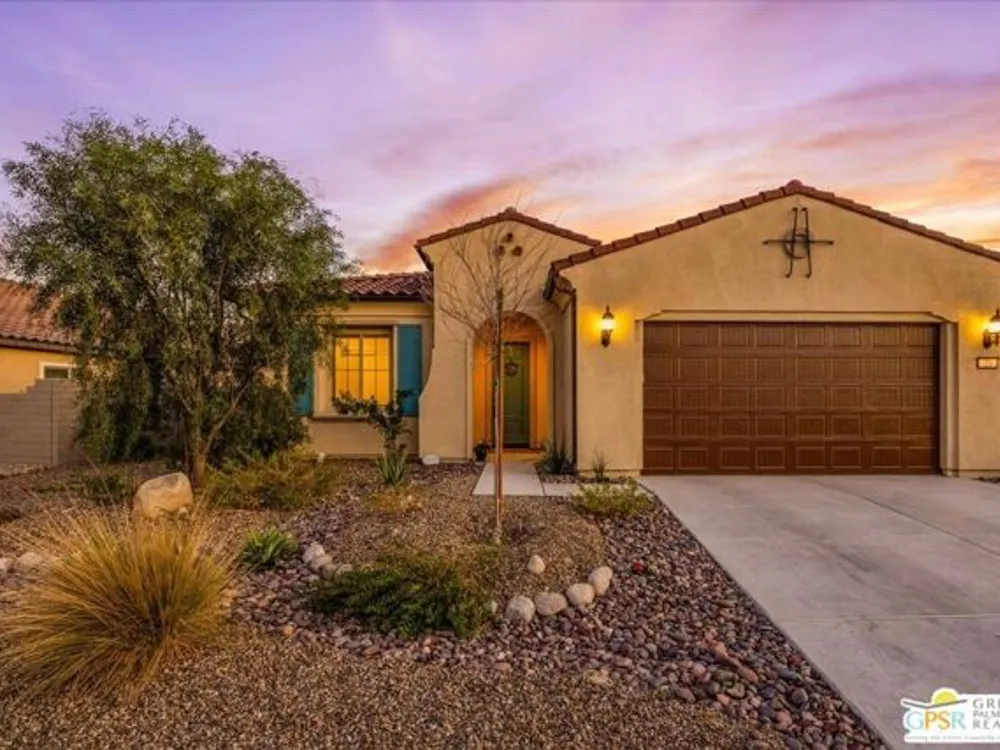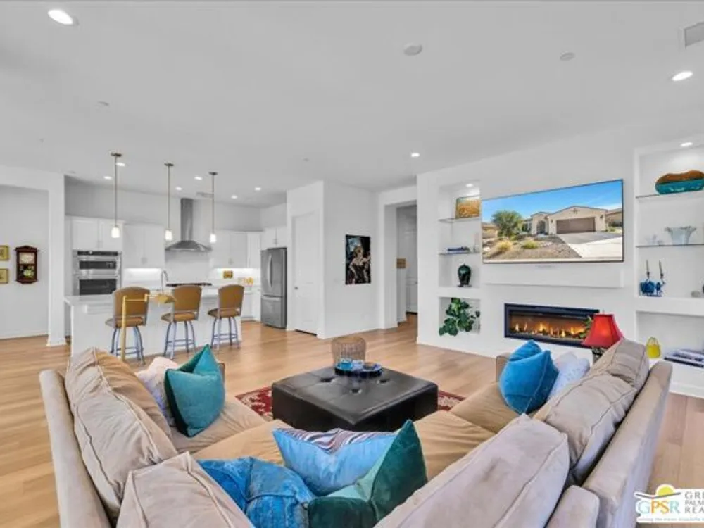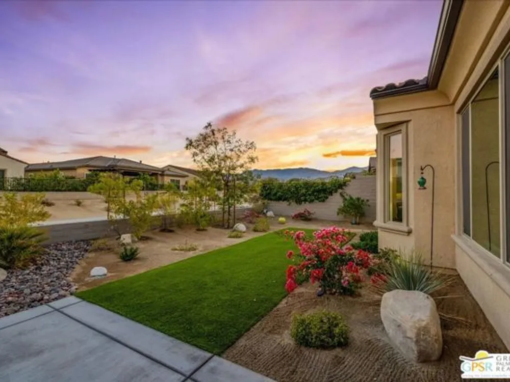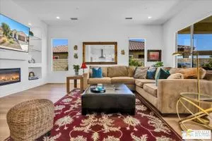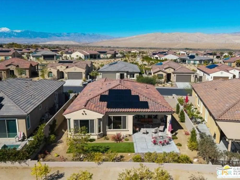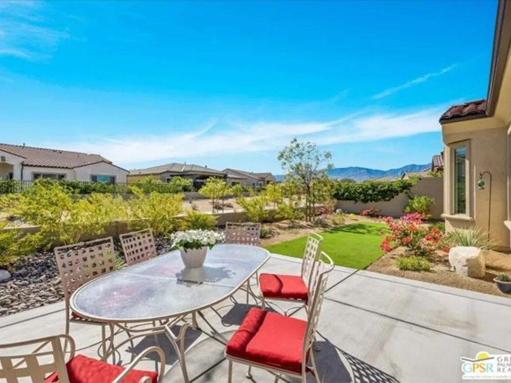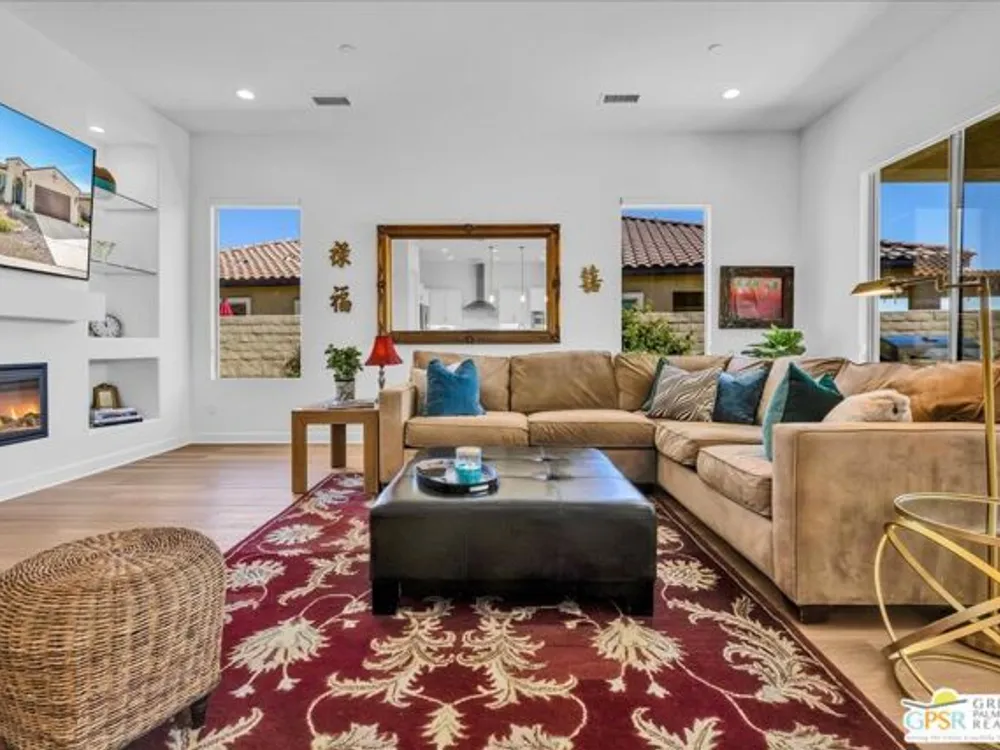 Charming SANCTUARY in Del Webb Rancho Mirage A Private Retreat with Mountain Views. Welcome to Del Webb Rancho Mirage, a sought-after gated 55+ community offering resort-style living in the heart of the desert. Nestled on a quiet cul-de-sac, this stunning Spanish PLAN 4 SANCTUARY floorplan offers 2 bedrooms, 2 baths, plus a versatile den/office, perfect for work or relaxation. Step inside to a bright and airy space, where warm luxury vinyl plank flooring and custom window treatments create a stylish yet inviting ambiance. The open-concept living area is enhanced by a cozy gas fireplace and built-in display niches, making it the perfect place to unwind. OWNED SOLAR ensures energy efficiency and peace of mind. The chef's kitchen is both beautiful and functional, featuring upgraded quartz countertops, stainless steel appliances, a spacious walk-in pantry, and a large island with ample seating illuminated by elegant pendant lighting. The expanded primary suite is a true retreat, highlighted by a sunlit bay window, a spa-like ensuite bath with dual vanities, a stall shower with bench, and a generous walk-in closet. The thoughtfully designed layout places the guest bedroom and den on the opposite side of the home, offering privacy and easy access to an upgraded secondary bath. Additional modern conveniences include solar sky tubes in the laundry and primary closet for extra natural light, Cat-6 home network wiring, a smart garage door, and rain gutters. Outside, the fully landscaped backyard is designed for relaxation, featuring an expanded hardscape patio perfect for gathering with friends while soaking in the breathtaking mountain views. Experience the best of Del Webb living, where you'll enjoy access to a clubhouse, resort-style pool & spa, fitness center, tennis, pickleball, bocce ball, and more. Come discover the lifestyle you've been dreaming of!