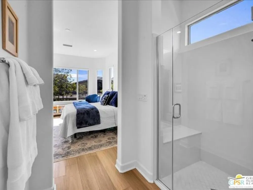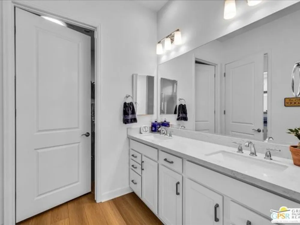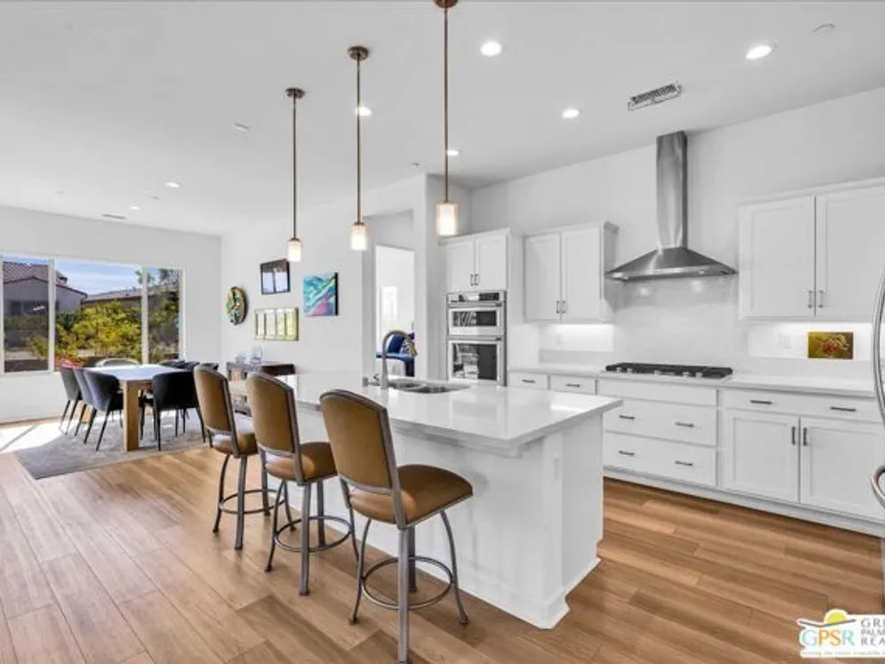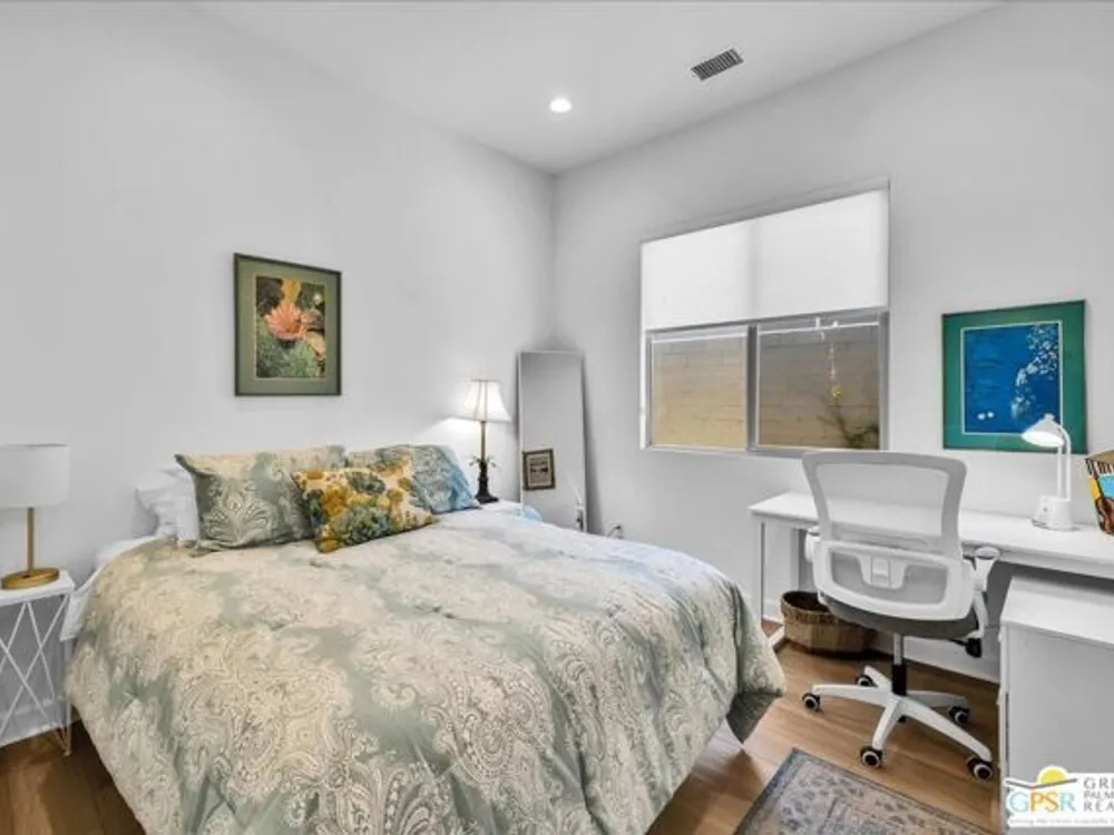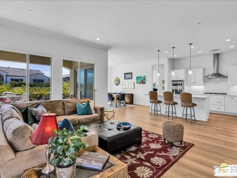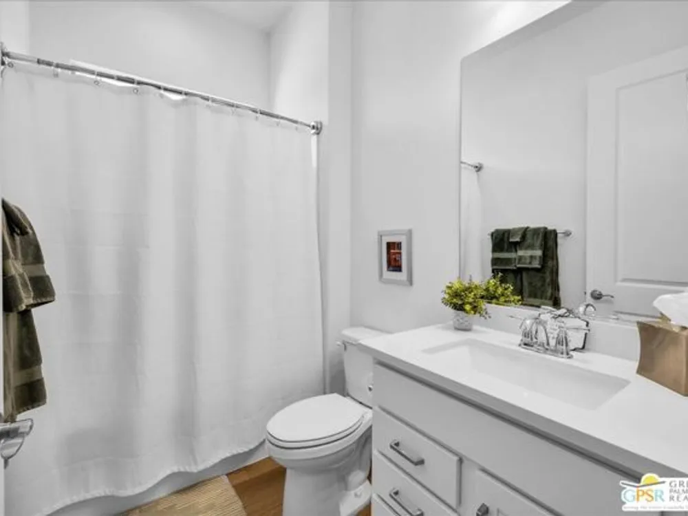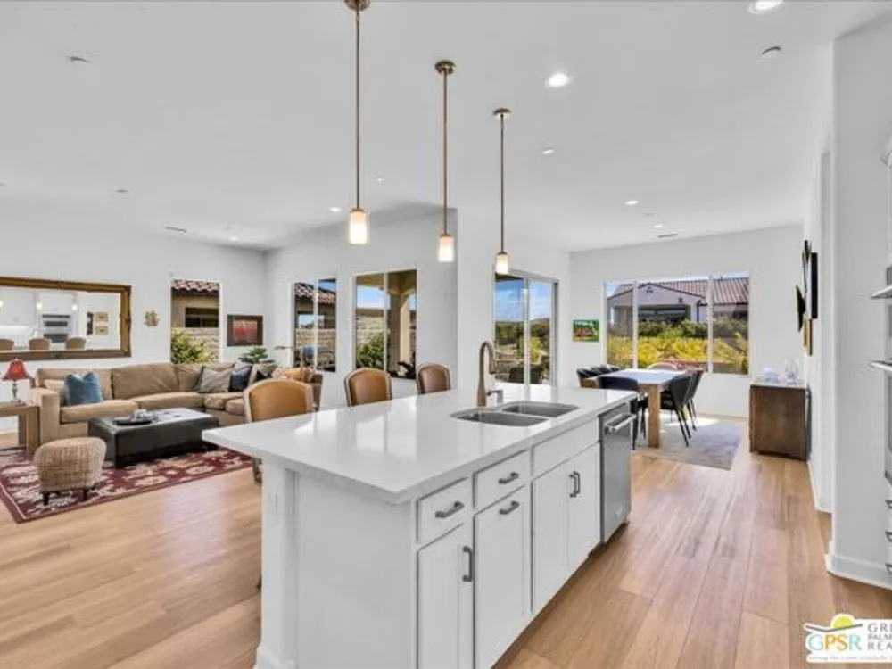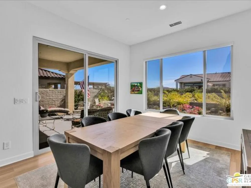 Charming SANCTUARY in Del Webb Rancho Mirage A Private Retreat with Mountain Views. Welcome to Del Webb Rancho Mirage, a sought-after gated 55+ community offering resort-style living in the heart of the desert. Nestled on a quiet cul-de-sac, this stunning Spanish PLAN 4 SANCTUARY floorplan offers 2 bedrooms, 2 baths, plus a versatile den/office, perfect for work or relaxation. Step inside to a bright and airy space, where warm luxury vinyl plank flooring and custom window treatments create a stylish yet inviting ambiance. The open-concept living area is enhanced by a cozy gas fireplace and built-in display niches, making it the perfect place to unwind. OWNED SOLAR ensures energy efficiency and peace of mind. The chef's kitchen is both beautiful and functional, featuring upgraded quartz countertops, stainless steel appliances, a spacious walk-in pantry, and a large island with ample seating illuminated by elegant pendant lighting. The expanded primary suite is a true retreat, highlighted by a sunlit bay window, a spa-like ensuite bath with dual vanities, a stall shower with bench, and a generous walk-in closet. The thoughtfully designed layout places the guest bedroom and den on the opposite side of the home, offering privacy and easy access to an upgraded secondary bath. Additional modern conveniences include solar sky tubes in the laundry and primary closet for extra natural light, Cat-6 home network wiring, a smart garage door, and rain gutters. Outside, the fully landscaped backyard is designed for relaxation, featuring an expanded hardscape patio perfect for gathering with friends while soaking in the breathtaking mountain views. Experience the best of Del Webb living, where you'll enjoy access to a clubhouse, resort-style pool & spa, fitness center, tennis, pickleball, bocce ball, and more. Come discover the lifestyle you've been dreaming of!
