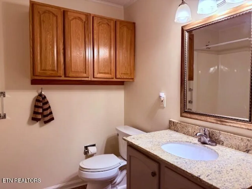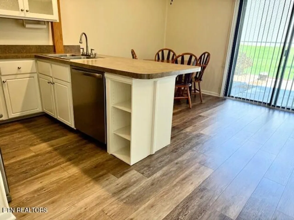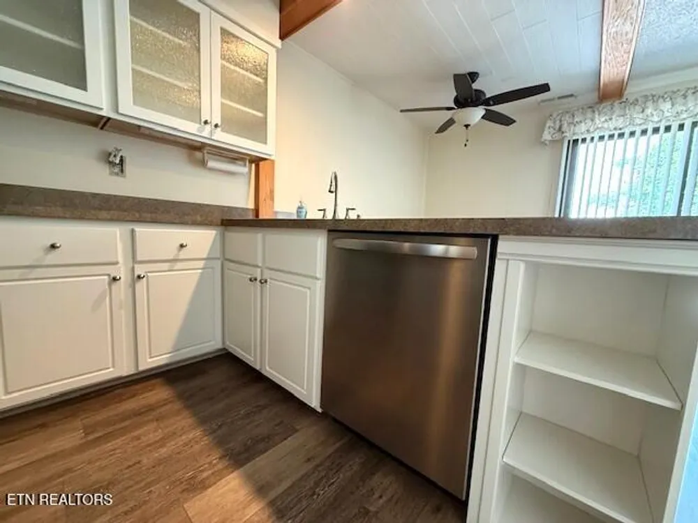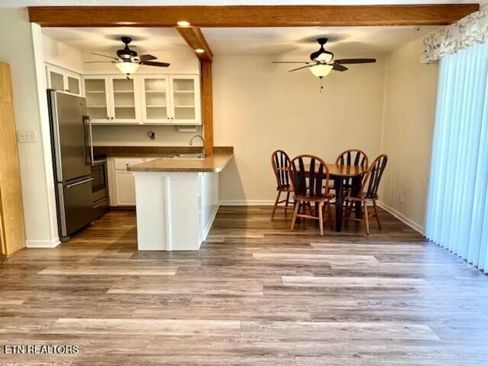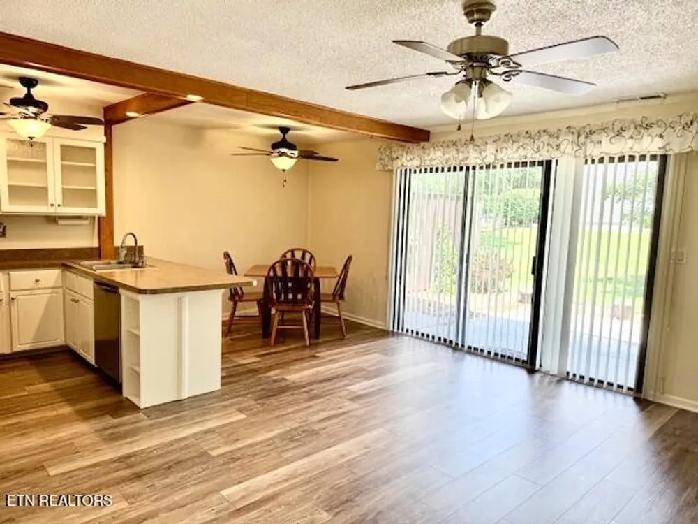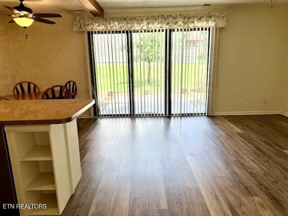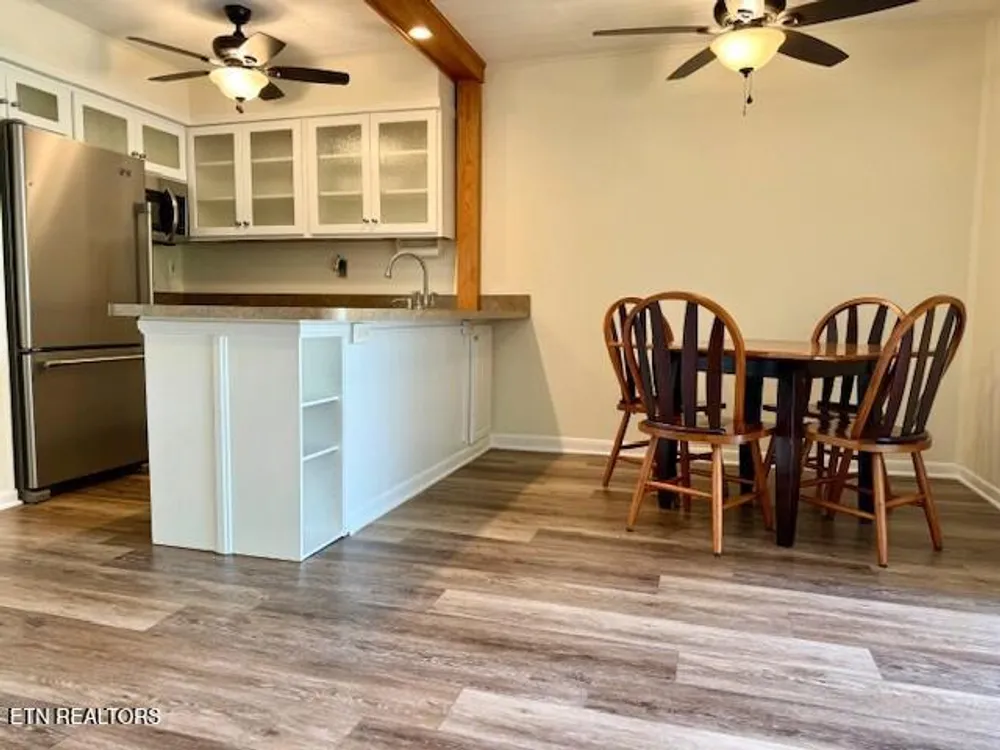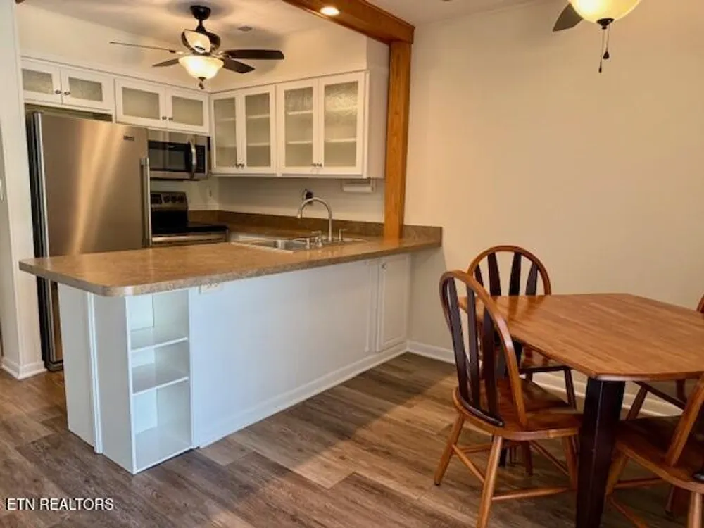 Move in Ready! Centrally located to mall, walking trails, and Amphitheatre. One level, open floor plan with 744 square feet of living space. Very nice and well maintained with lots of updates. This home comes with a tiled Foyer with closet, open Living Room, Kitchen, and Dining Room with an attractive easy care laminate flooring and three ceiling fans. A freestanding gel Fireplace is the focal point in the Living Room adding ambiance. Two glass panels along with a sliding glass door allow natural lighting and a great patio for outdoor enjoyment. The Kitchen and Dining Room are accented with ornamental wood beams, recessed lighting, and wood plank ceilings. The cabinets are upgraded with rain glass doors, and additional open shelving on both sides of the bar. The appliances are Stainless Steel, including a dishwasher and built-in microwave. Hall closet can be used as pantry. The Bathroom has a tile floor, granite vanity top with an undermount sink, tub/shower combo, and additional cabinets for storage. The bedroom has brand new carpet, ceiling fan, large window, closet, and stackable washer & dryer. The wardrobe/armoire conveys and is great for extra clothes and linen. Maintenance is made easy with access to water hook-ups to shower, and washer & dryer. Water shut off in foyer closet and on patio. New roof in 2024. Monthly fees: Fairfield Glade Community Club $111 and Wilshire Heights HOA $171.