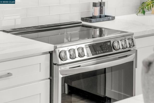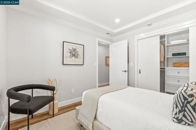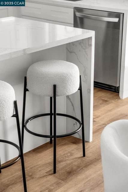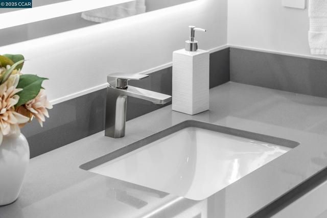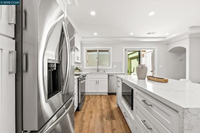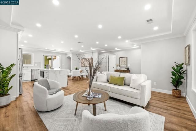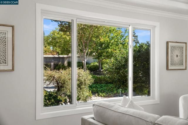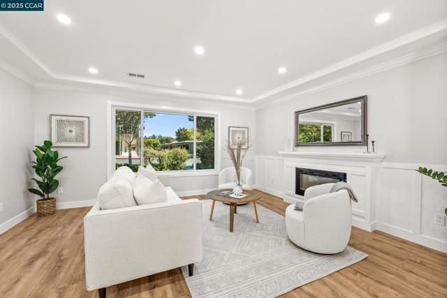 Beautifully remodeled by Rossmoor Renovations, this reconfigured 2 bedroom / 2 bath single-row, level-in, end-unit San Franciscan offers partial, tree-framed views of Mount Diablo with ample guest parking right in front of the home. The front patio and private courtyard have been upgraded with new tile, creating seamless indoor-outdoor living and a perfect space to relax or entertain. Inside, the elegant open floor plan seamlessly connects the kitchen, dining, and living areas. The designer kitchen features a quartz waterfall island, custom cabinetry, a full suite of stainless steel appliances, and an in-unit washer/dryer. Tray ceilings and recessed lighting enhance the spacious living room with fireplace and custom wainscoting. The bathrooms are spa-inspired with frameless glass showers, designer tile, seating, and elegant vanities. All windows are double-pane Andersen windows, and every finish in this home was carefully selected with no expense spared. Come experience this luxury Rossmoor retreat—a rare opportunity to own a truly unique San Franciscan.